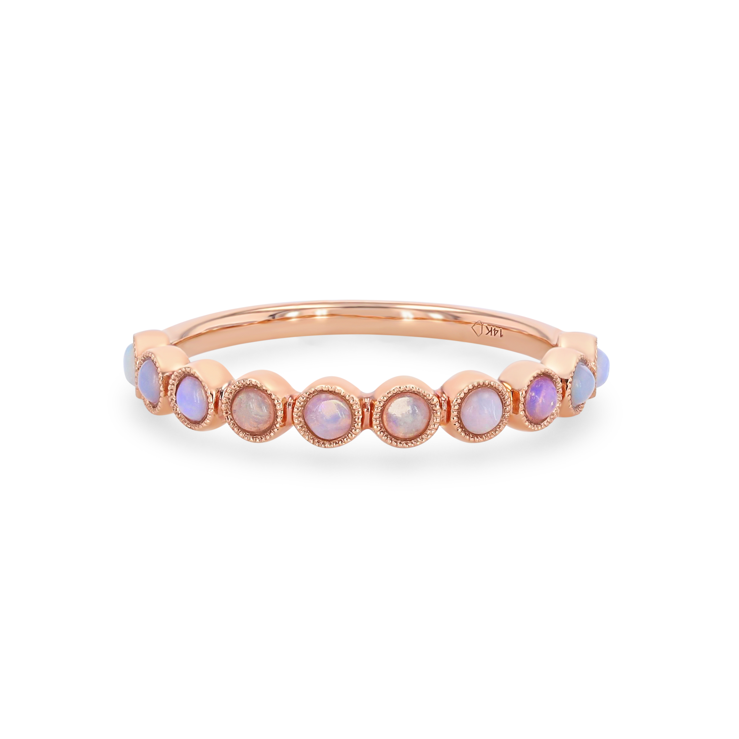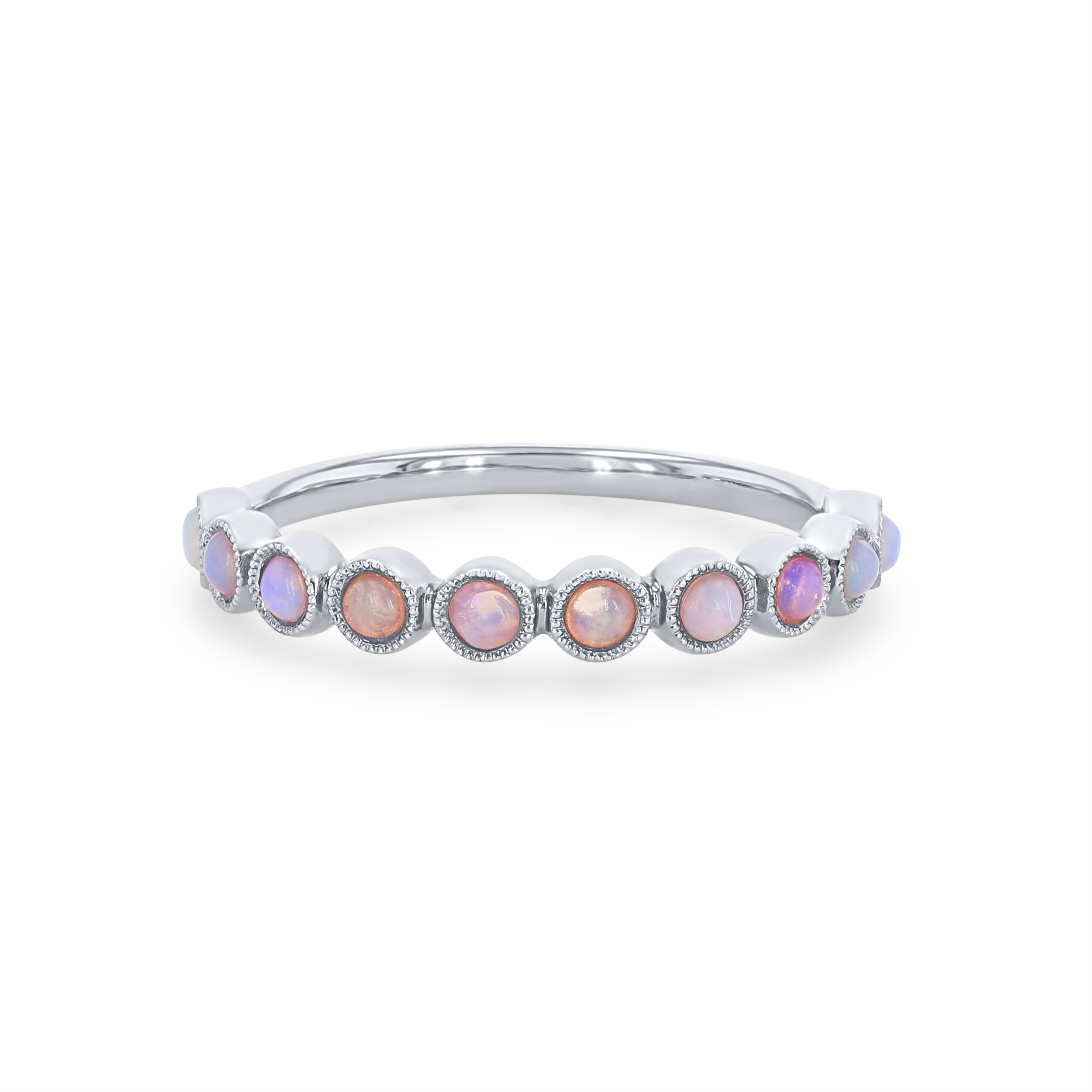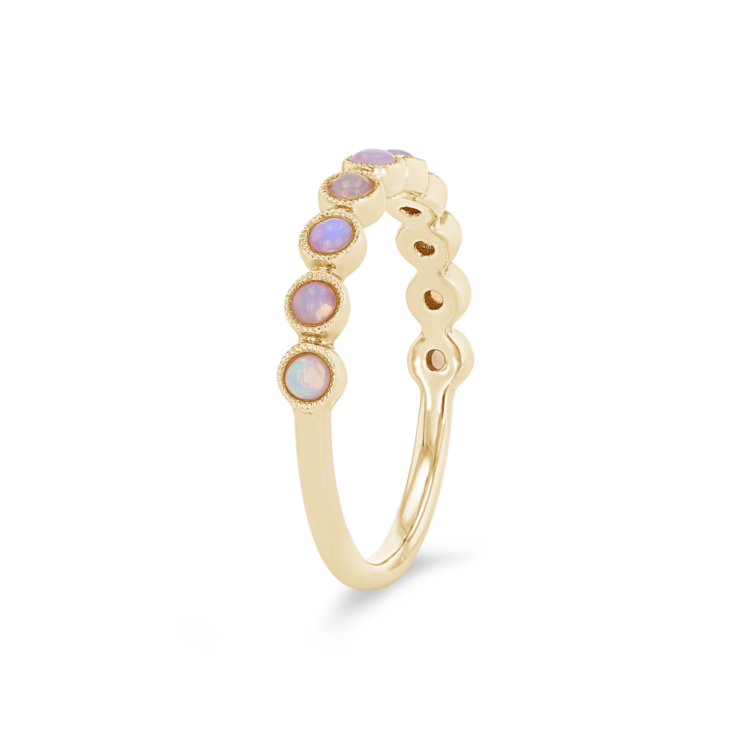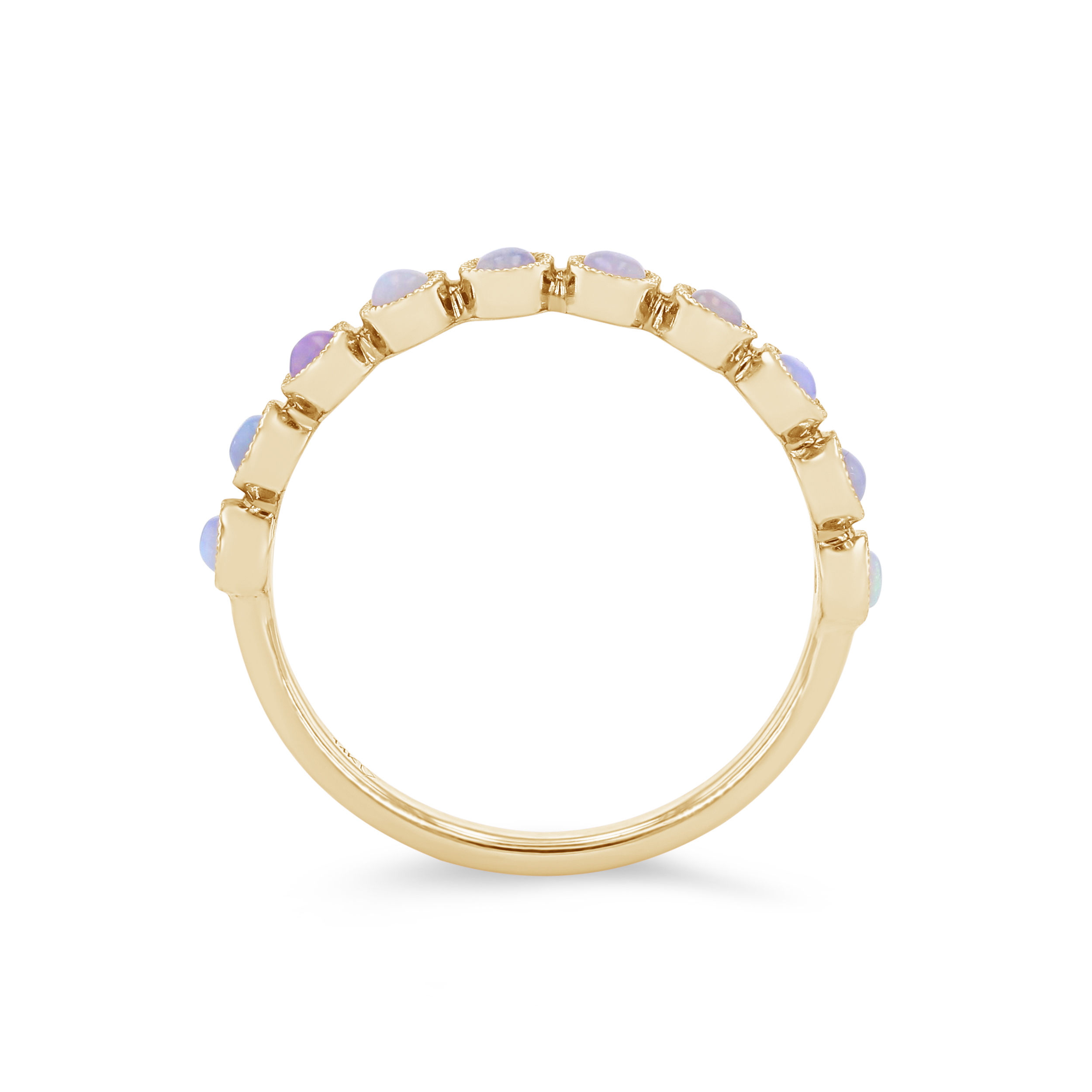 Luminous opals totaling 0.29 carats are surrounded by bezels of metal in this stunning vintage inspired wedding band.