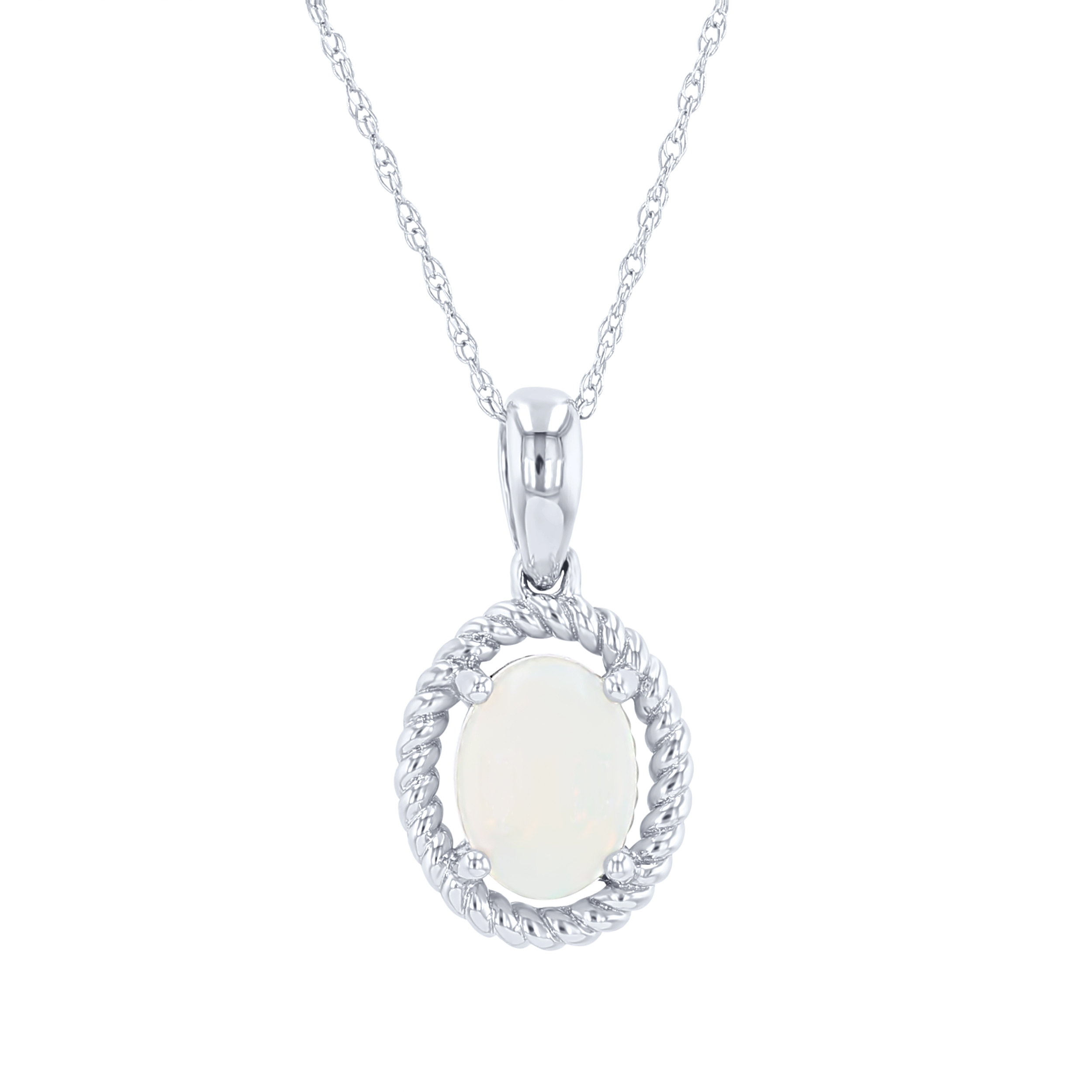 Product Description A beautiful opal weighing 0.78 carats is emphasized by a delicate rope style halo. Other Details Metal Color: White Gold Necklace Type: Fashion Total Gemstone Carat Weight: 0.78TW Style: Contemporary Gemstone Type: Opal Disable Reason: None Type: Necklace Pendant Type: Gemstone