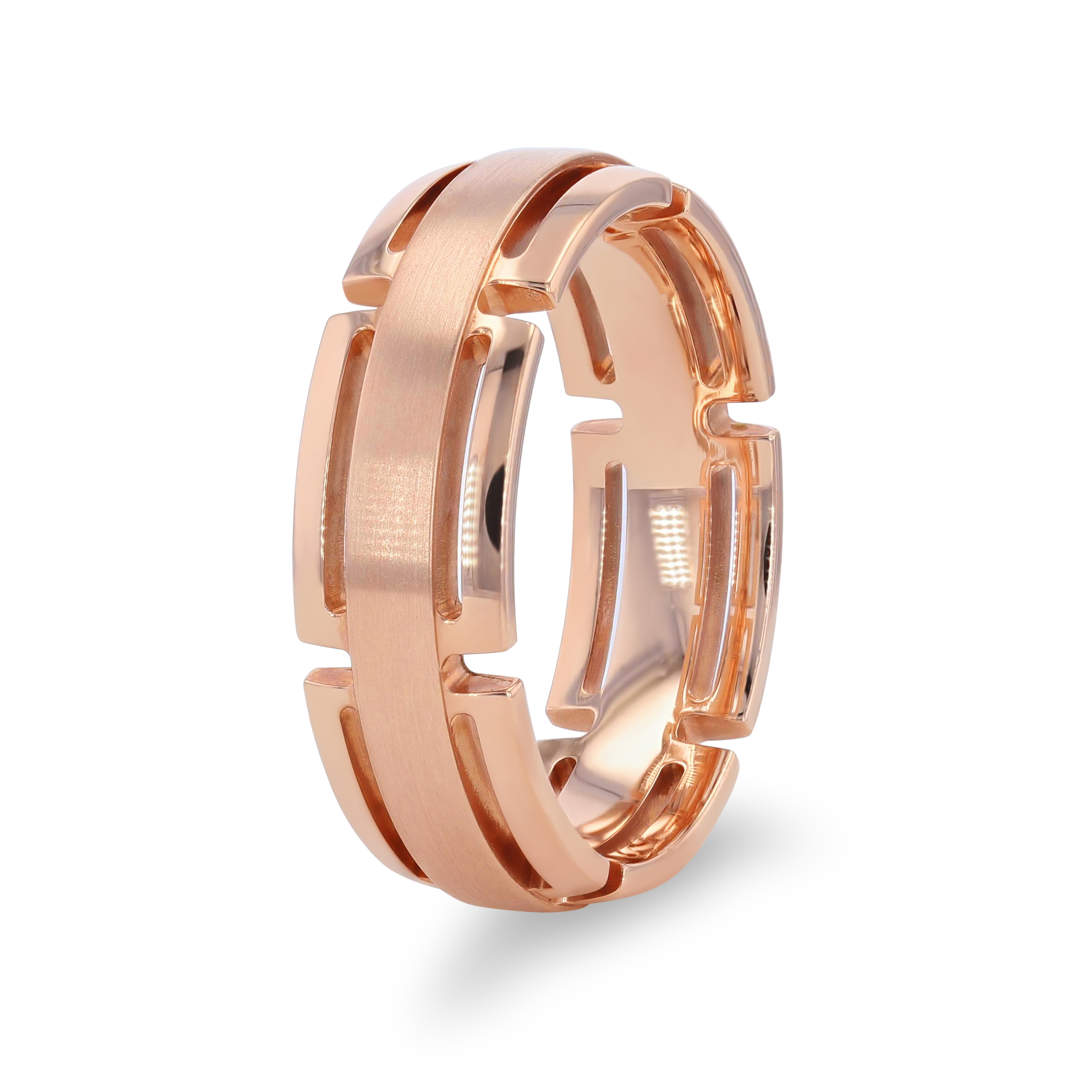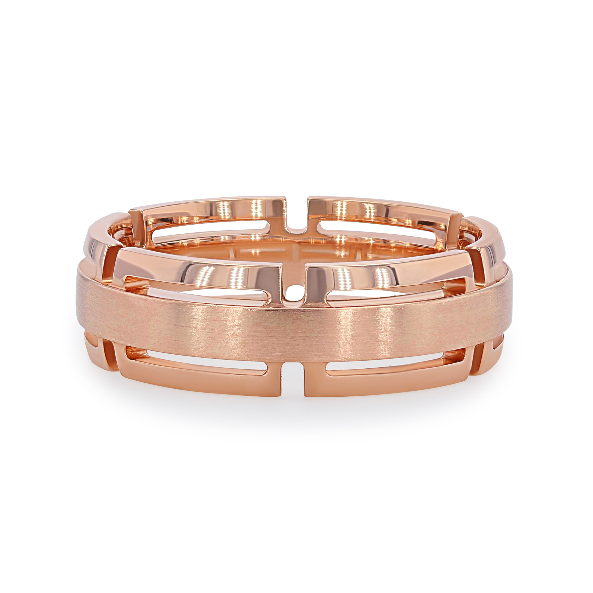 Product Description This modern wedding band features an open concept link design with a matte finish center, measuring seven millimeters wide. Other Details Men Wedding Band Type: Matte Gents Wedding Band Style: Contemporary GENTS WED BD TYPE 2: Carved Metal Color: White Gold Metal Color: Yellow Gold Disable Reason: None Metal Color: Two Tone Type: Gents Wedding Band Metal Color: Rose Gold