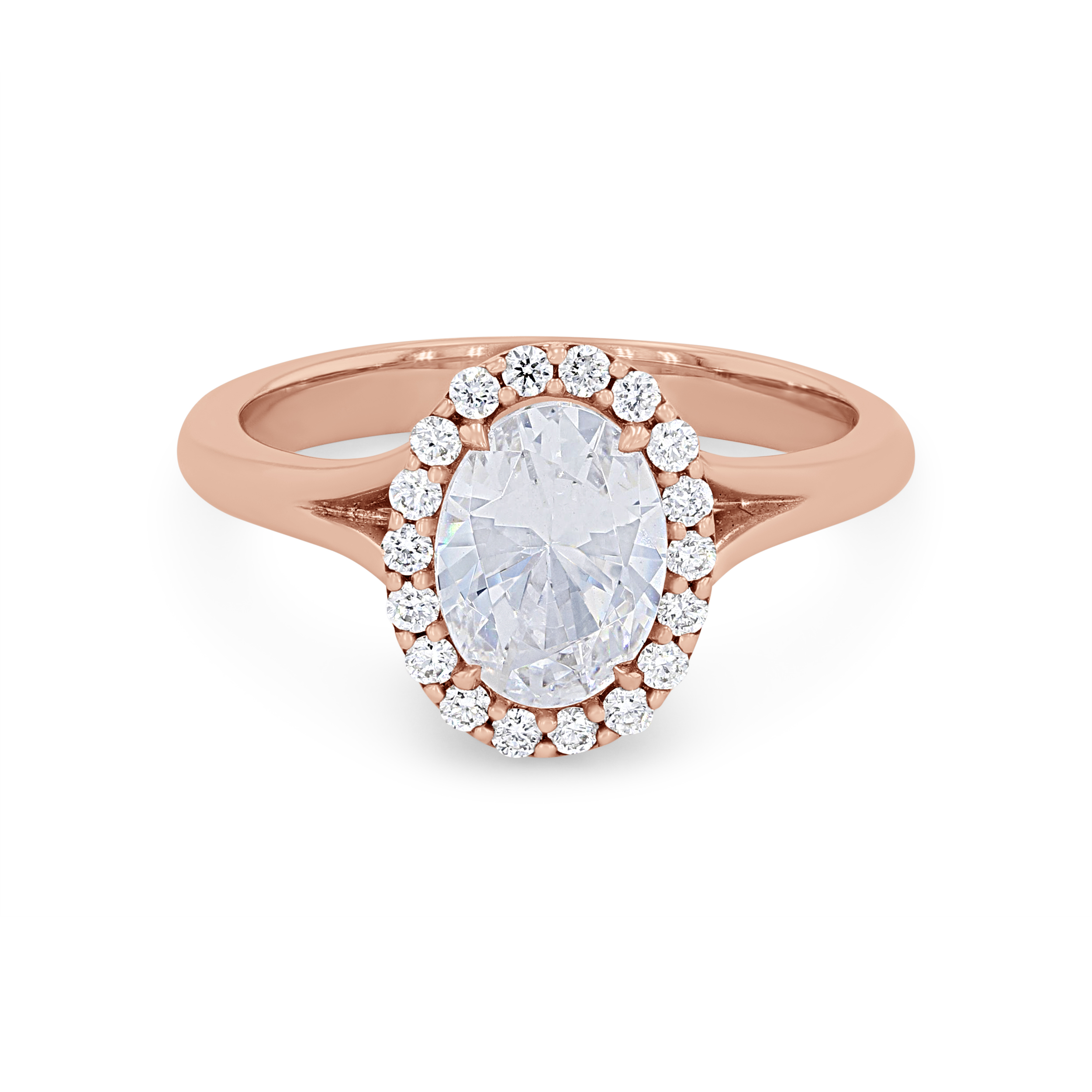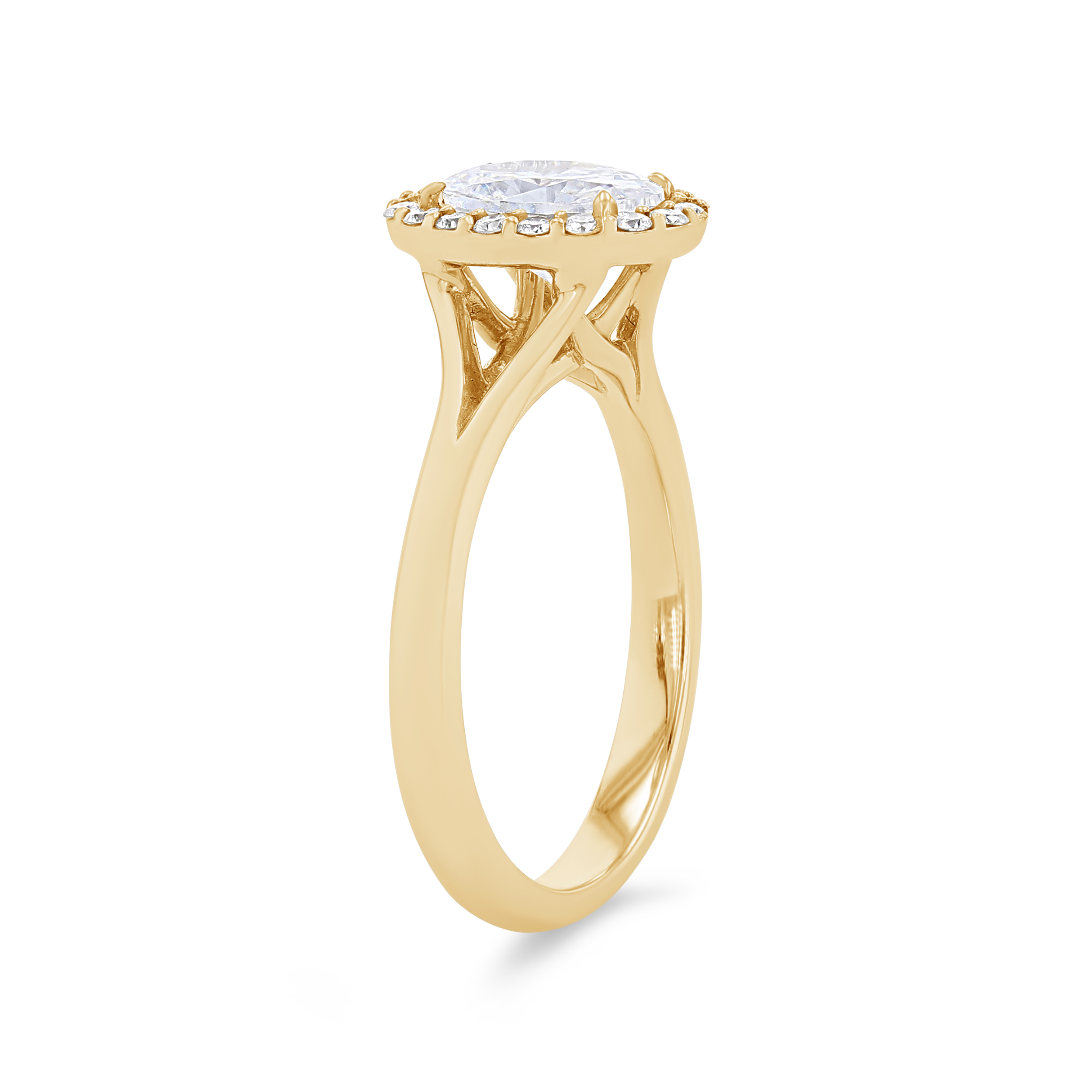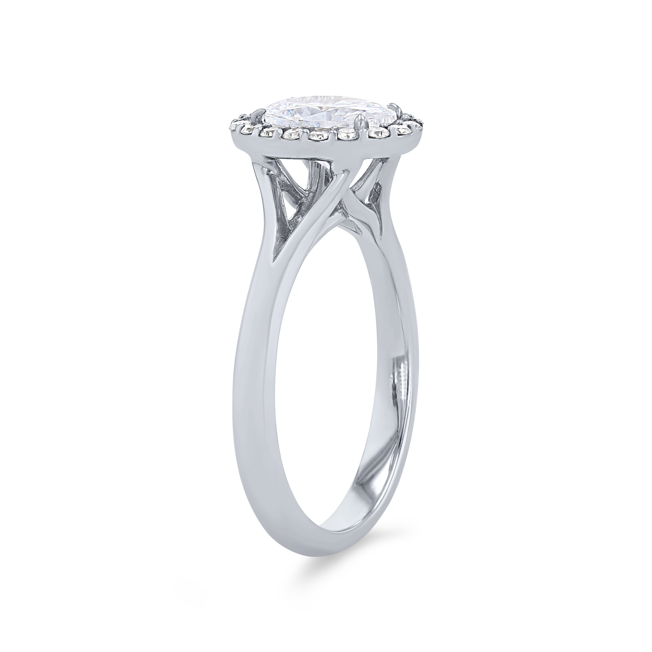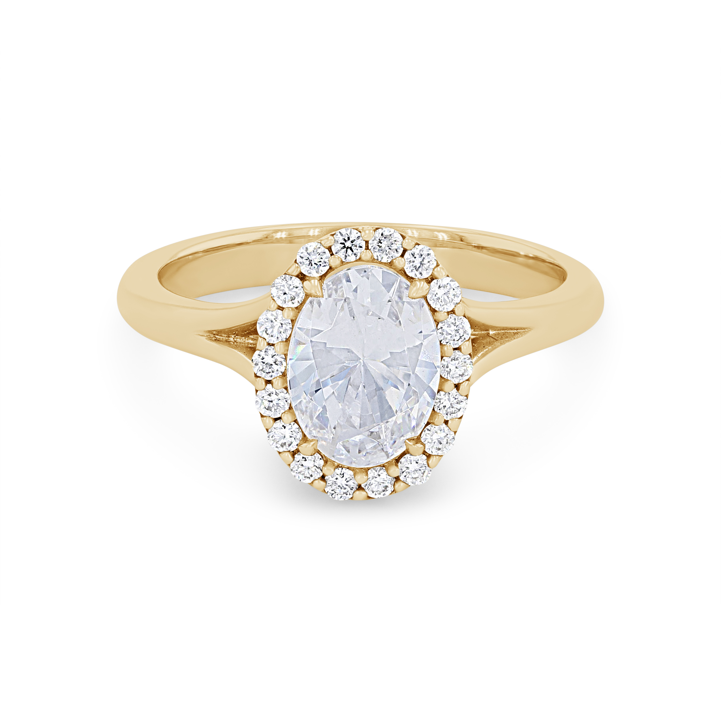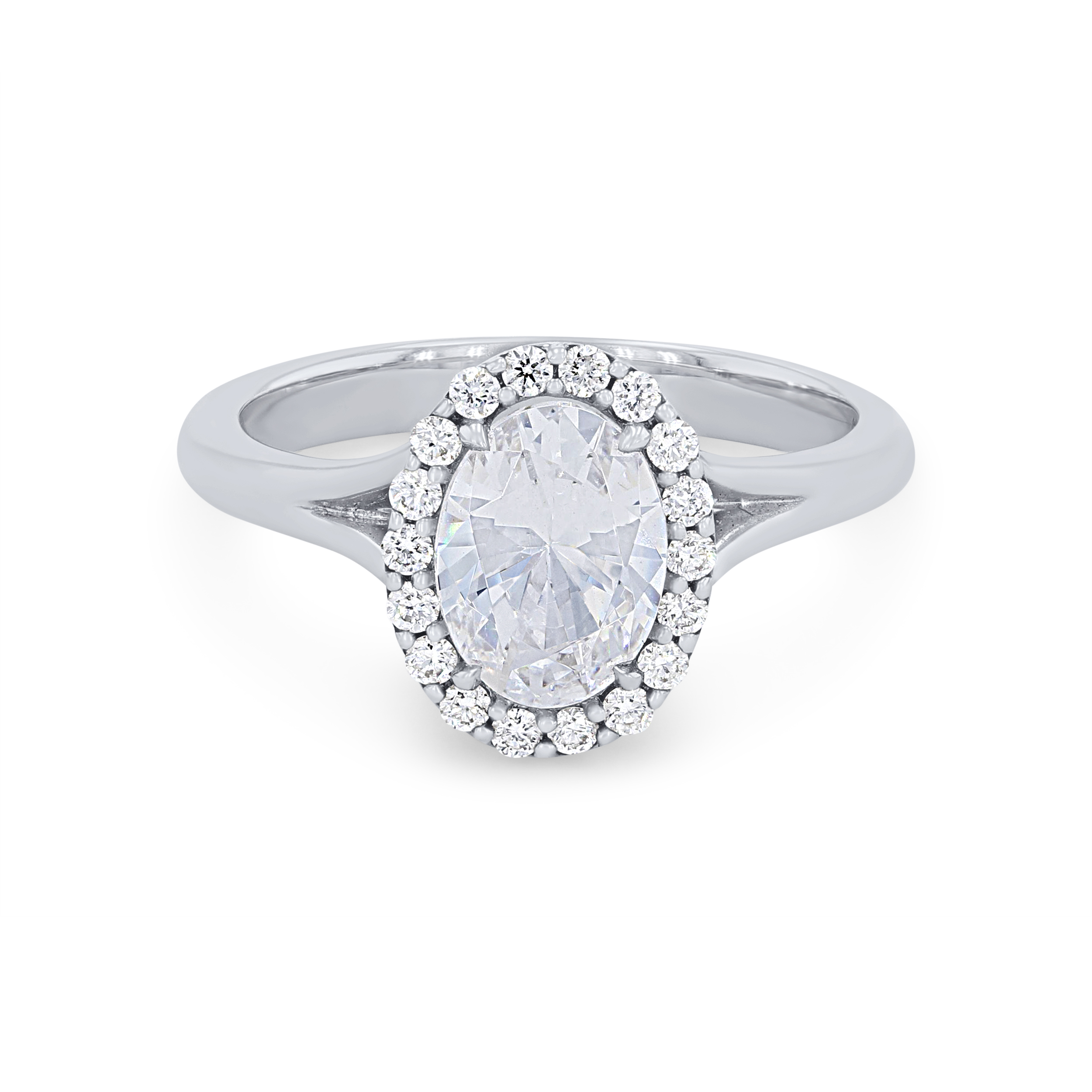 The oval halo featuring 0.18 carats of round brilliant cut diamonds contrasts beautifully with the high-polished split shank.