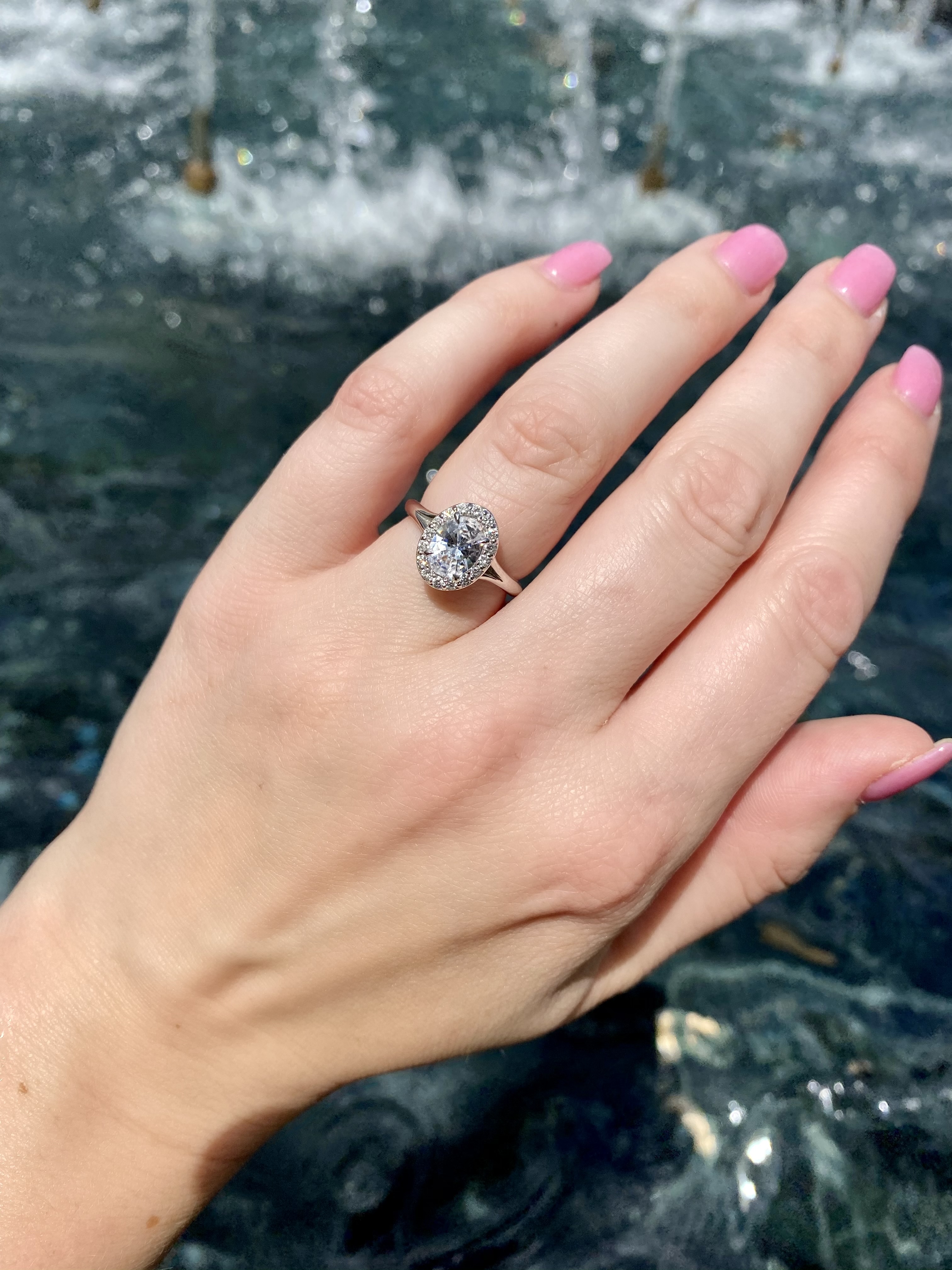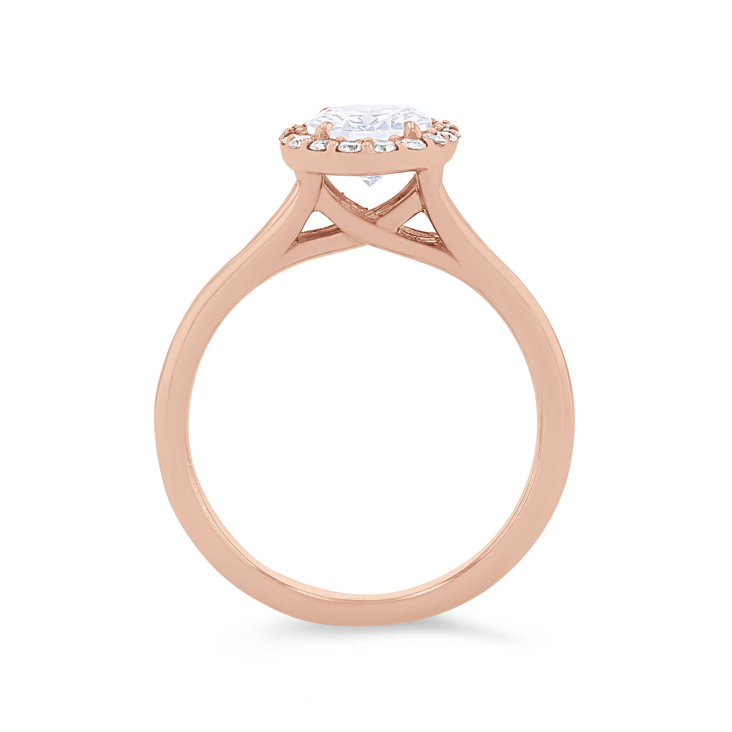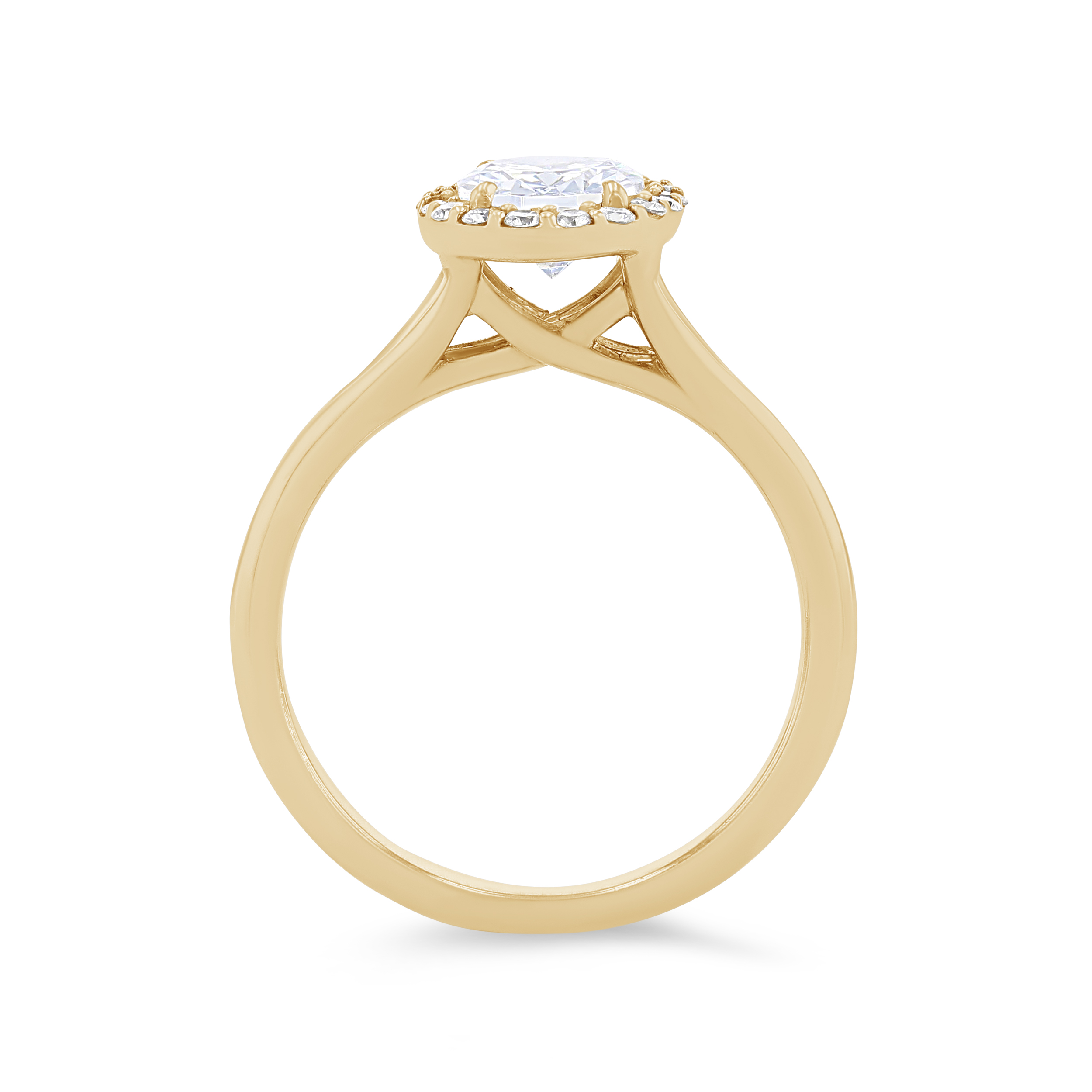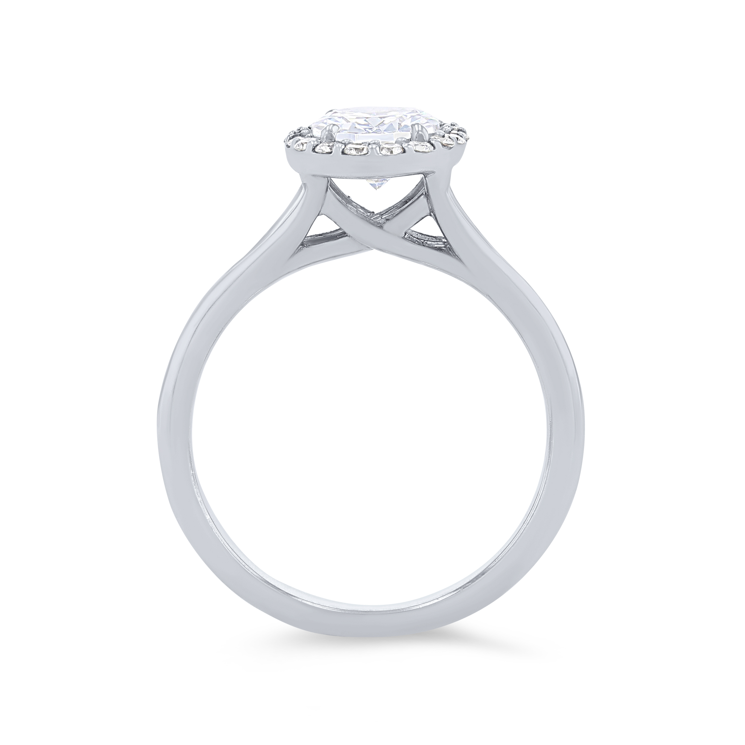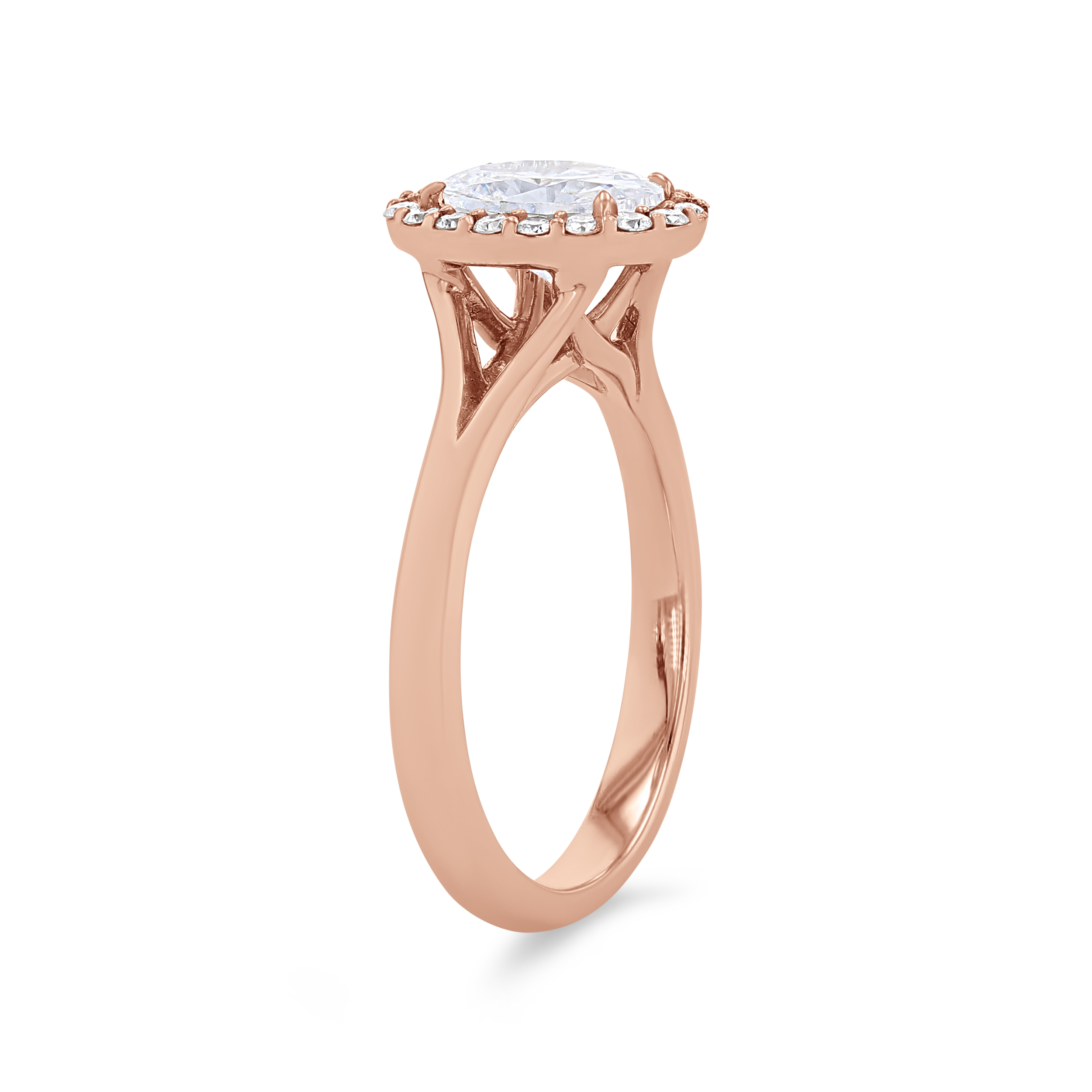 The oval halo featuring 0.18 carats of round brilliant cut diamonds contrasts beautifully with the high-polished split shank.