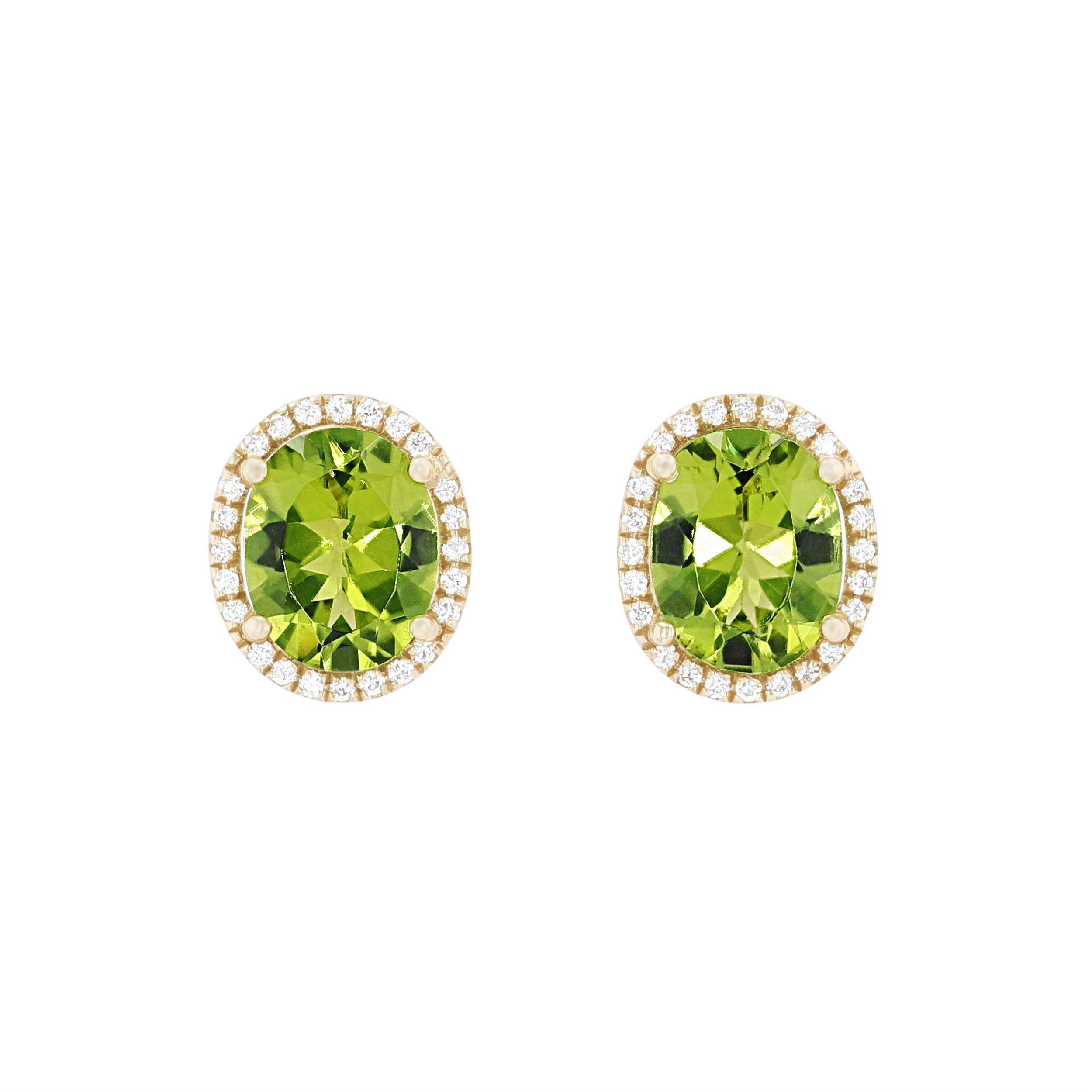 These striking stud earrings feature two oval cut peridots totaling 5.40 carats surrounded by halos of round brilliant cut diamonds totaling 0.35 carats.