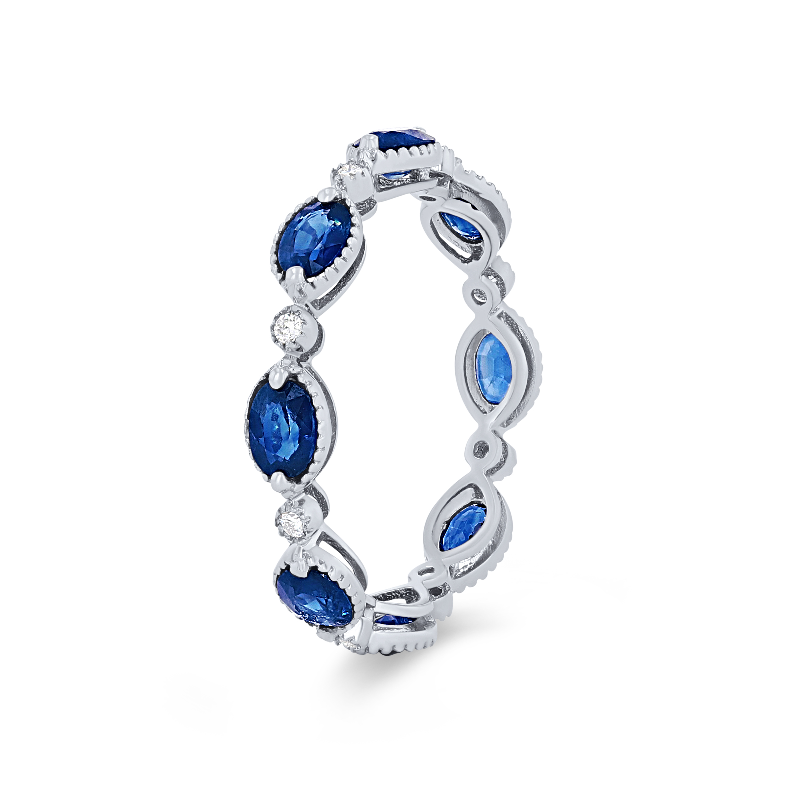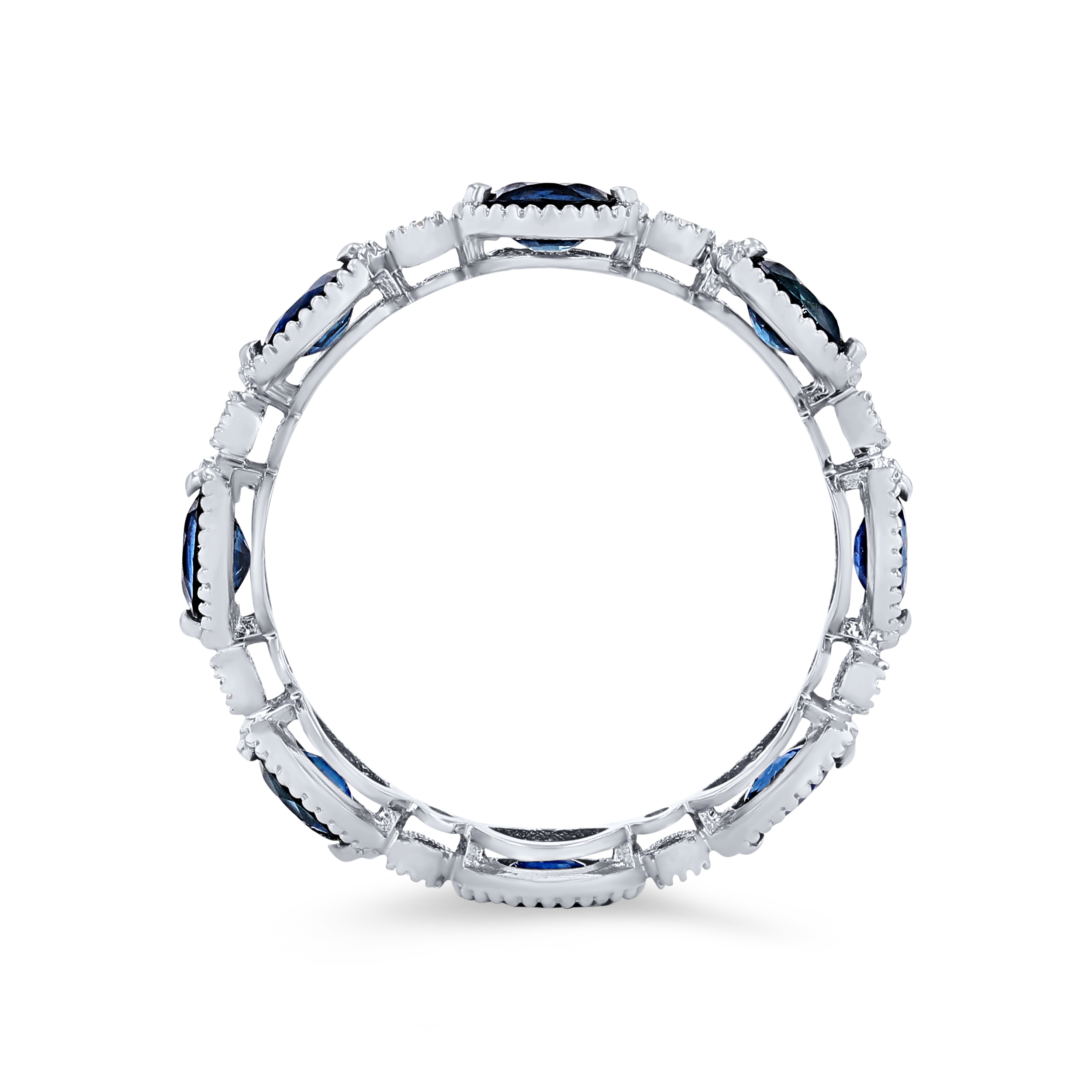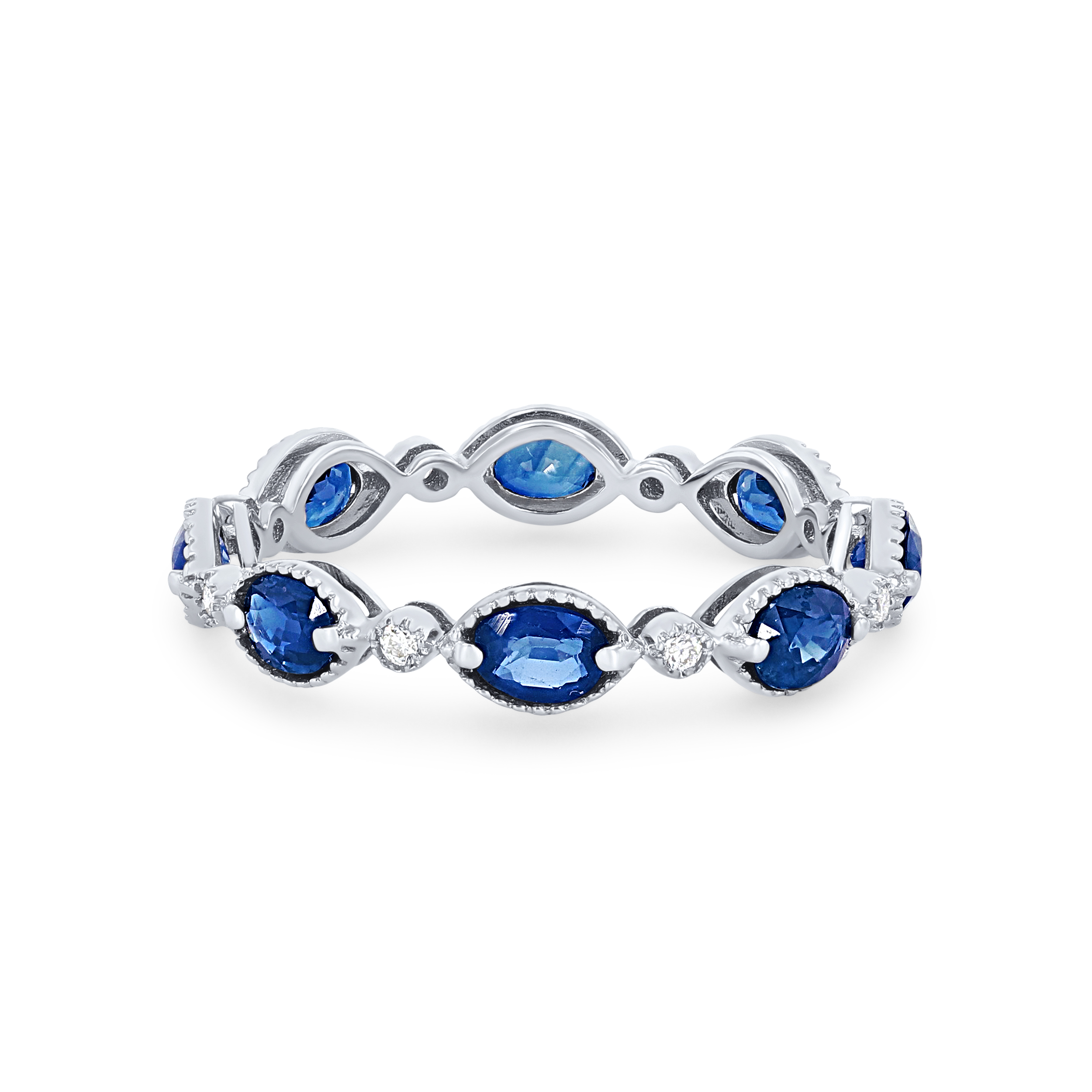 Product Description This gorgeous eternity band features oval cut blue sapphires totaling 2.00 surrounded by milgrain detail, accented with 0.08 carats of round brilliant cut diamonds. Other Details Total Gemstone Carat Weight: 2TW Women Wedding Band Type: Gemstone Disable Reason: None Wedding Band Type: Eternity Style: Vintage Metal Color: White Gold Type: Ladies Wedding Band Total Setting Diamond Carat Weight: 0.08TW Gemstone Type: Sapphire