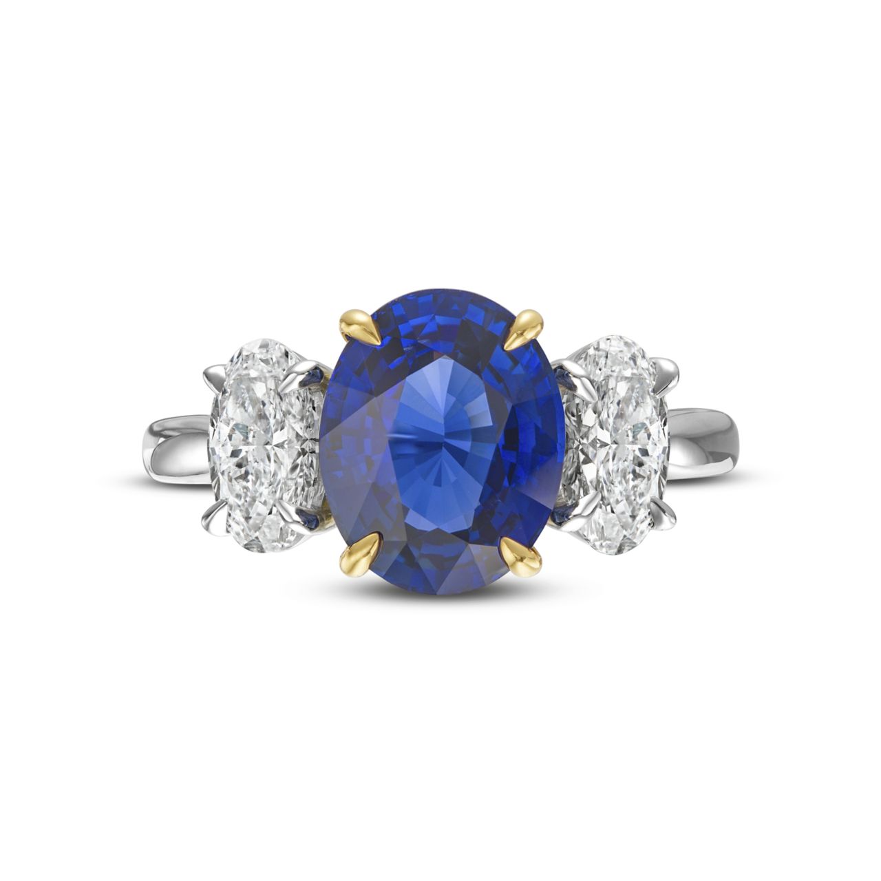 Elevate your style to new heights with the Oval Sapphire and Diamond Three Stone Ring. At the heart of this stunning creation lies a mesmerizing oval sapphire, captivating all with its rich, velvety blue hue. Flanking the sapphire are two oval cut diamonds, each GIA certified to attest to their exceptional quality and brilliance.