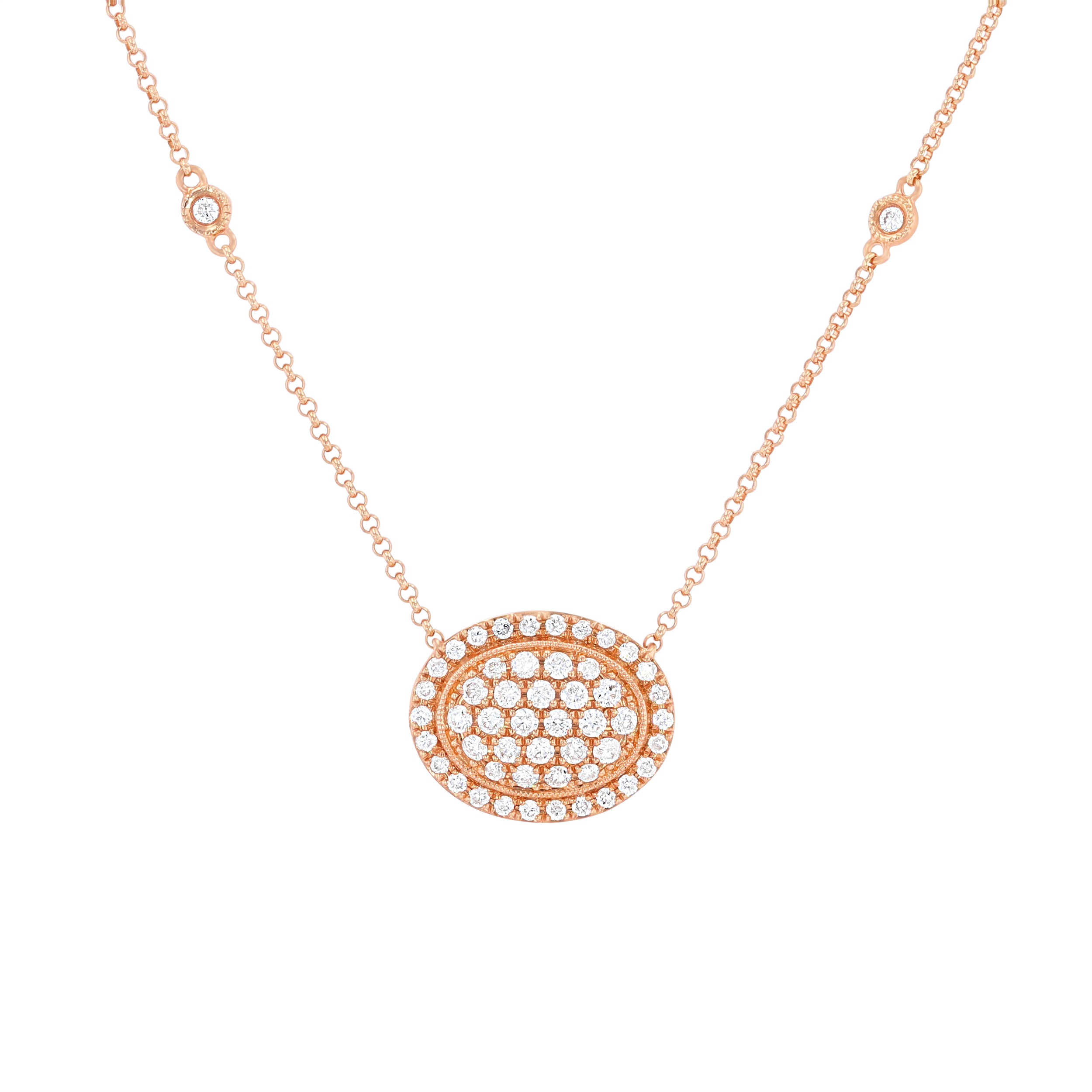 Product Description Perfect for layering or wearing solo this pendant features an oval-shaped pave design accented with 0.65 carats of round brilliant cut diamonds. Other Details Metal Color: White Gold Type: Necklace Total Setting Diamond Carat Weight: 0.65TW Style: Contemporary Length: 18 IN Metal Color: Yellow Gold Disable Reason: None Pendant Type: Station Necklace Type: Fashion Metal Color: Rose Gold Gemstone Type: Diamond