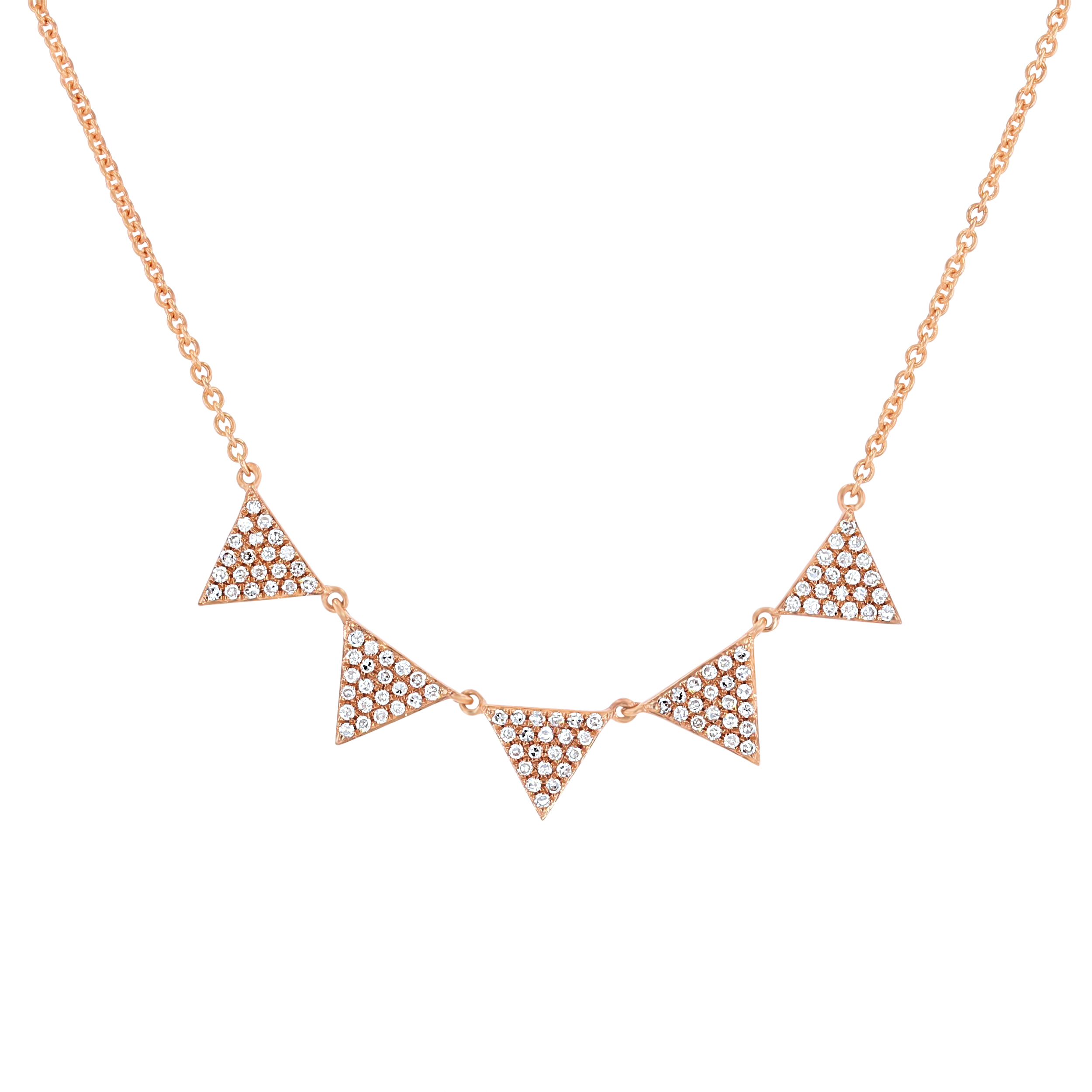 Product Description This playful pendant features five triangles accented with pave set round brilliant cut diamonds all totaling 0.32 carats. Other Details Necklace Type: Fashion Metal Color: White Gold Style: Contemporary Metal Color: Yellow Gold Disable Reason: None Gemstone Type: Diamond Pendant Type: Station Type: Necklace Metal Color: Rose Gold Total Setting Diamond Carat Weight: 0.32TW