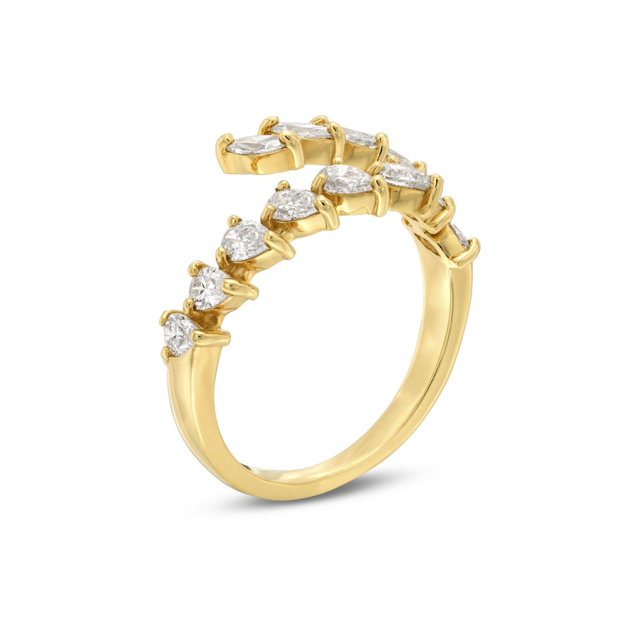 This striking ring features six pear shape and six marquise cut diamonds totaling 0.86 carats crafted in a bypass design.