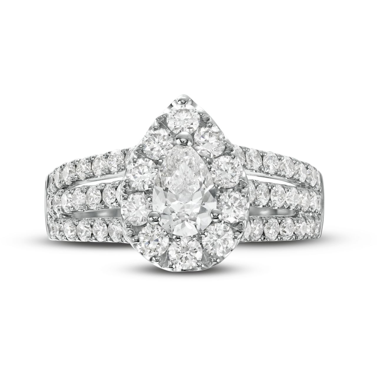 The Pear Diamond Halo Three Row Engagement Ring features a stunning pear shape diamond as its centerpiece. Surrounding it is a mesmerizing halo of meticulously set accent diamonds. This halo not only enhances the center stone's brilliance but also creates an eye-catching display of light and shimmer.