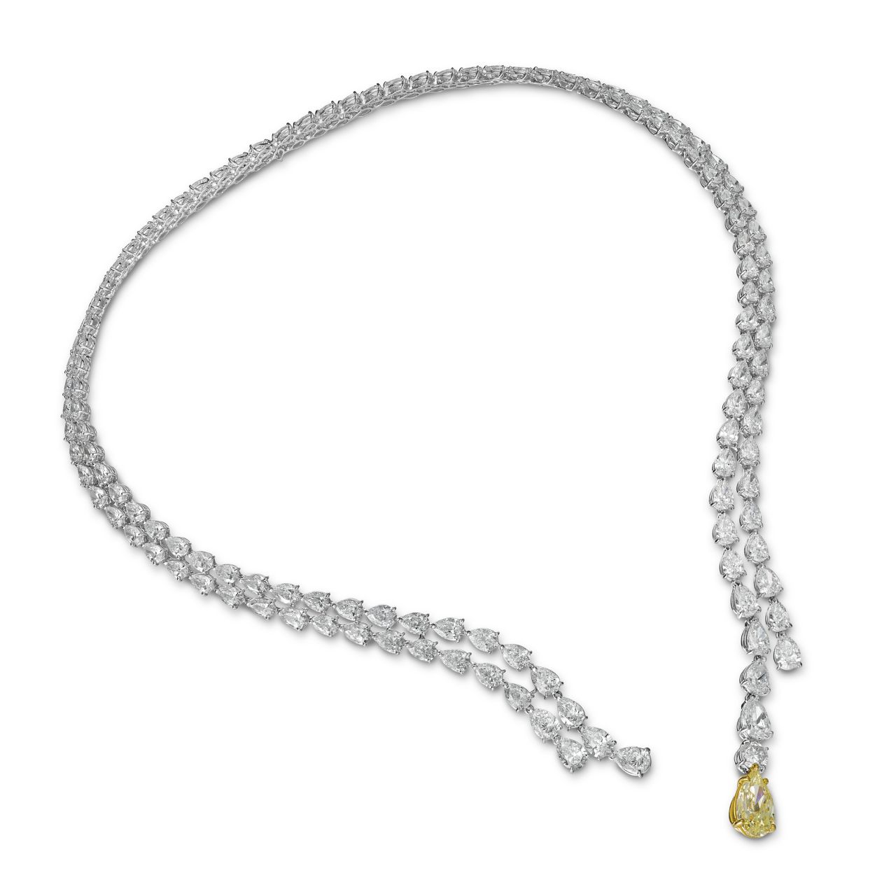 The unparalleled Pear Shape Diamond Collar Necklace transcends all expectations of elegance and grandeur. At the core of this resplendent creation lies a single, majestic fancy yellow pear shape diamond. Draping around the collar design are two rows of pear shape diamonds, creating a lasting impression and symbolizing the very essence of pure extravagance.