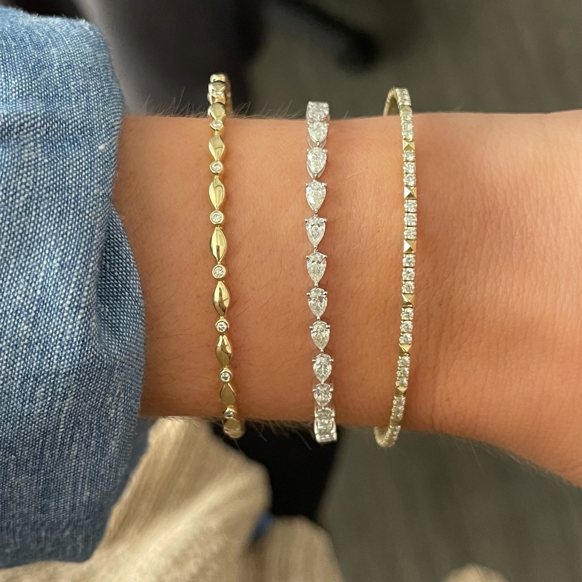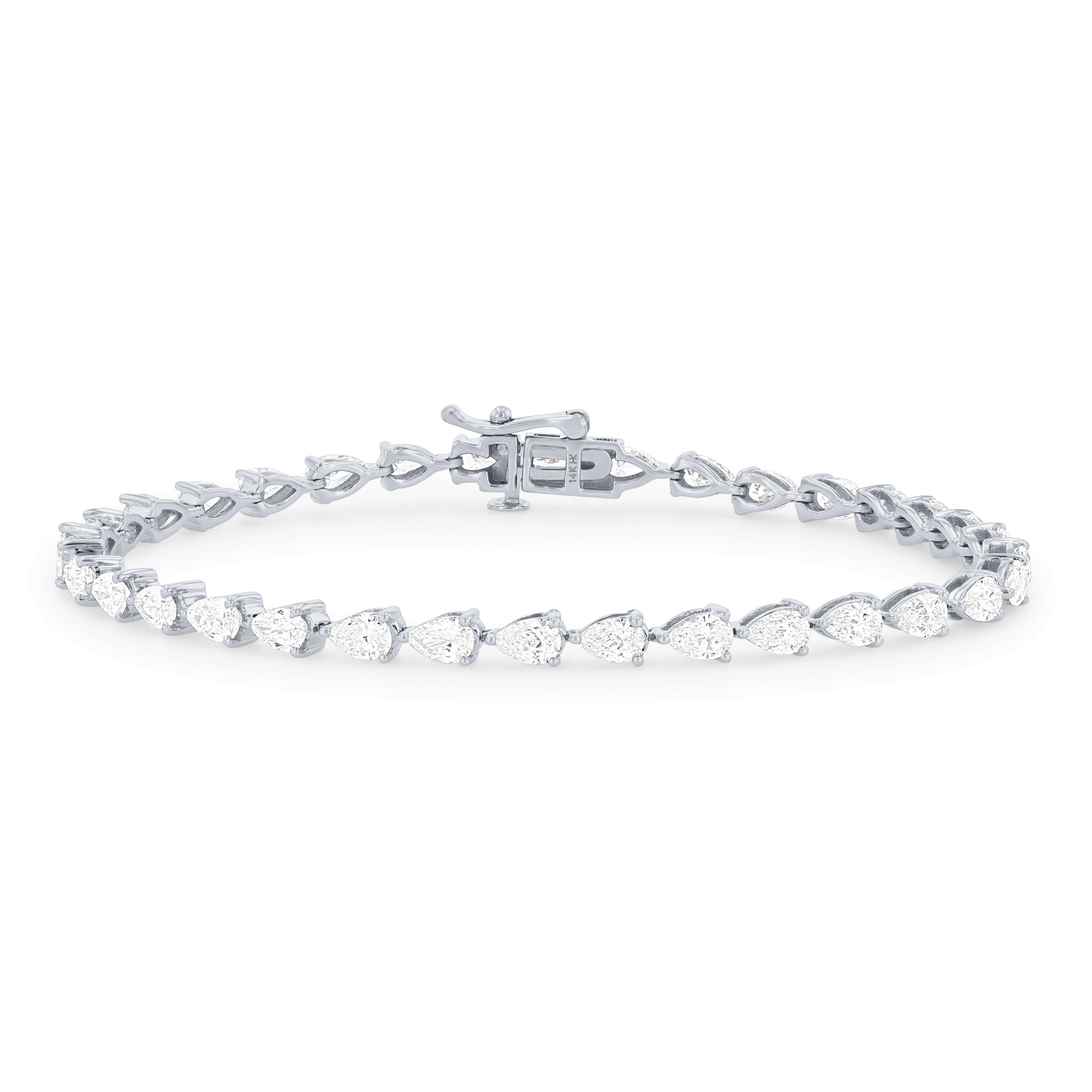 Product Description Delicately crafted, this stunning seven inch tennis bracelet features 34 pear shape diamonds totaling 4.50 carats. Each diamond weighs 0.13 carats. Other Details Metal Color: White Gold Style: Classic Bracelet Type: Tennis Bracelets Total Setting Diamond Carat Weight: 4.5TW Average clarity range: SI2 Tennis Bracelet Type: Distinctive Tennis Bracelet Disable Reason: None Type: Bracelet Gemstone Type: Diamond Average color range: J