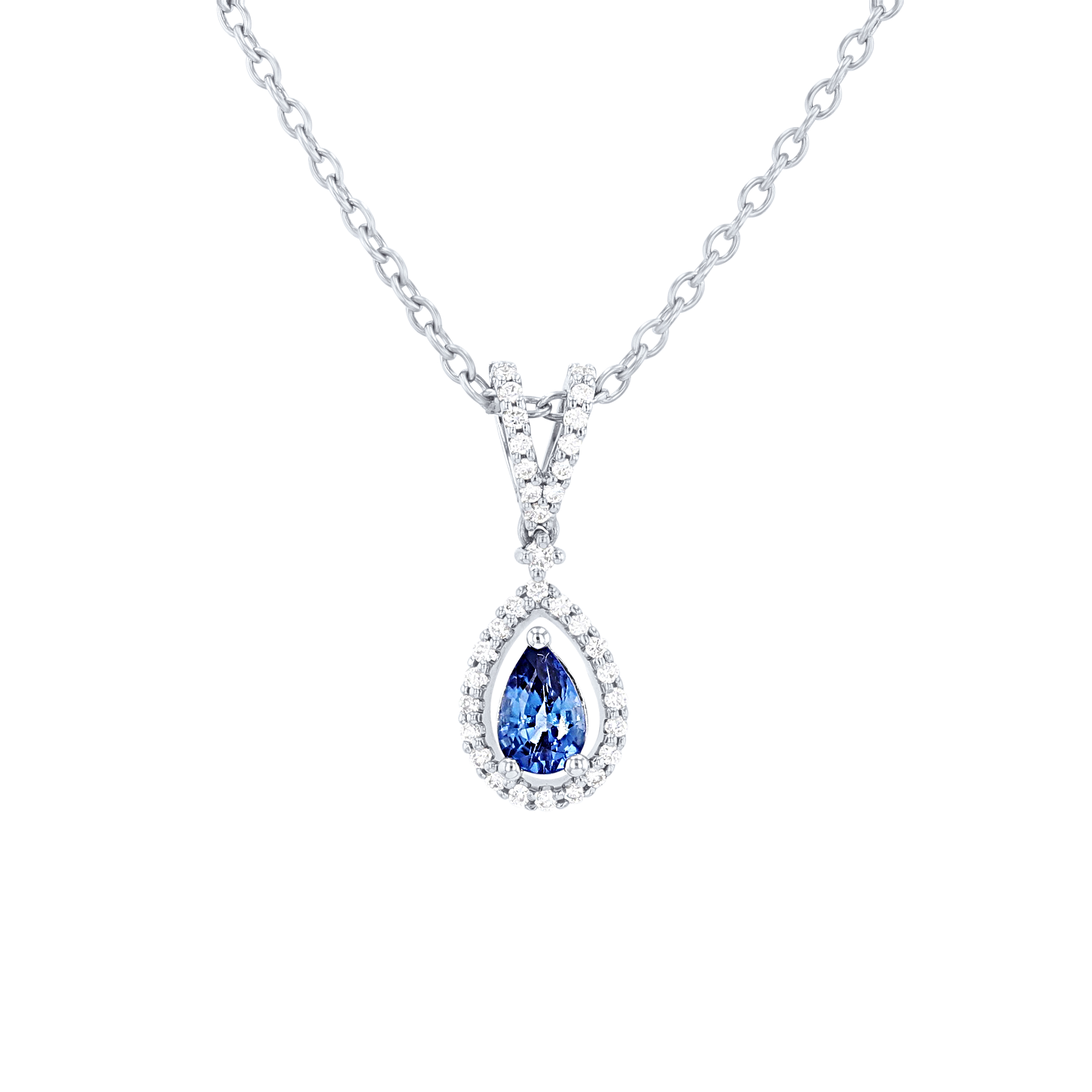 Product Description A beautiful pear shape blue sapphire weighing 0.50 carats appears to float within the halo of round brilliant cut diamonds, all totaling 0.19 carats. Other Details Metal Color: White Gold Total Gemstone Carat Weight: 0.5TW Length: 18 IN Pendant Type: Gemstone Gemstone Type: Sapphire Disable Reason: None Total Setting Diamond Carat Weight: 0.19TW Necklace Type: Fashion Type: Necklace Style: Classic