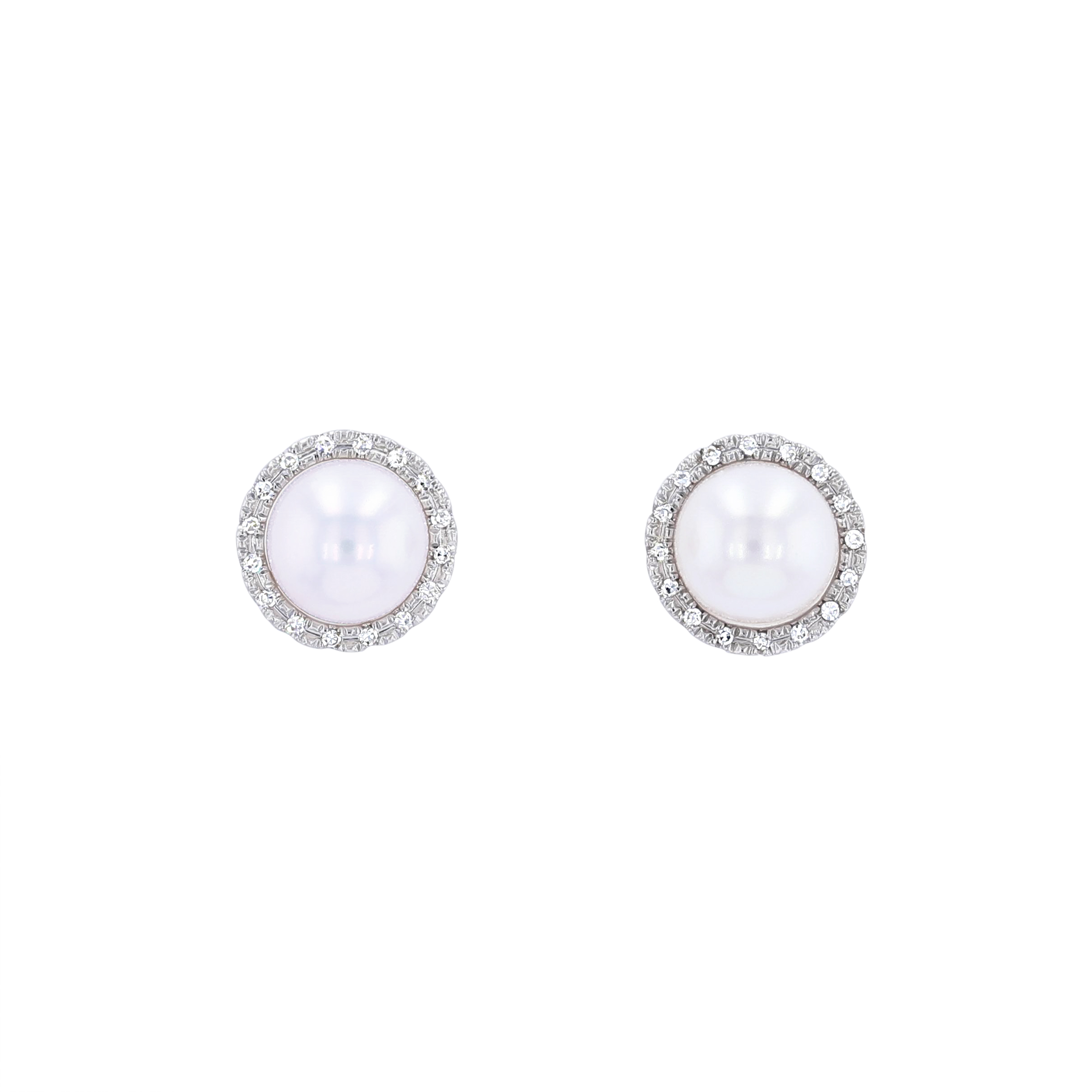 Product Description A beautiful classic, these stud earrings feature two pearls measuring 6.5-7.0 millimeters surrounded by halos of round brilliant cut diamonds totaling 0.10 carats. Other Details Earring Type: Gemstones Type: Earrings Style: Classic Metal Color: White Gold Women Wedding Band Type: Gemstone Total Setting Diamond Carat Weight: 0.1TW Disable Reason: None Gemstone Type: Pearl