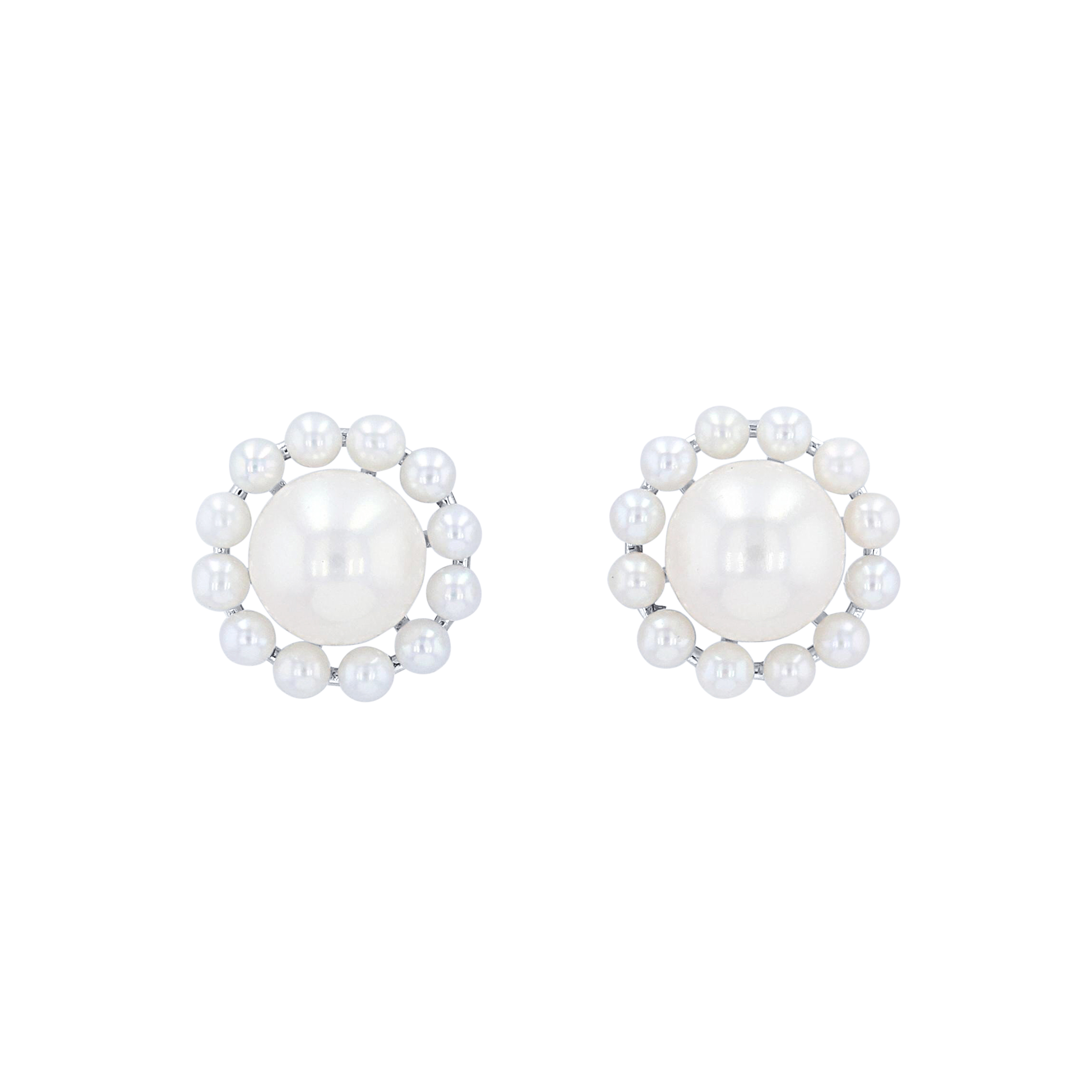 Product Description These unique stud earrings feature two center freshwater pearls surrounded by halos of smaller pearls. Other Details Gemstone Type: Pearl Style: Contemporary Earring Type: Gemstones Women Wedding Band Type: Gemstone Disable Reason: None Metal Color: White Gold Type: Earrings