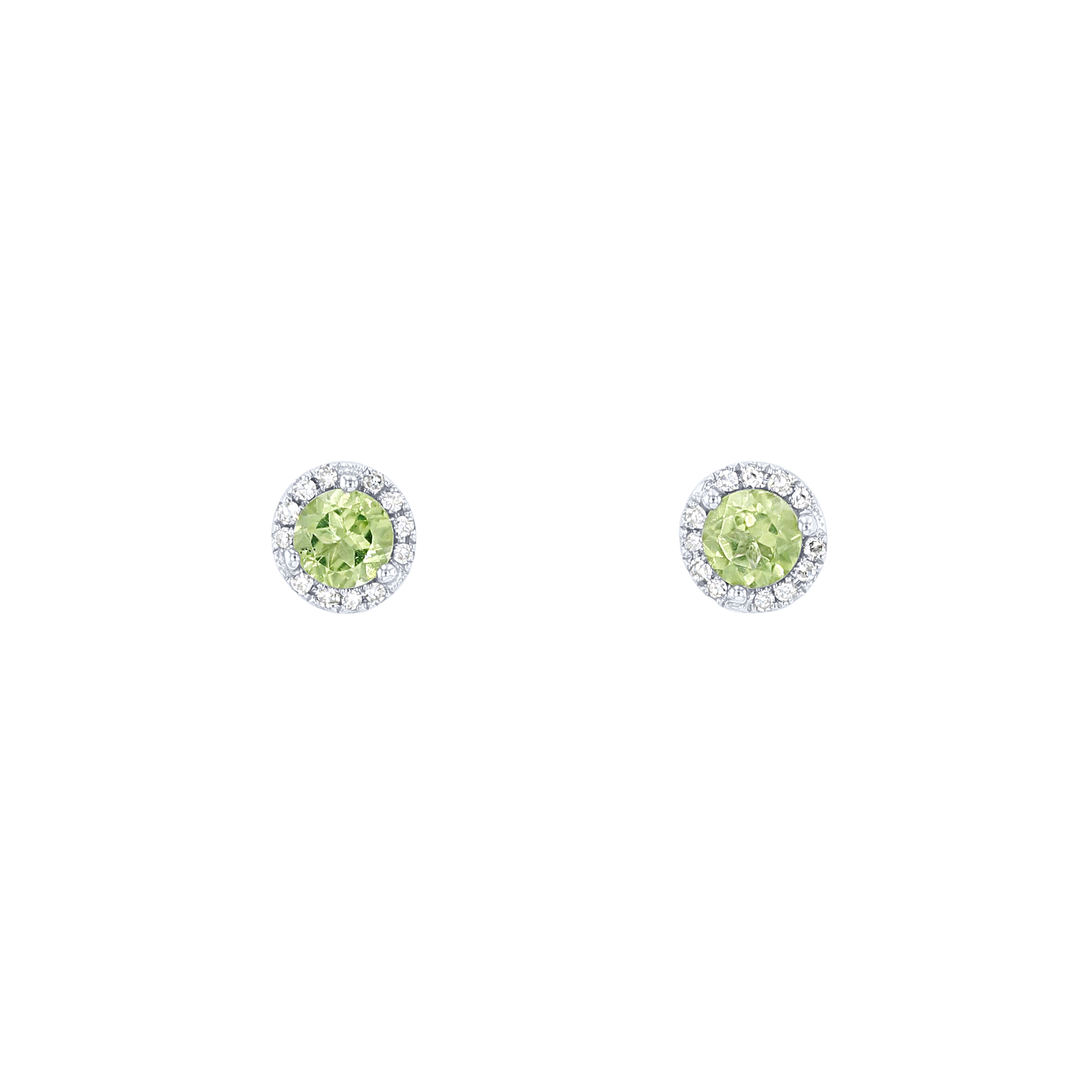 Two round cut peridots totaling 0.51 carats are surrounded by halos of round brilliant cut diamonds totaling 0.10 carats.