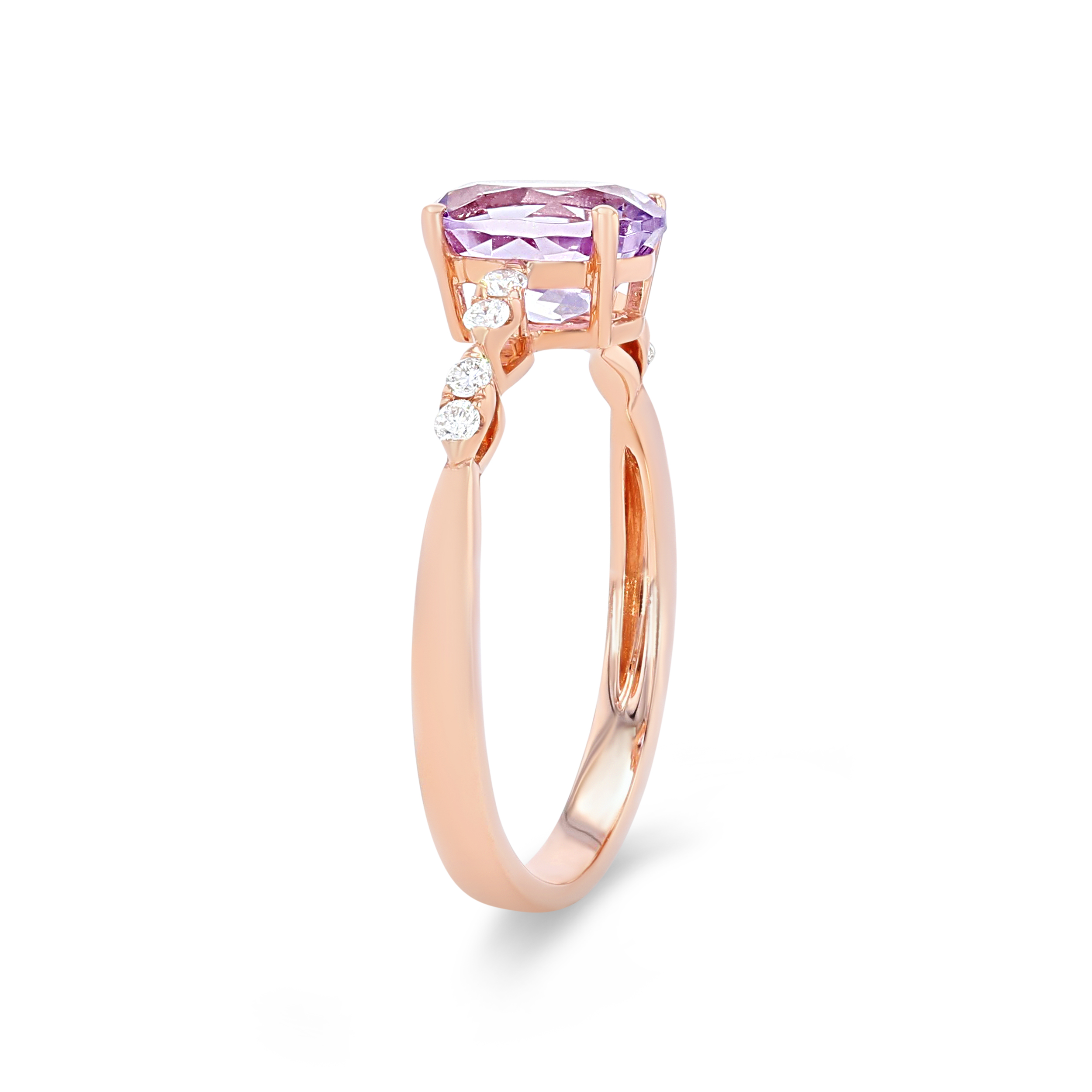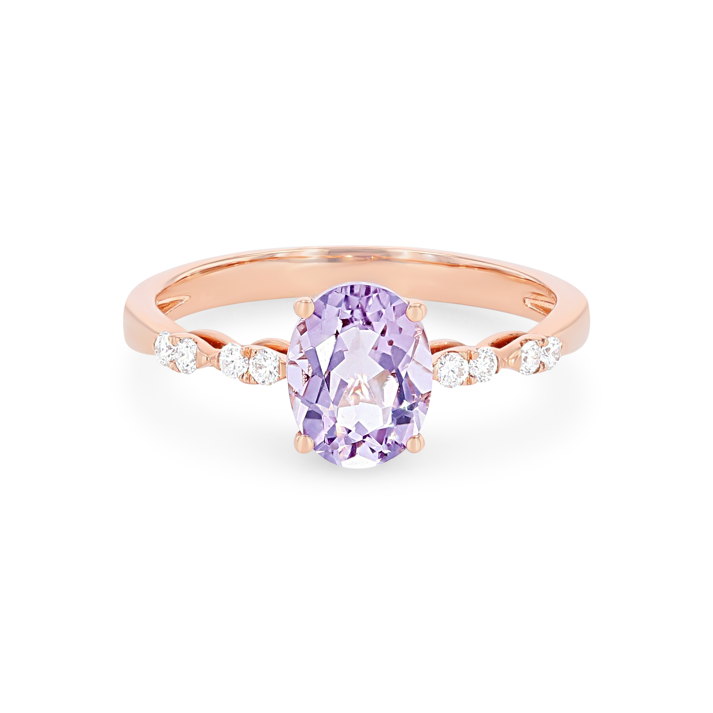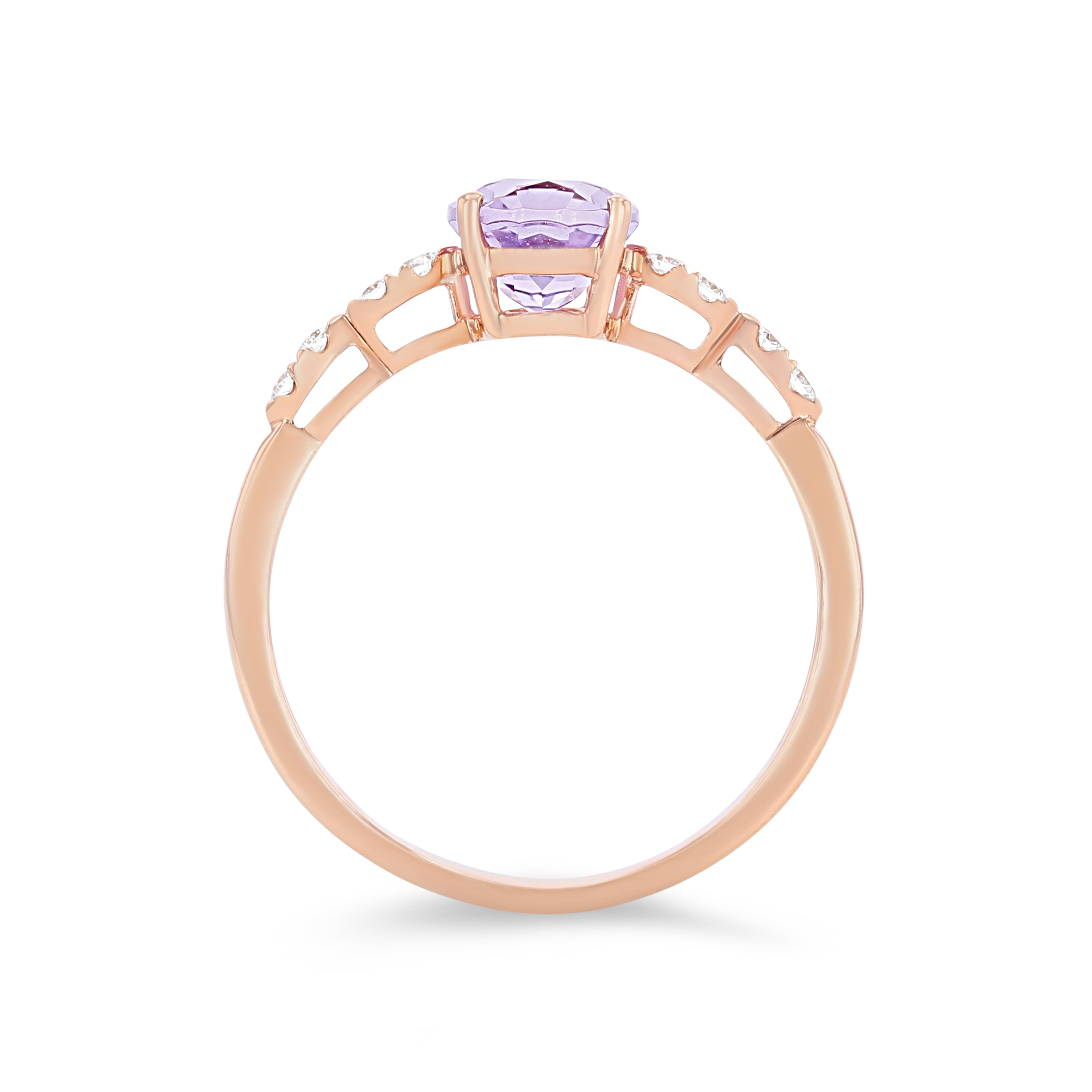 Product Description Crafted in a scalloped design, this ring features an oval cut pink amethyst weighing 1.30 carats accented with 0.14 carats of round brilliant cut diamonds. Other Details Type: Ring Metal Color: Rose Gold Women Wedding Band Type: Gemstone Gemstone Type: Amethyst Total Setting Diamond Carat Weight: 0.14TW Style: Contemporary Total Gemstone Carat Weight: 1.3TW Disable Reason: None