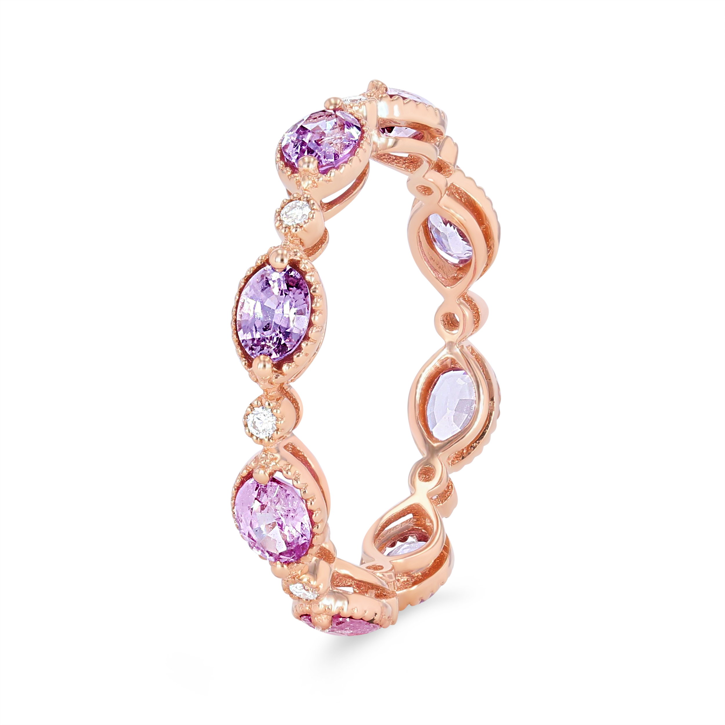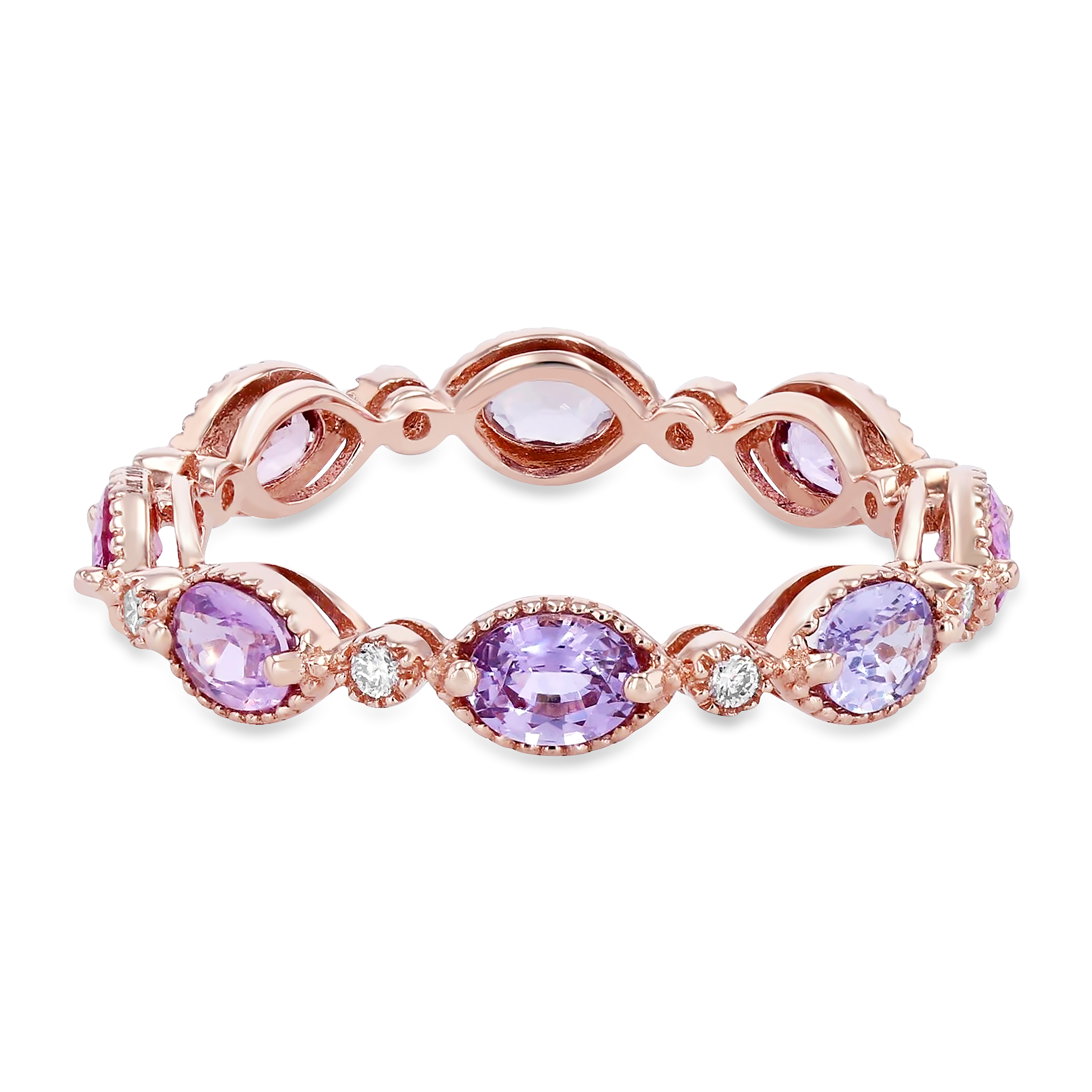 Product Description Beautiful colors create this striking eternity band, featuring pink and purple sapphires totaling 1.75 carats alternating with round brilliant cut diamonds totaling 0.08 carats. Other Details Gemstone Type: Sapphire Disable Reason: None Total Setting Diamond Carat Weight: 0.08TW Style: Vintage Wedding Band Type: Fancy Shapes Type: Ladies Wedding Band Total Gemstone Carat Weight: 1.75TW Women Wedding Band Type: Gemstone Metal Color: Rose Gold Diamond: Eternity