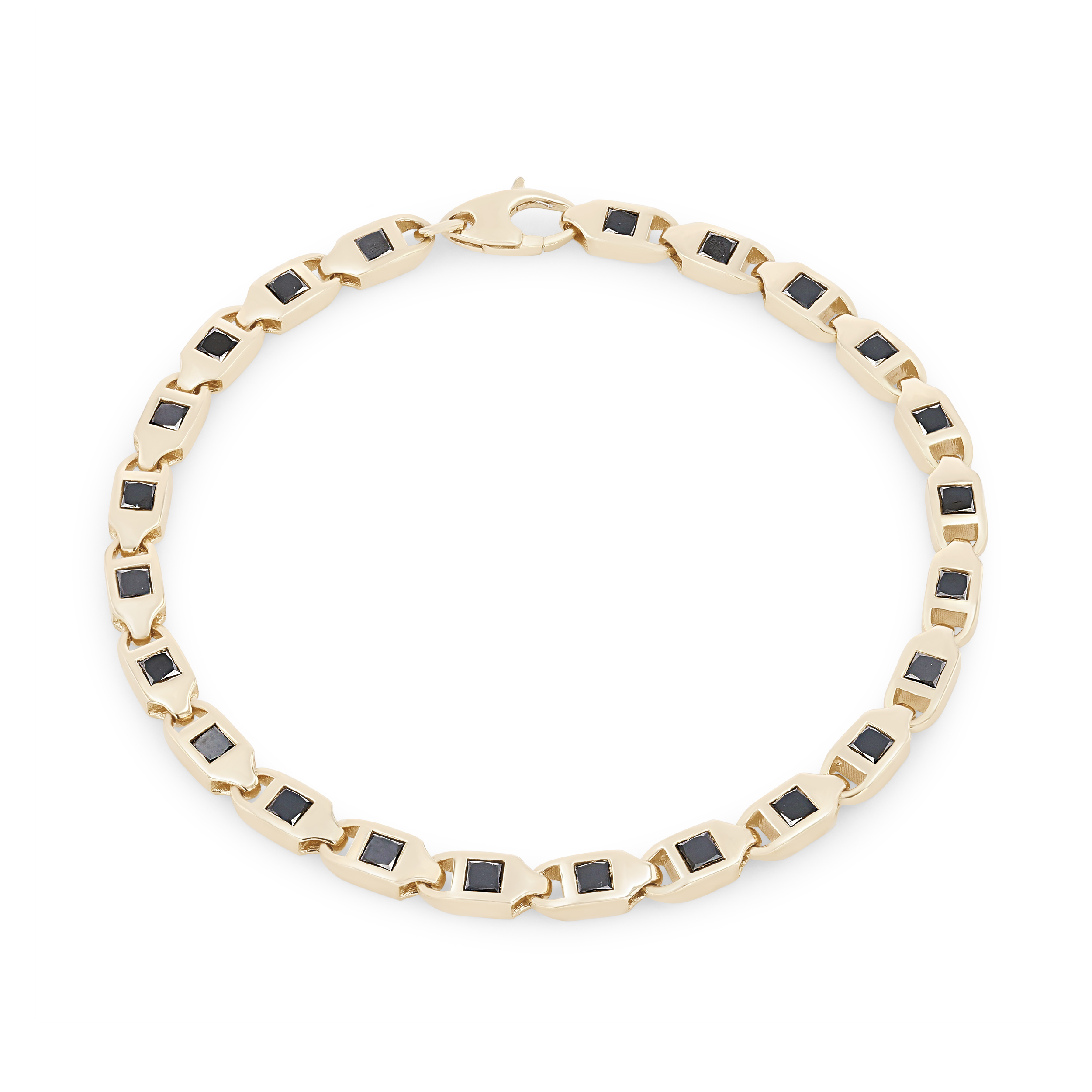 Product Description Crafted with a heavy gold bezel setting, this bracelet features 23 princess cut black diamonds totaling 5.62 carats. It measures 8.5 inches. Other Details Style: Contemporary Length: 8.5 IN Gemstone Type: Diamond Type: Gents Bracelet Metal Color: Yellow Gold Disable Reason: None Total Setting Diamond Carat Weight: 5.62TW