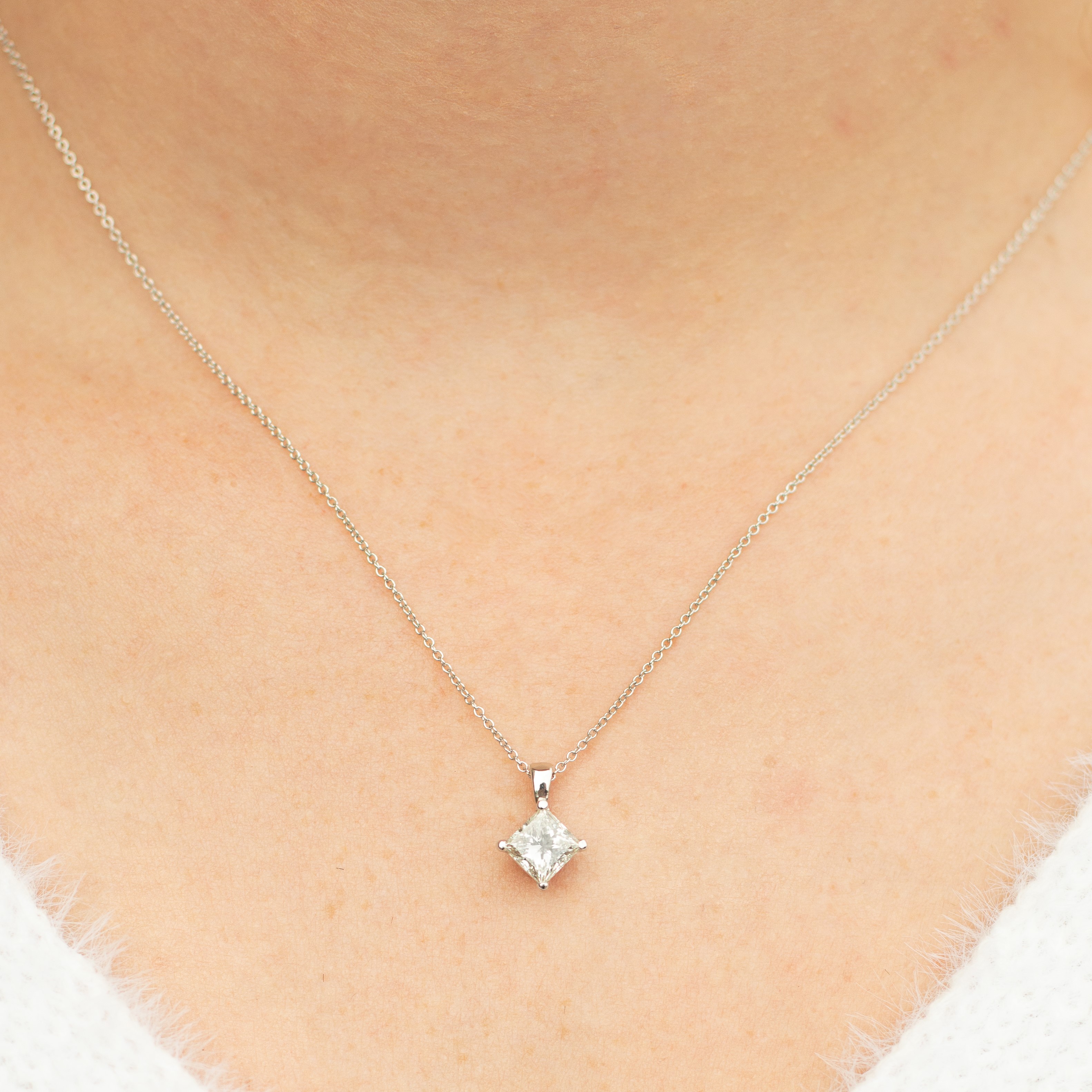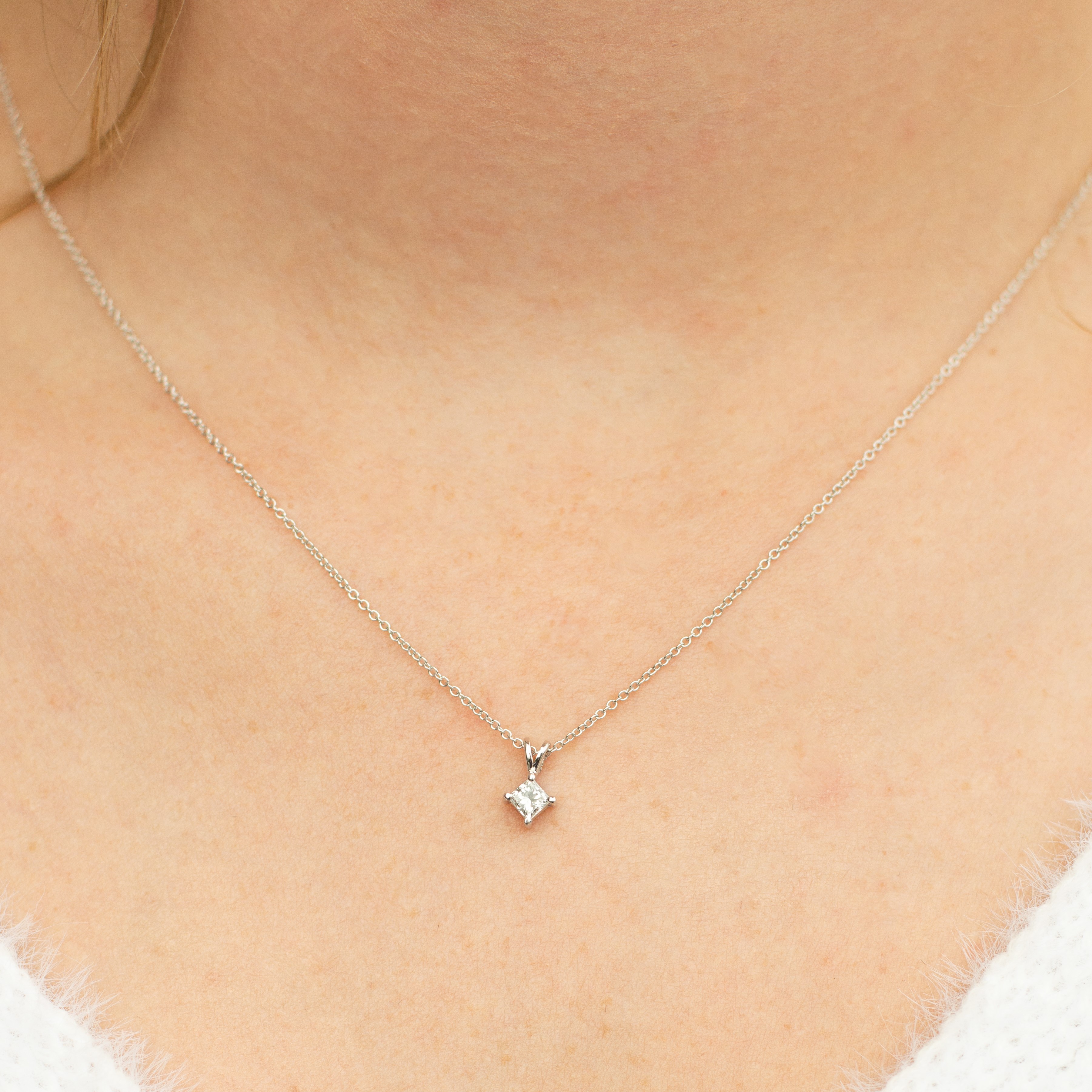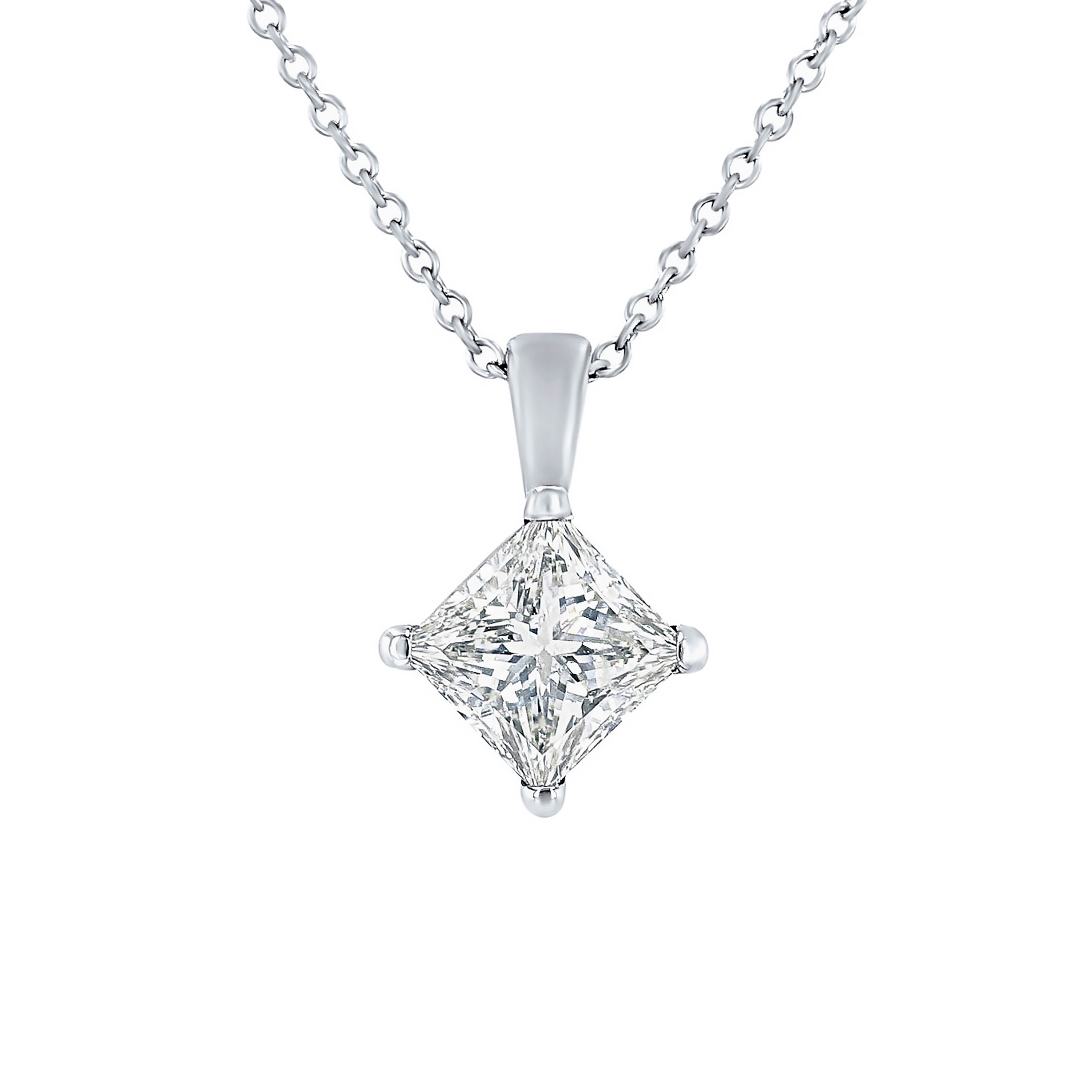 Product Description Timeless and stunning, a princess cut diamond solitaire pendant creates a classic elegance for any look. Other Details Diamond Classics Product Type: Diamond Pendants Gemstone Type: Diamond Disable Reason: None Necklace Type: Solitaire Pendant Average color range: I-J Metal Color: White Gold Average clarity range: I1 Type: Classic Pendant