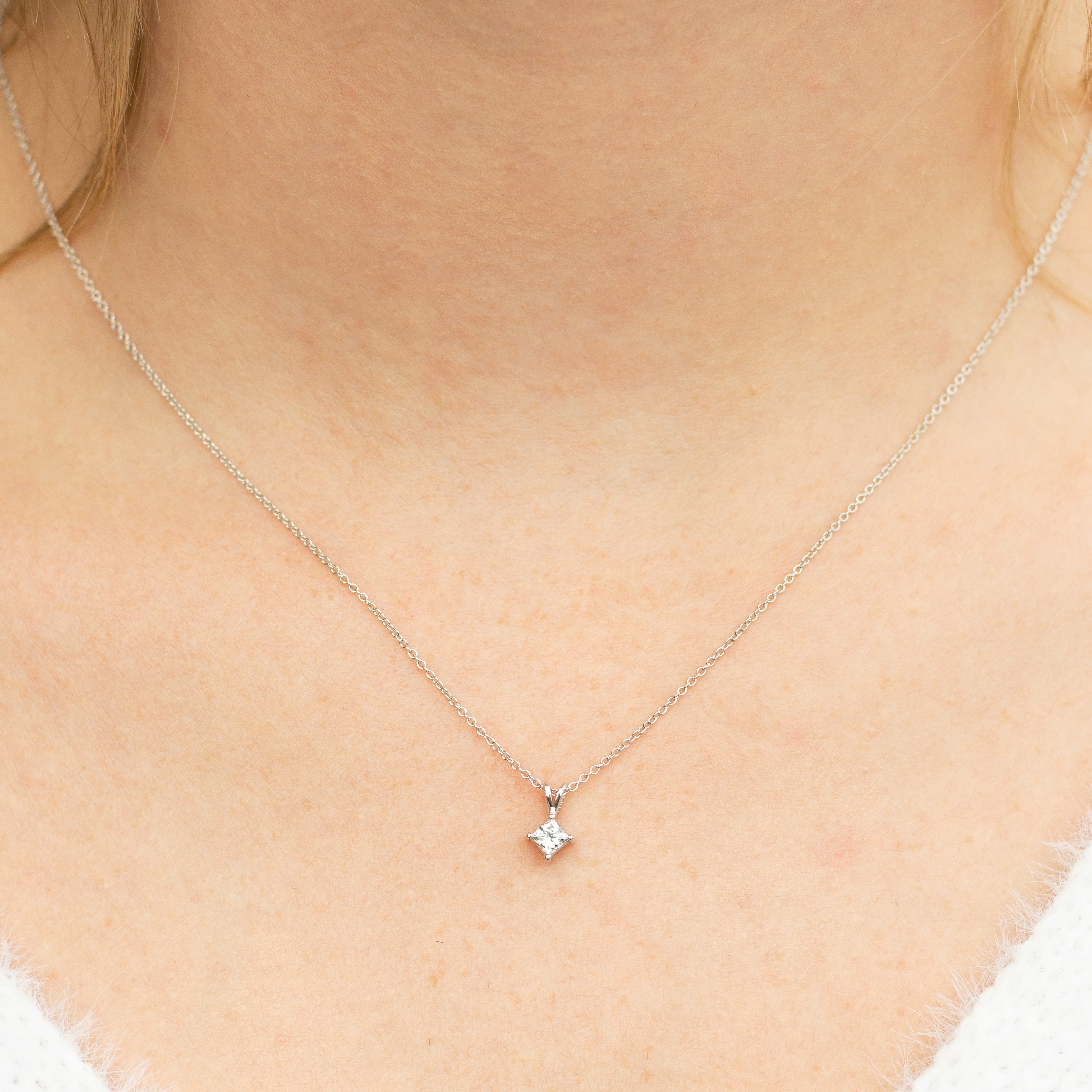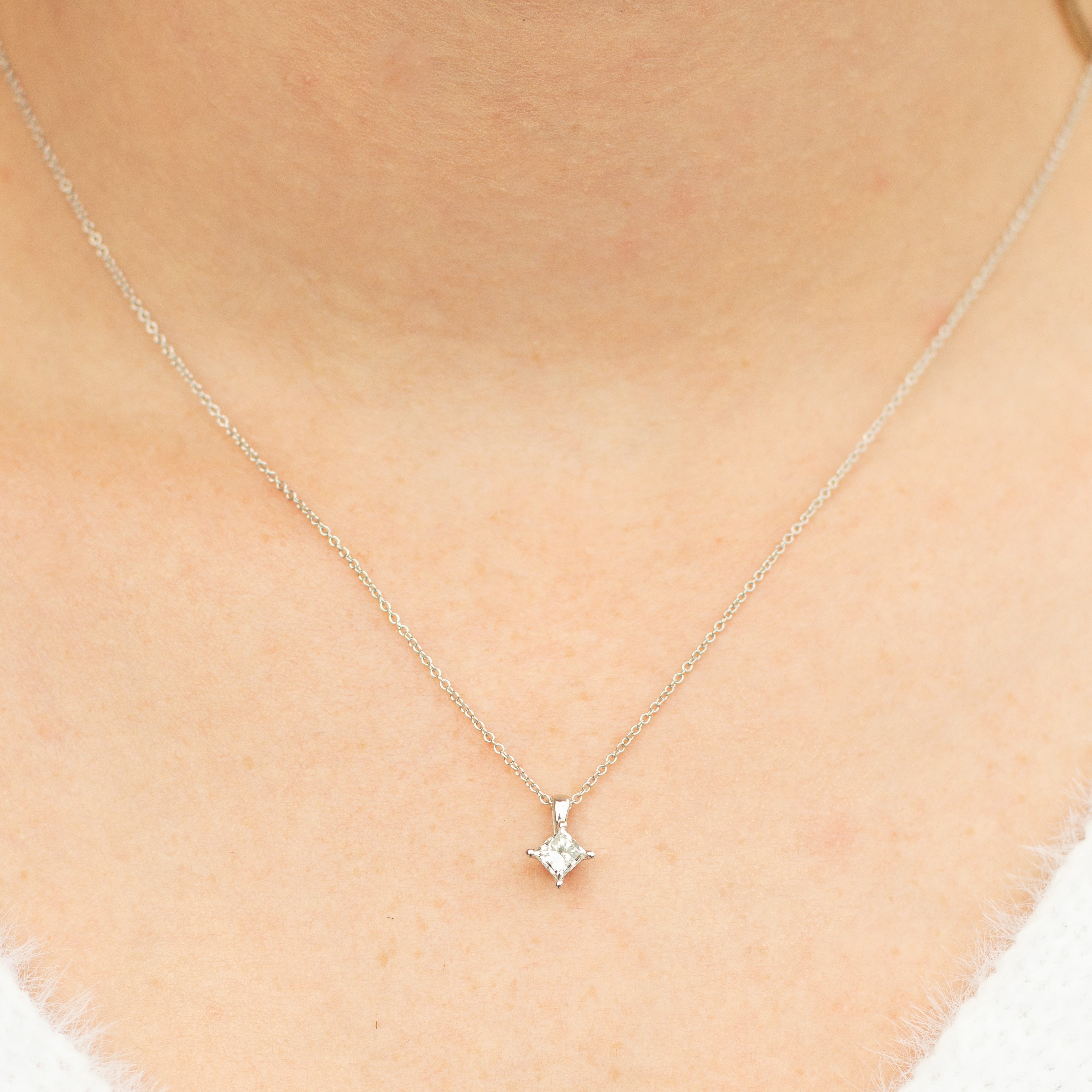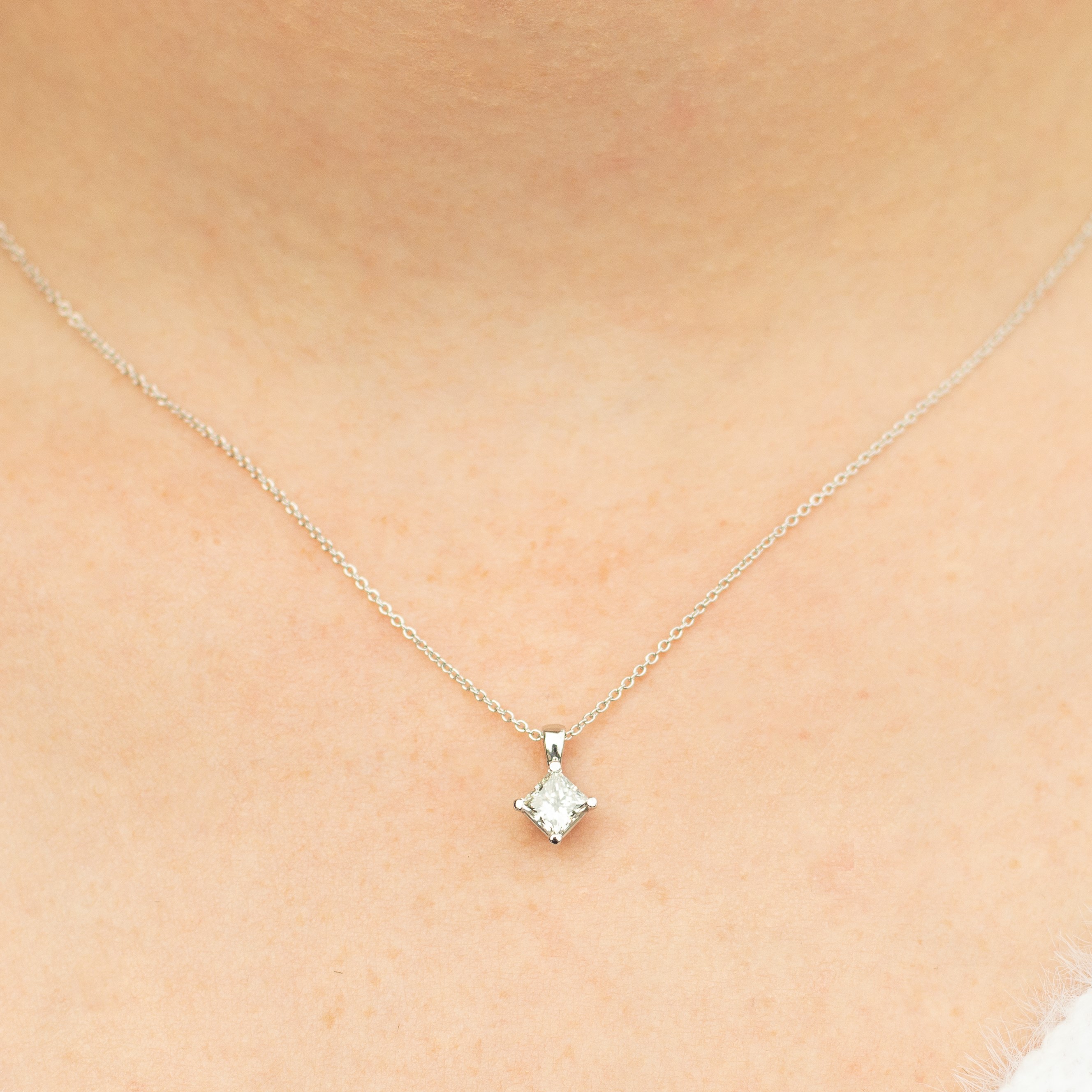 Product Description Timeless and stunning, a princess cut diamond solitaire pendant creates a classic elegance for any look. Other Details Diamond Classics Product Type: Diamond Pendants Gemstone Type: Diamond Disable Reason: None Necklace Type: Solitaire Pendant Average color range: I-J Metal Color: White Gold Average clarity range: I1 Type: Classic Pendant