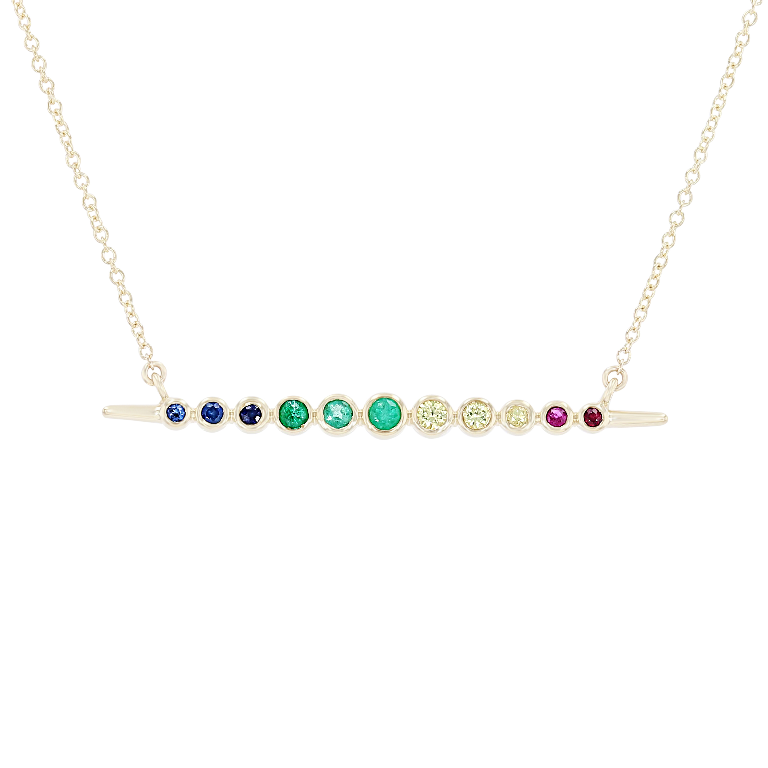 Product Description This distinctive bar pendant features 0.19 carats of multi-colored sapphires graduating in size, accentuated by a bezel setting. Other Details Necklace Type: Fashion Total Setting Diamond Carat Weight: 0.19TW Type: Necklace Metal Color: Yellow Gold Pendant Type: Bar Women Wedding Band Type: Gemstone Style: Contemporary Gemstone Type: Sapphire Disable Reason: None
