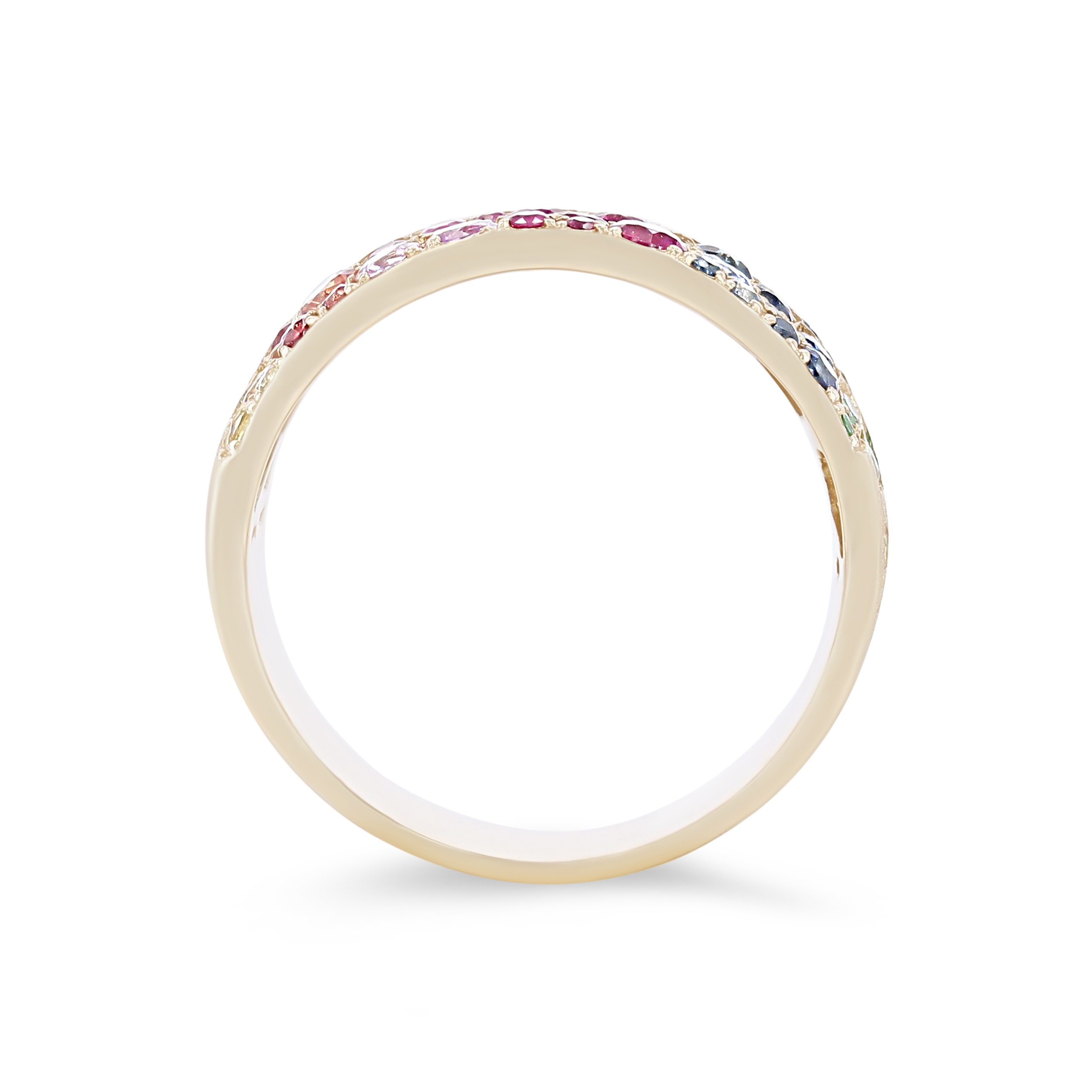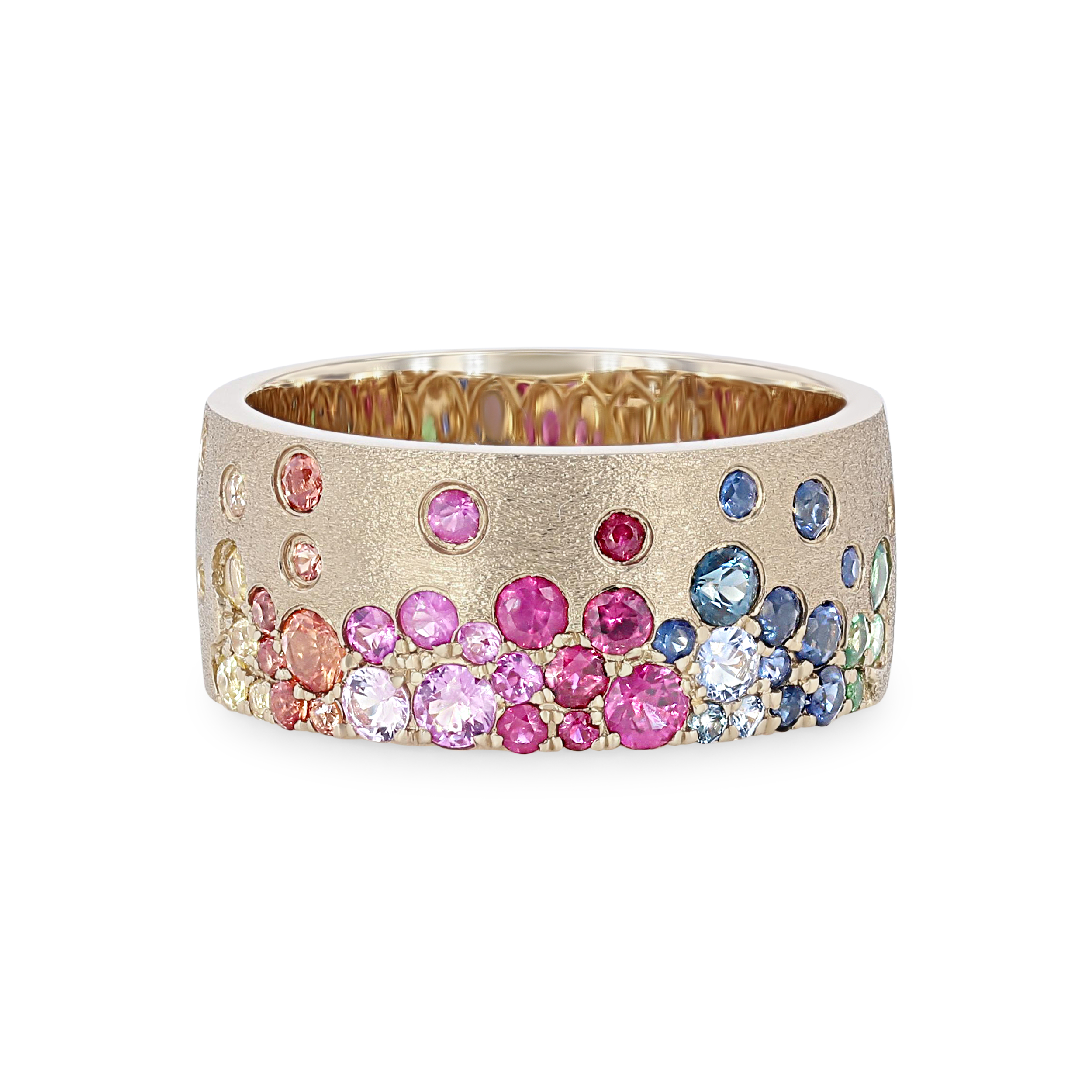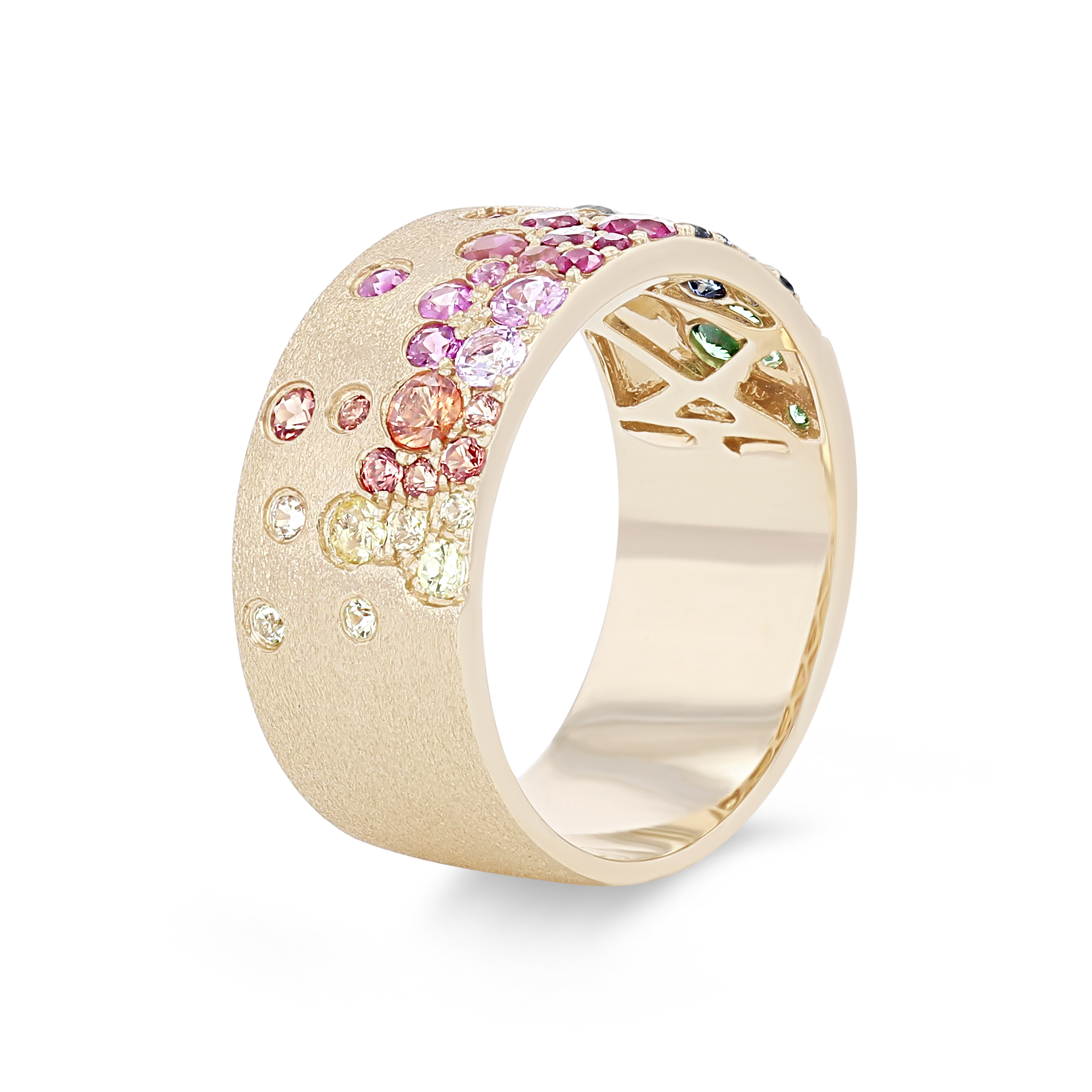 Product Description Crafted in a cigar style, this band features a stunning display of scattered rainbow colored sapphires totaling 1.36 carats. It measures 8.7 millimeters wide. Other Details Type: Ring Women Wedding Band Type: Gemstone Total Gemstone Carat Weight: 1.36TW Disable Reason: None Gemstone Type: Sapphire Metal Color: Yellow Gold Style: Contemporary