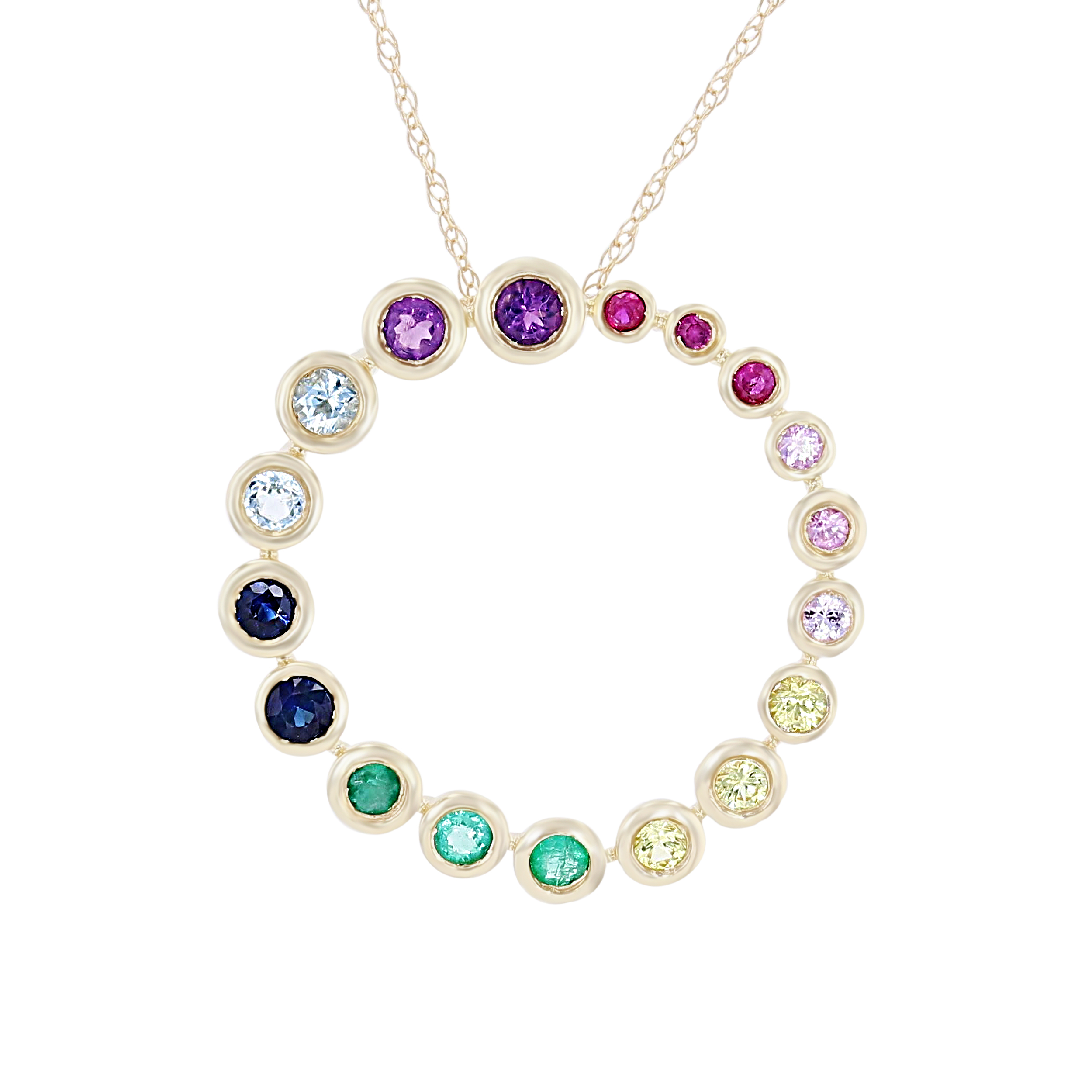 Product Description Wear every shade of the rainbow with this stunning circle pendant, featuring 0.48 carats of multi-colored sapphires in a bezel setting. Other Details Pendant Type: Circle Disable Reason: None Necklace Type: Fashion Length: 18 IN Type: Necklace Gemstone Type: Sapphire Women Wedding Band Type: Gemstone Metal Color: Yellow Gold Total Setting Diamond Carat Weight: 0.48TW Style: Contemporary