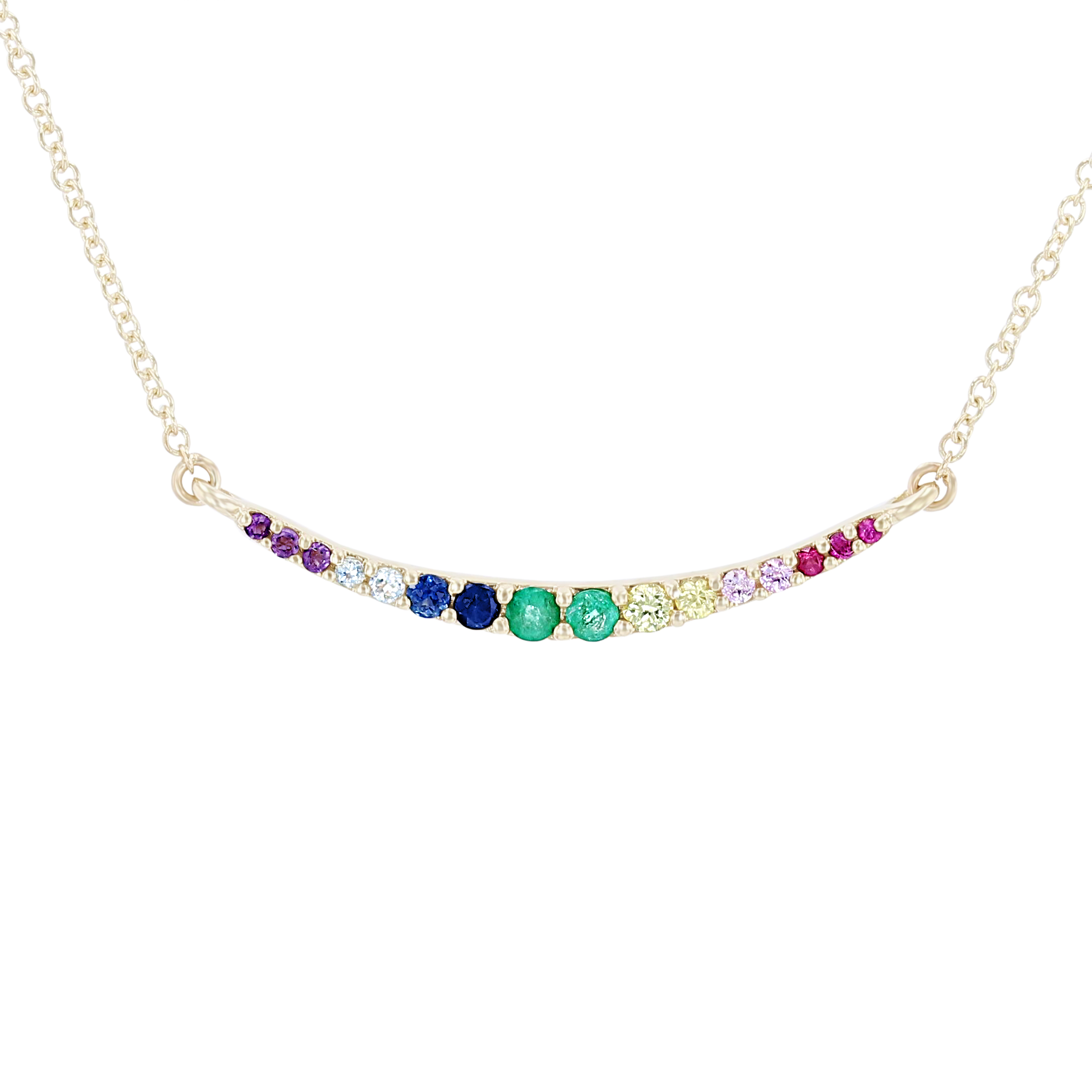 Product Description Delicate yet eye-catching, this curved bar pendant features multiple colors of blue sapphires graduating in size, all totaling 0.20 carats. Other Details Style: Contemporary Gemstone Type: Sapphire Length: 18 IN Total Setting Diamond Carat Weight: 0.2TW Metal Color: Yellow Gold Pendant Type: Bar Type: Necklace Disable Reason: None Necklace Type: Fashion Women Wedding Band Type: Gemstone