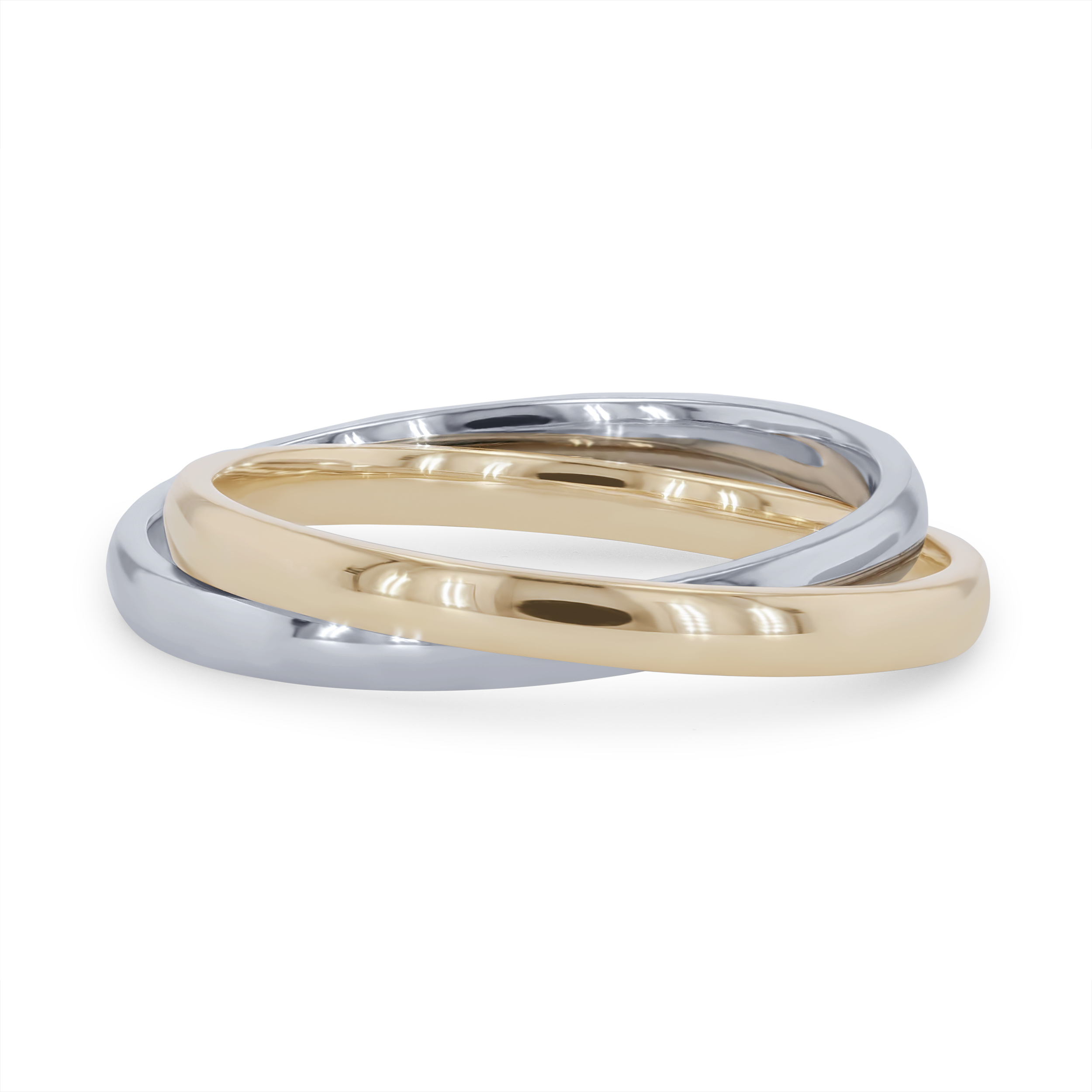 This one-of-a-kind rolling ring design features two interlocked wedding bands in two tones of gold, each measuring 2.5 millimeters.