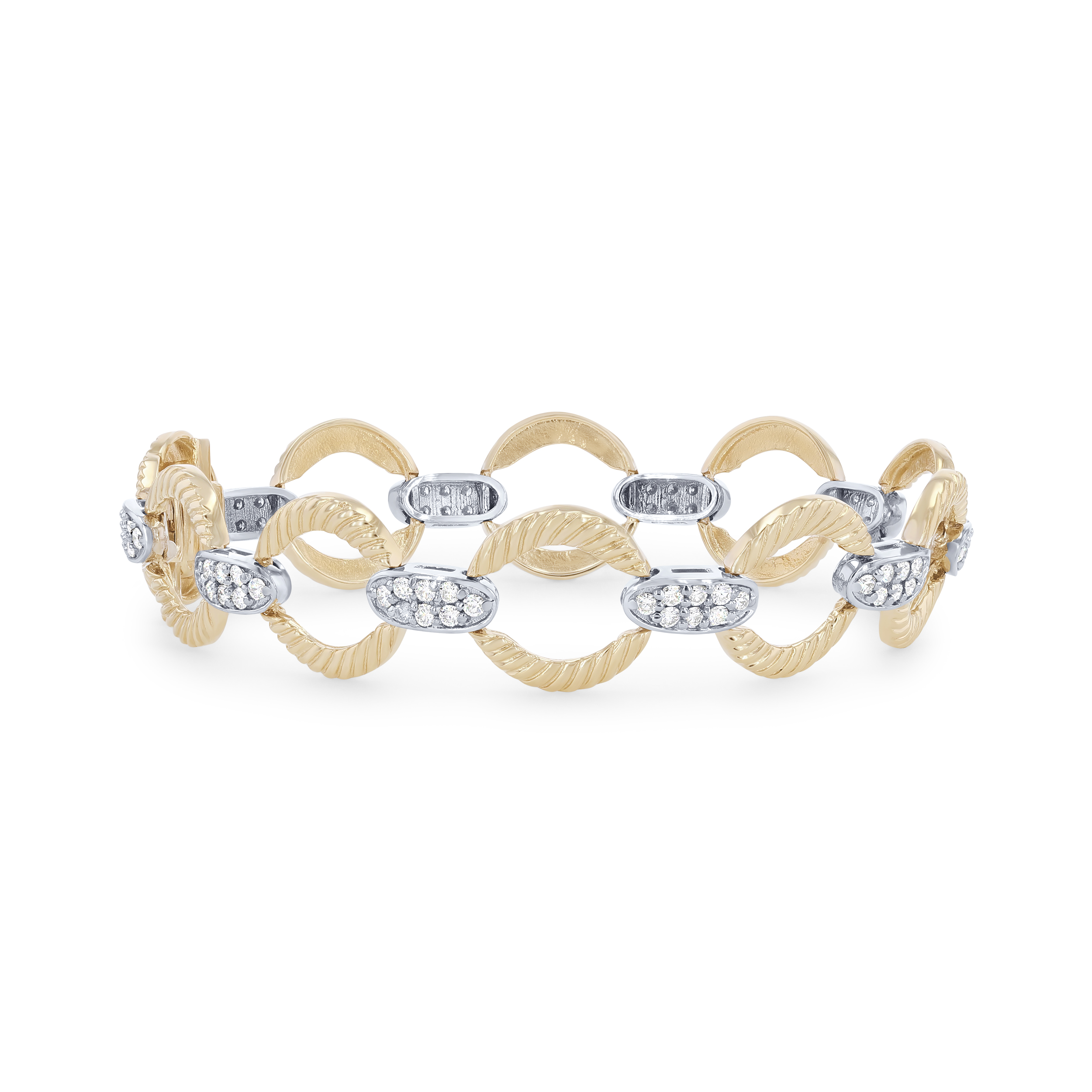 Product Description On-trend and bold, this bracelet features large rope style links accented by 1.50 carats of round brilliant cut diamonds. Other Details Tennis Bracelet Type: Distinctive Tennis Bracelet Gemstone Type: Diamond Style: Contemporary Total Setting Diamond Carat Weight: 1.5TW Disable Reason: None Metal Color: Two Tone Bracelet Type: Tennis Bracelets Type: Bracelet