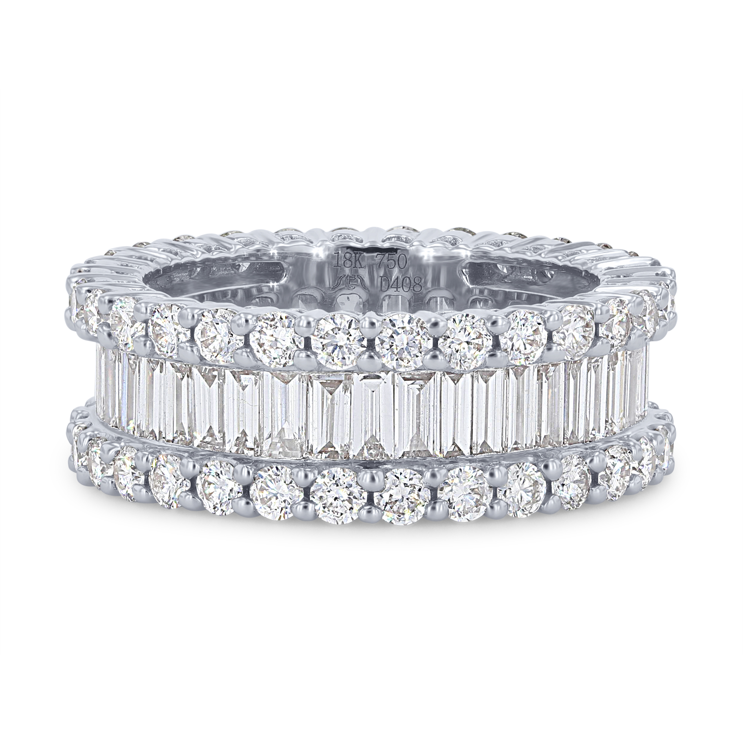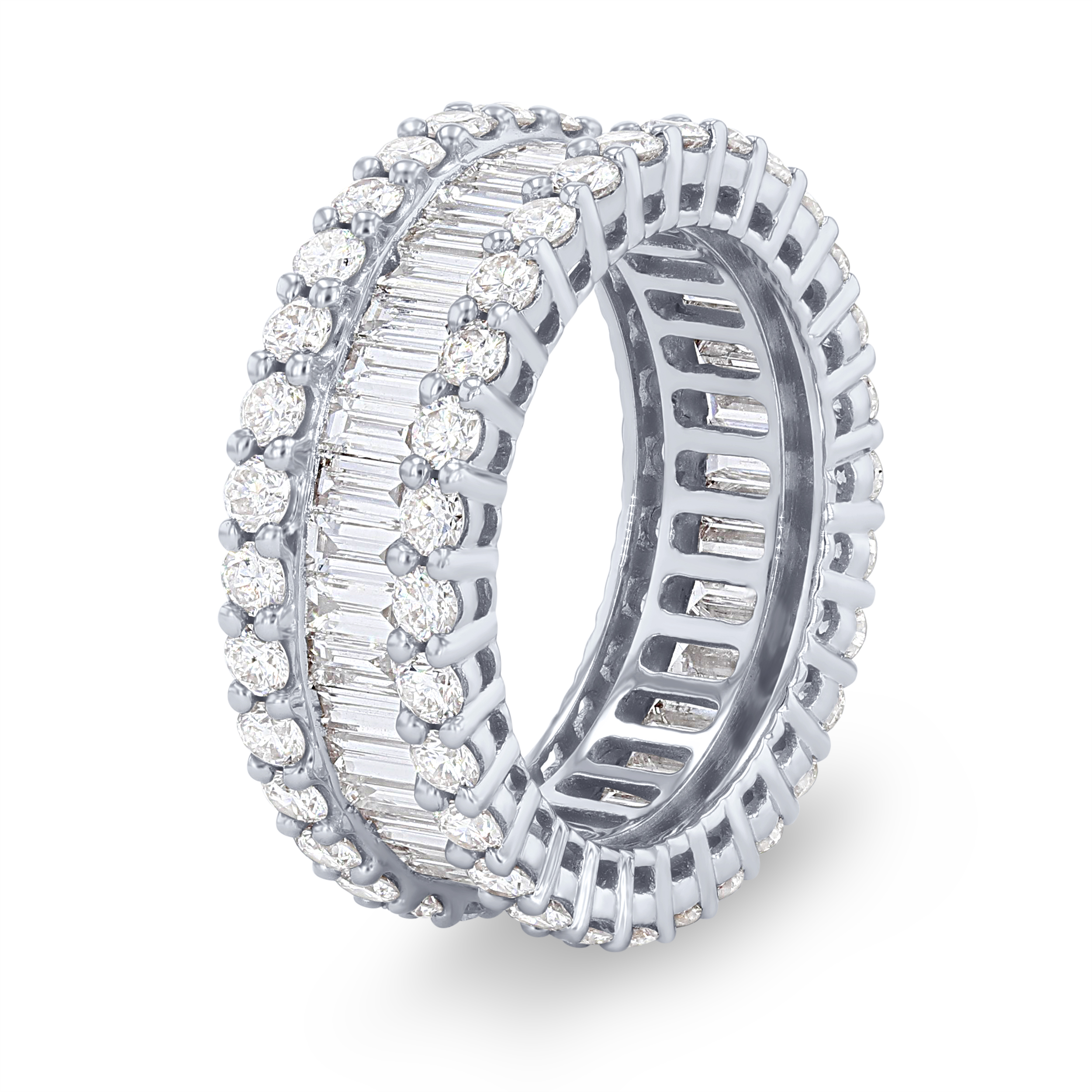 Product Description Make a statement with this gorgeous eternity band featuring 1.90 carats of baguette cut diamonds lined by 2.03 carats of round brilliant cut diamonds. Other Details Metal Color: Rose Gold Metal Color: Yellow Gold Total Setting Diamond Carat Weight: 3.93TW Style: Contemporary Gemstone Type: Diamond Type: Ring Disable Reason: None Ring Type: Eternity Metal Color: White Gold