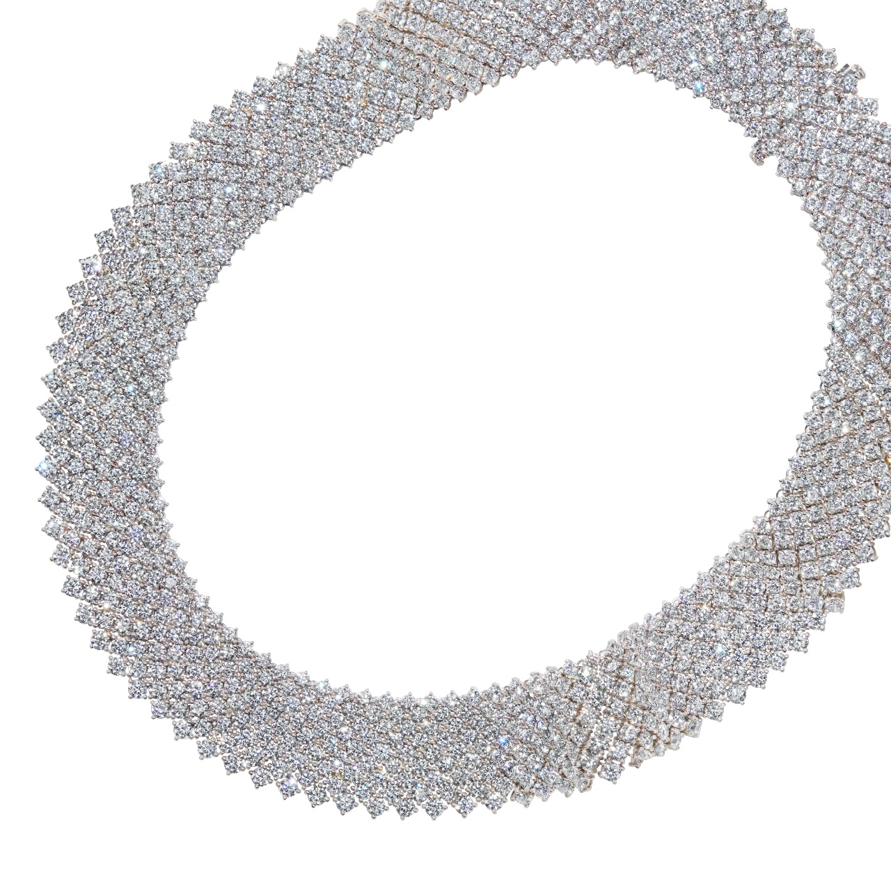 Product Description A one-of-a-kind carpet necklace showcasing 160.95 carats of round brilliant diamonds, set in 18 karat white gold. Other Details Total Setting Diamond Carat Weight: 160.95TW Necklace Type: Fashion Metal Color: White Gold Center Stone Shape: Rounds Gemstone Type: Diamond Luxury Collection Item Type: Necklace Type: Luxury Disable Reason: None Center Stone Type: Diamond