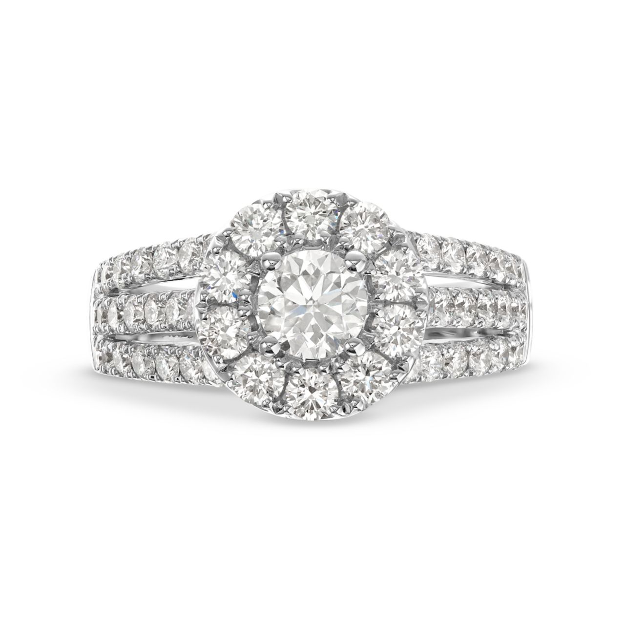 The exquisite Round Diamond Halo Three Row Engagement Ring showcases the timelessness of a round brilliant cut diamond surrounded by three captivating rows of accent diamonds. Perfect for the one wanting a glamorous look, this engagement ring has no shortage of sparkle.