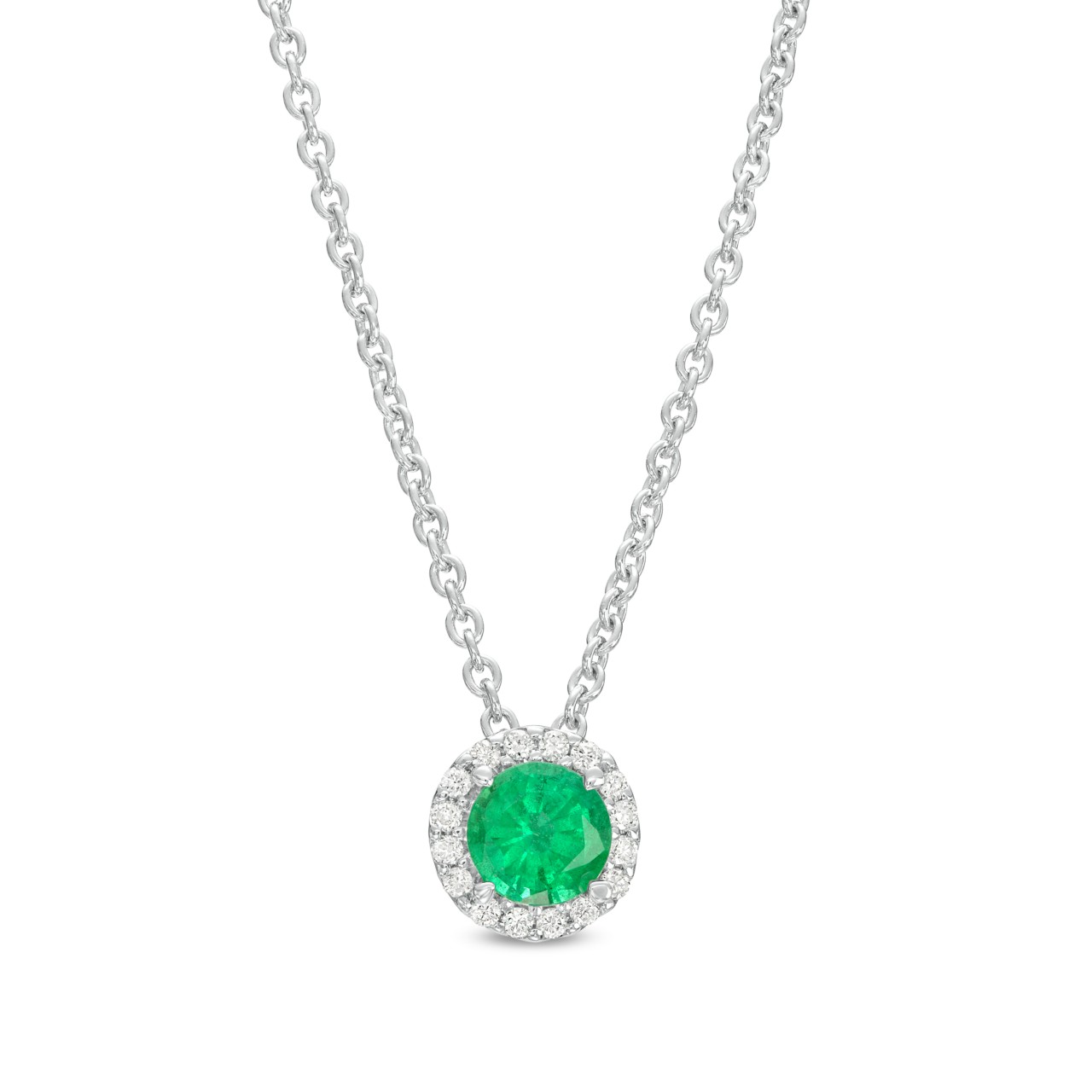 Product Description This classic pendant features a round emerald weighing 0.50 carats surrounded by a halo of round brilliant cut diamonds totaling 0.08 carats. Other Details Center Stone Shape: Rounds Gemstone Type: Emerald Necklace Type: Fashion Total Setting Diamond Carat Weight: 0.08TW Style: Classic Metal Color: White Gold Disable Reason: None Center Stone Type: Emerald Pendant Type: Gemstone Type: Necklace