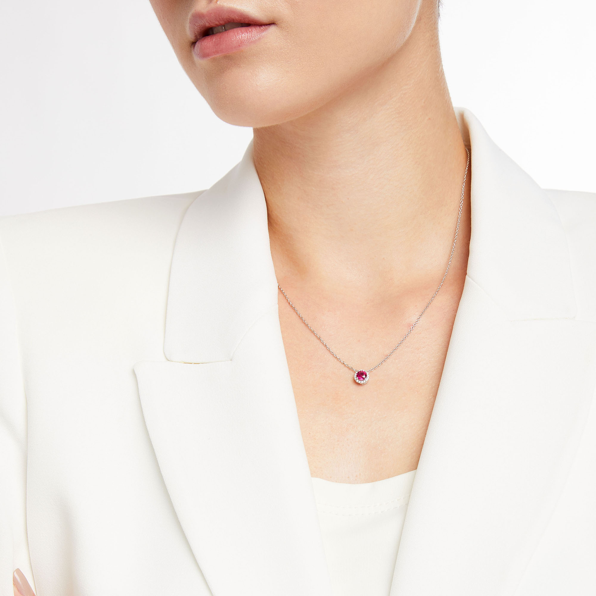Product Description This classic pendant features a round ruby weighing 0.68 carats surrounded by a halo of round brilliant cut diamonds totaling 0.08 carats. Other Details Pendant Type: Gemstone Total Setting Diamond Carat Weight: 0.08TW Center Stone Shape: Rounds Necklace Type: Fashion Style: Classic Disable Reason: None Metal Color: White Gold Gemstone Type: Ruby Type: Necklace Center Stone Type: Ruby