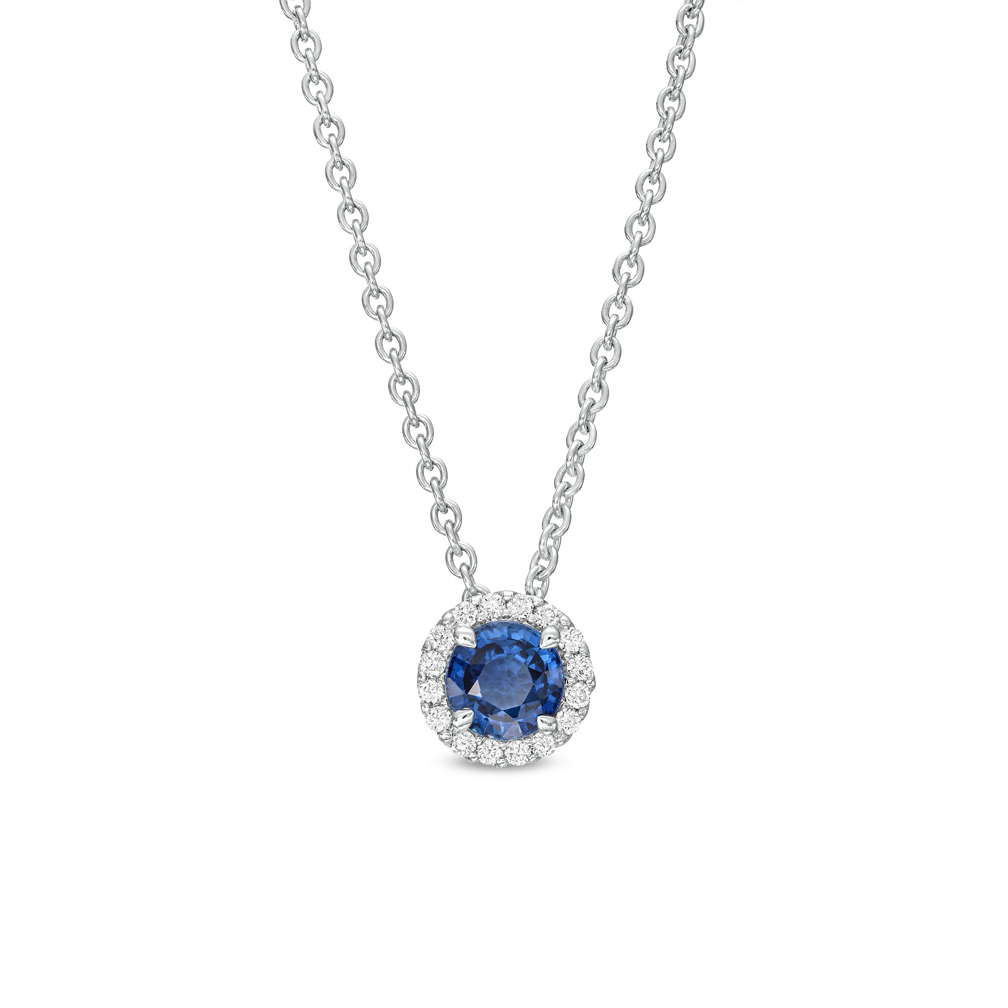 Product Description This classic pendant features a round sapphire weighing 0.68 carats surrounded by a halo of round brilliant cut diamonds totaling 0.08 carats. Other Details Center Stone Type: Sapphire Total Setting Diamond Carat Weight: 0.08TW Gemstone Type: Sapphire Type: Necklace Pendant Type: Gemstone Necklace Type: Fashion Metal Color: White Gold Disable Reason: None Center Stone Shape: Rounds Style: Classic