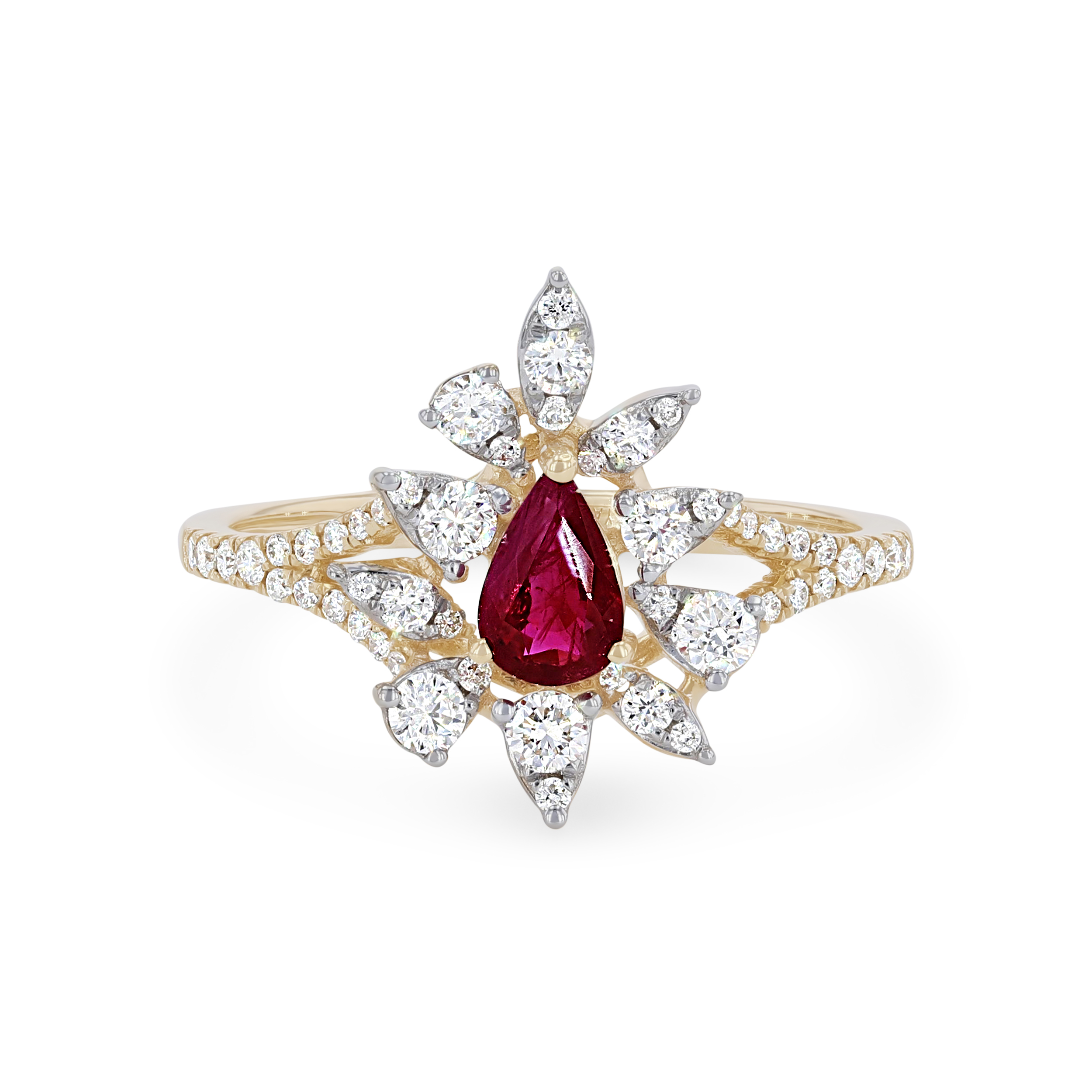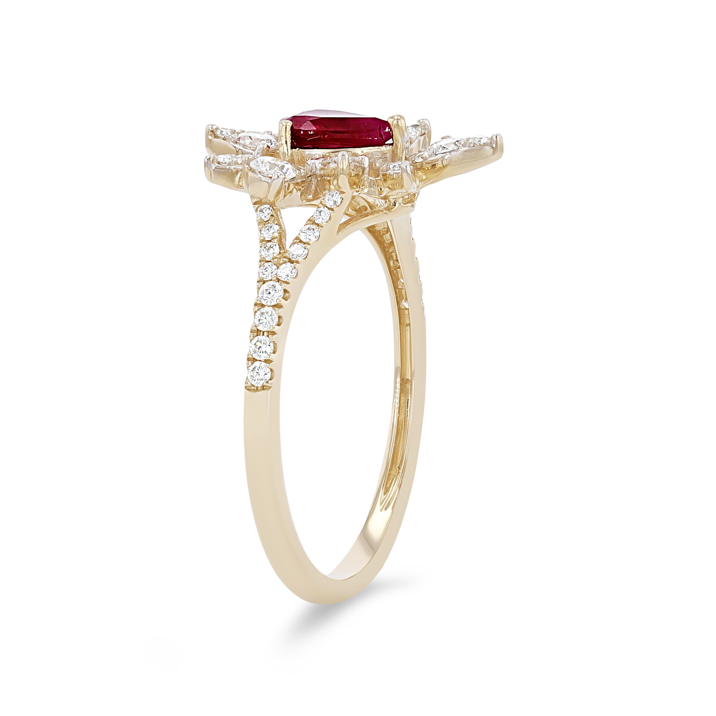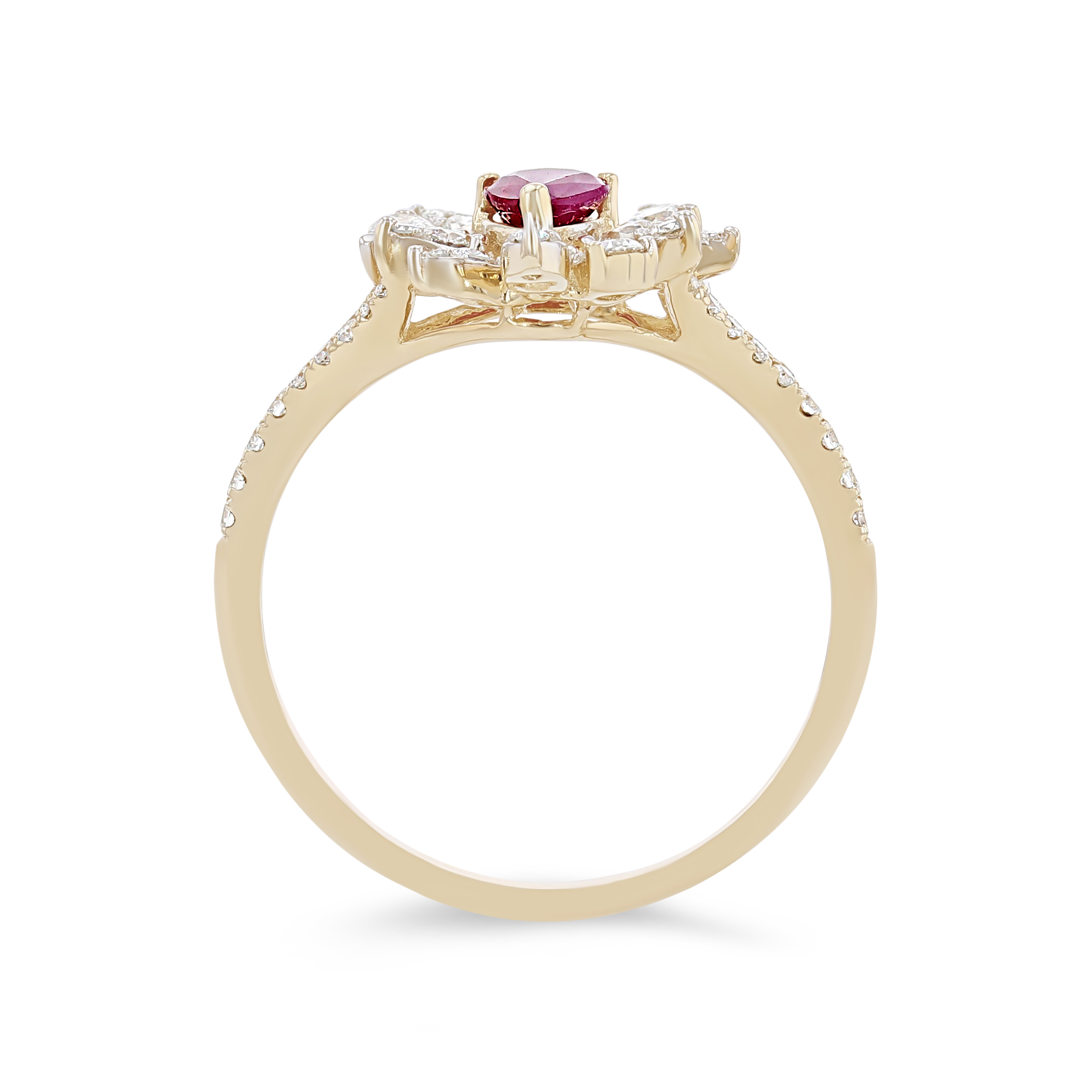 Product Description This unique ring features a 0.45 carat ruby surrounded by a halo of round brilliant cut diamonds totaling 0.45 carats. Other Details Type: Ring Women Wedding Band Type: Gemstone Total Setting Diamond Carat Weight: 0.45TW Style: Contemporary Gemstone Type: Ruby Total Gemstone Carat Weight: 0.45TW Metal Color: Yellow Gold Disable Reason: None