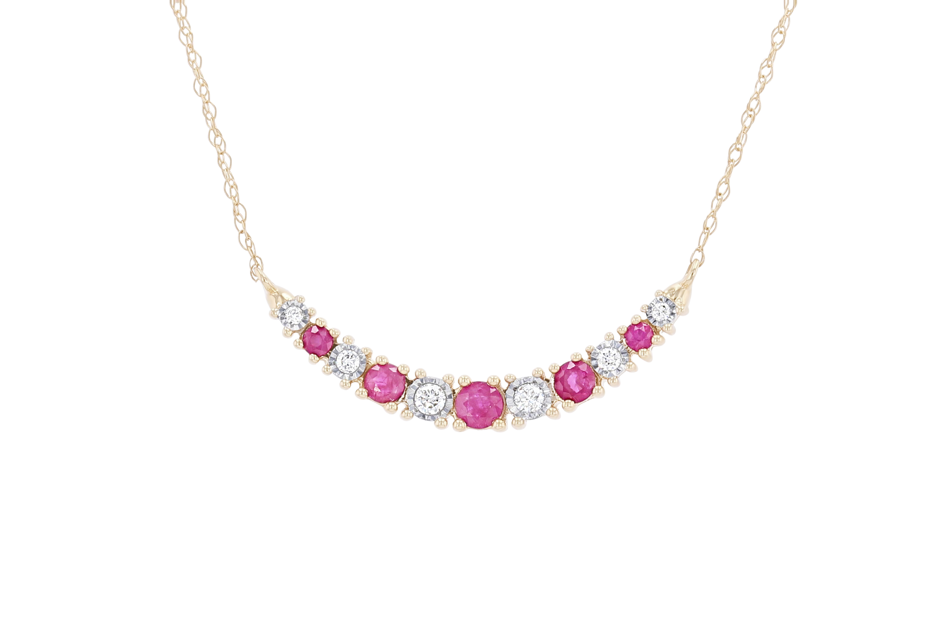Product Description Beautifully designed in a curved bar, this pendant features alternating rubies totaling 0.40 carats and round brilliant cut diamonds totaling 0.10 carats. Other Details Total Gemstone Carat Weight: 0.4TW Necklace Type: Fashion Metal Color: Yellow Gold Type: Necklace Pendant Type: Gemstone Gemstone Type: Ruby Total Setting Diamond Carat Weight: 0.1TW Style: Contemporary Disable Reason: None