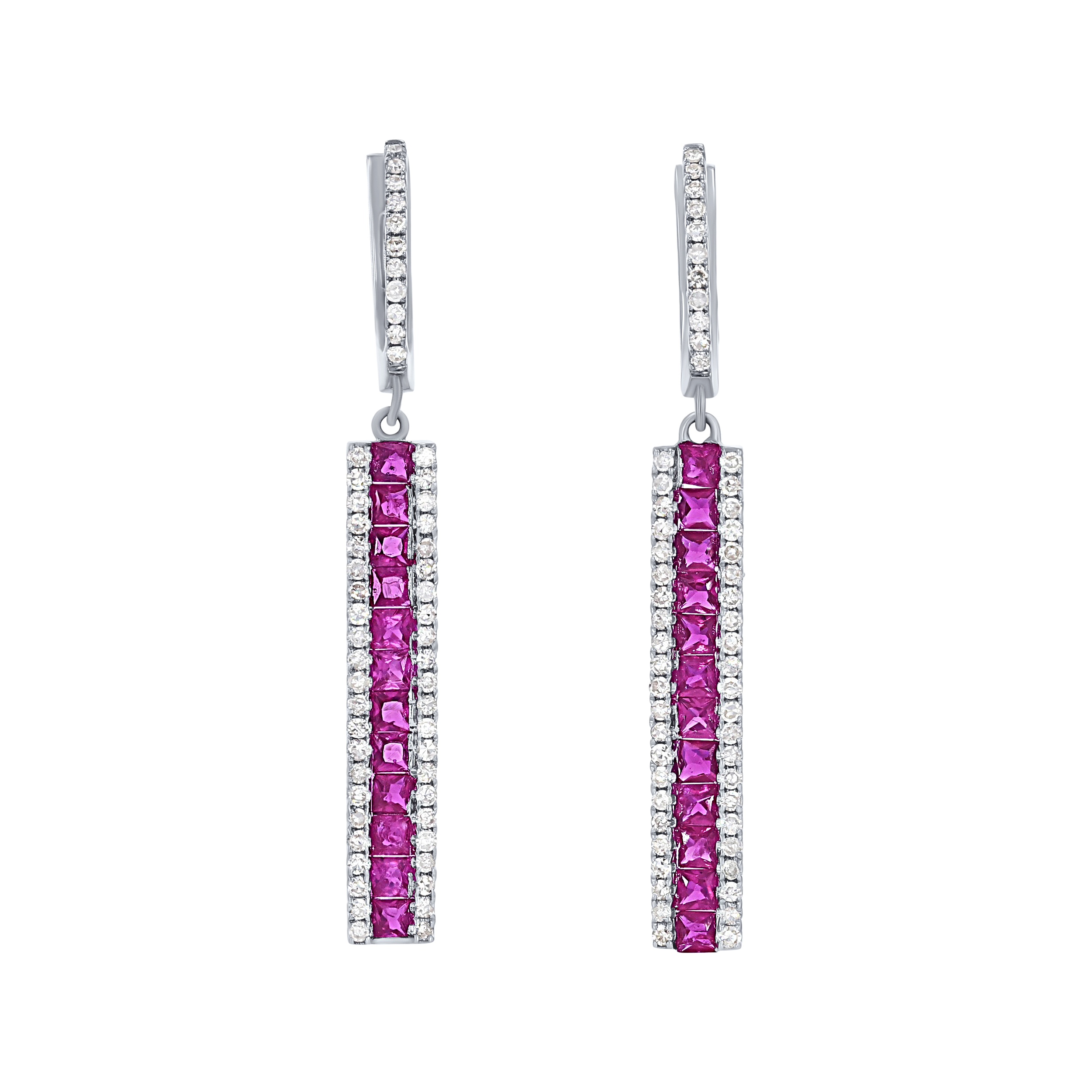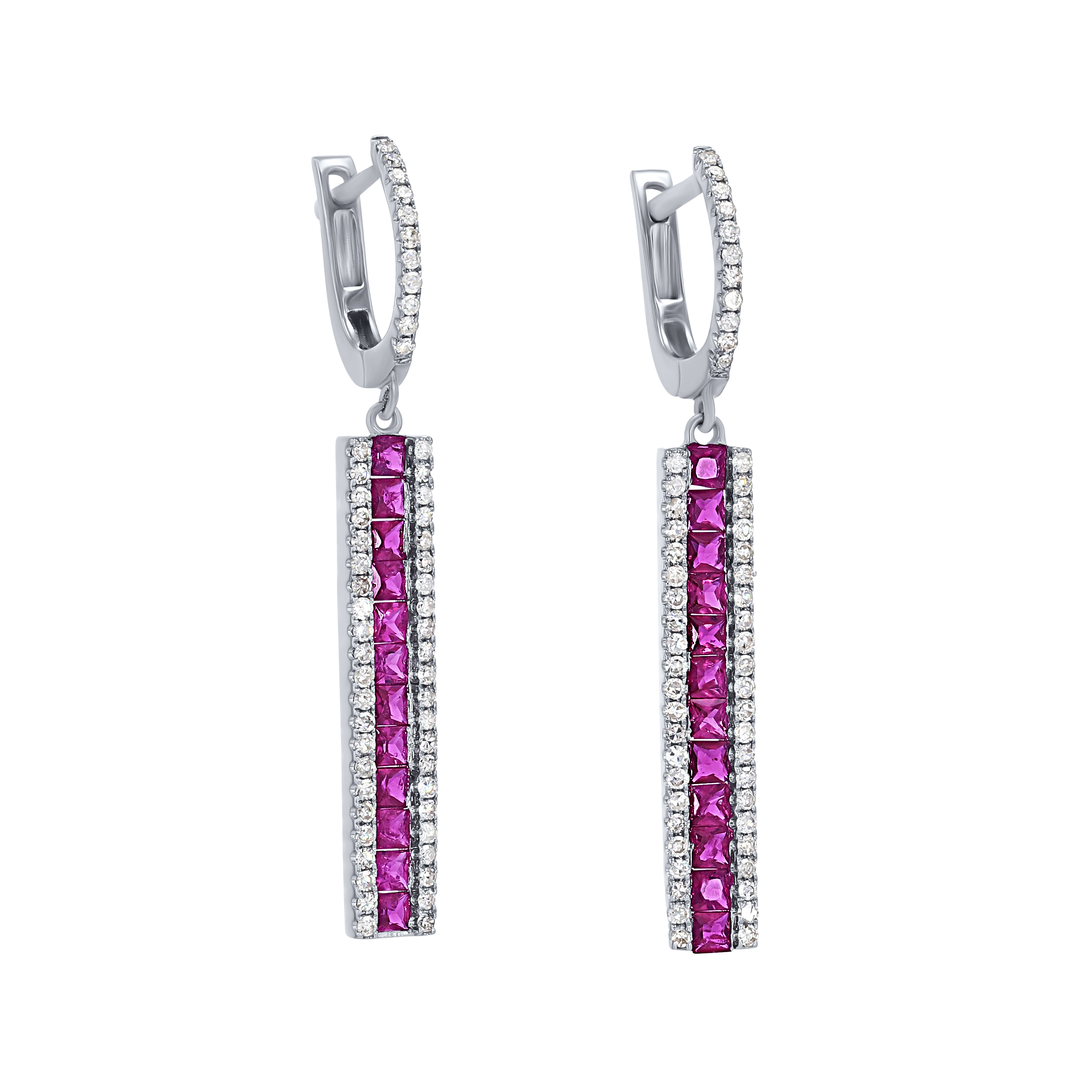 Product Description These drop earrings feature princess cut rubies totaling 1.29 carats with borders of round brilliant cut diamonds totaling 0.61 carats. Other Details Disable Reason: None Total Setting Diamond Carat Weight: 0.61TW Gemstone Type: Ruby Total Gemstone Carat Weight: 1.29TW Style: Contemporary Women Wedding Band Type: Gemstone Metal Color: White Gold Type: Earrings Earring Type: Gemstones
