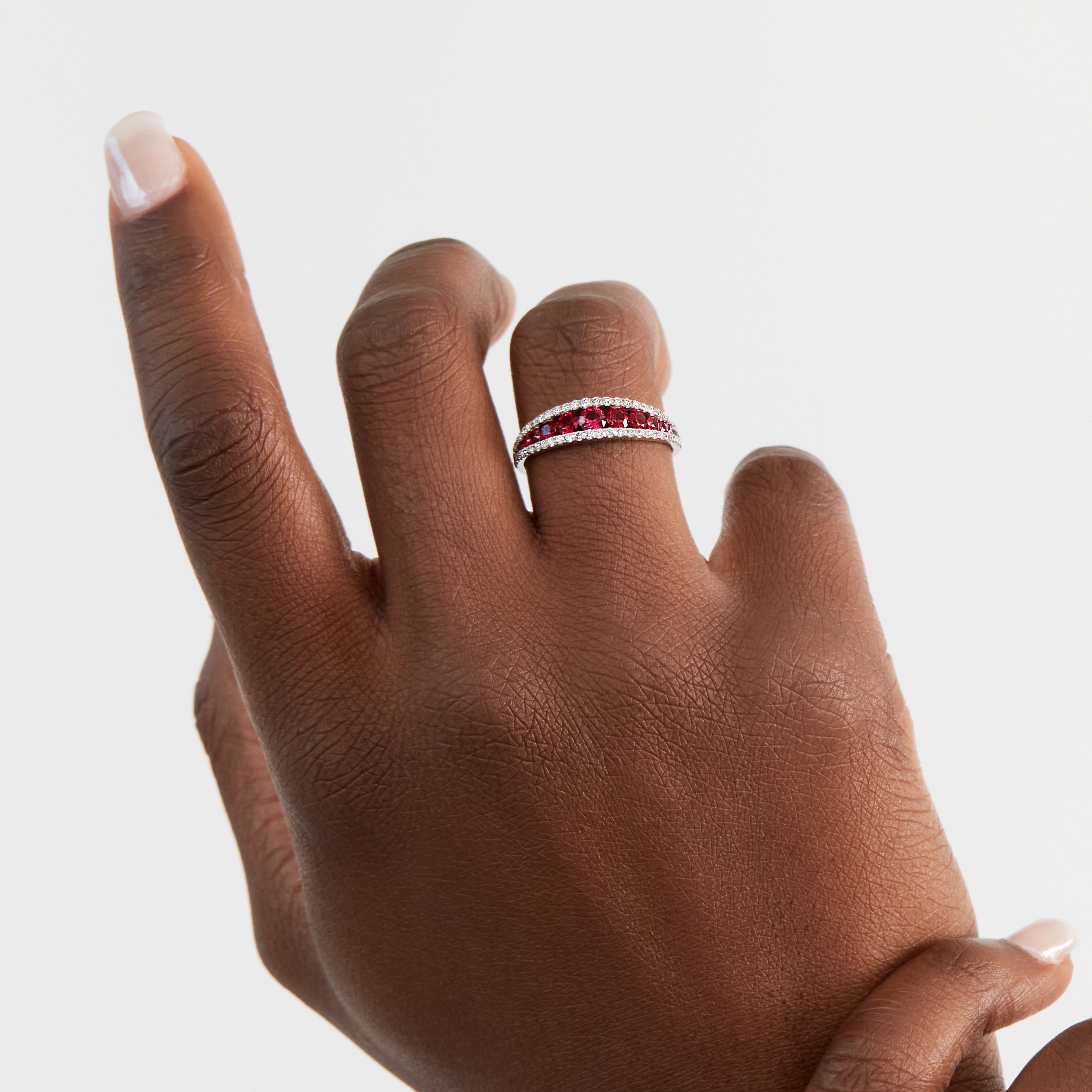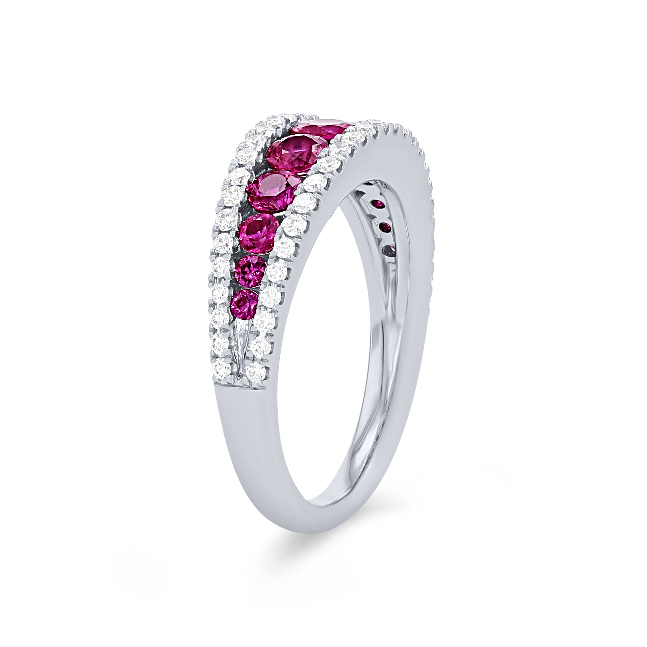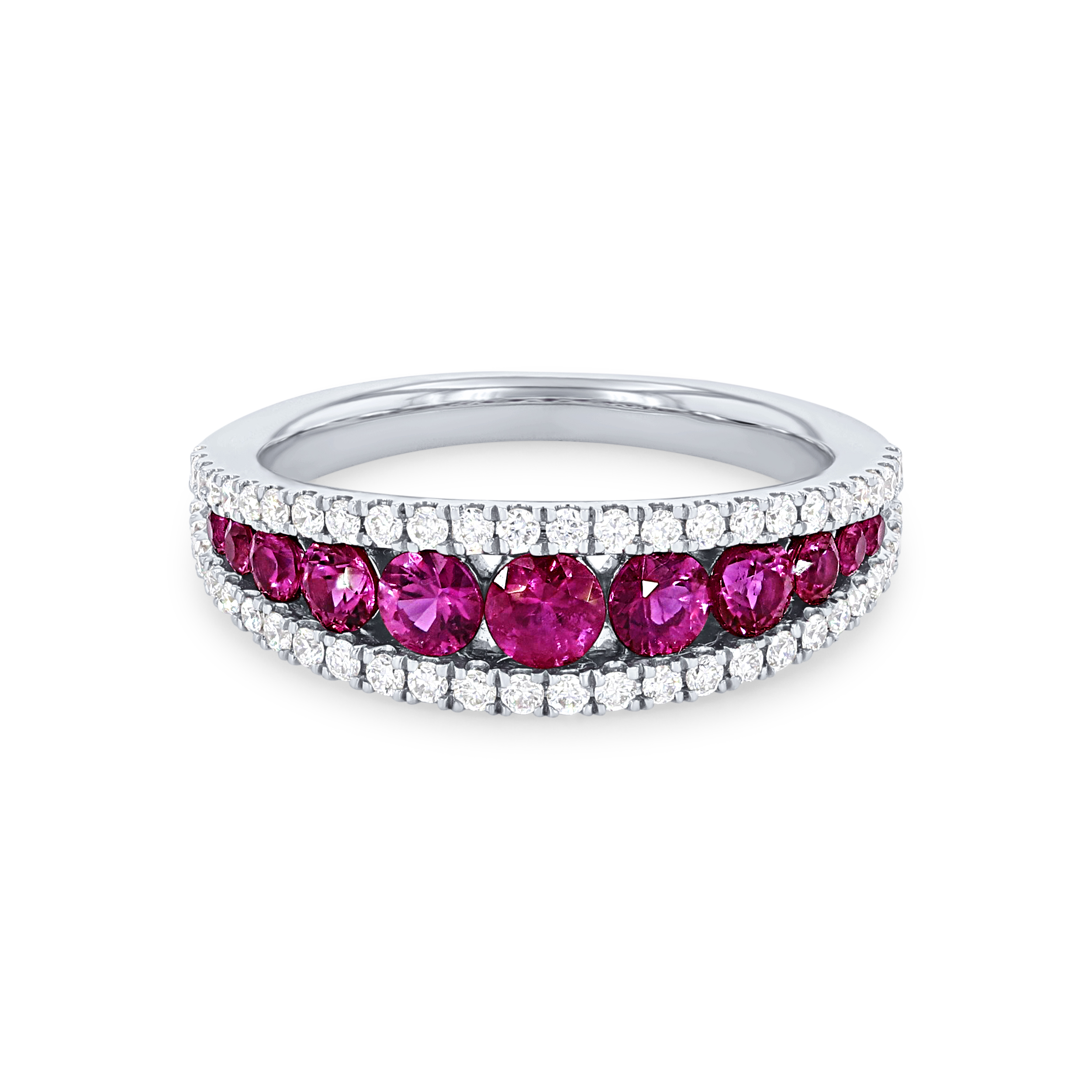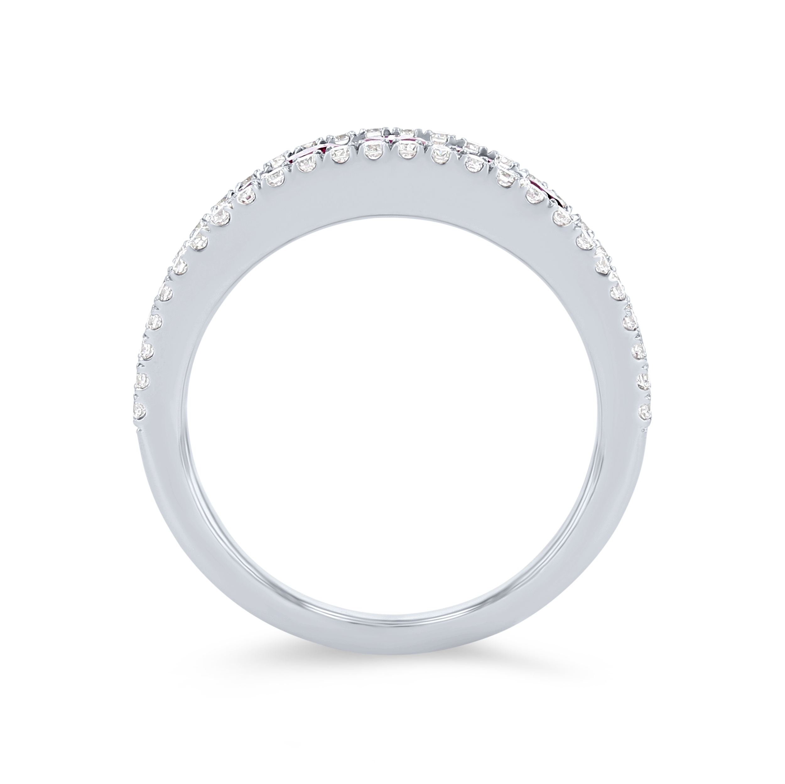 Product Description Beautiful red rubies totaling 1.10 carats are framed by rows of round brilliant cut diamonds totaling 0.40 carats. Other Details Disable Reason: None Gemstone Type: Ruby Women Wedding Band Type: Gemstone Total Gemstone Carat Weight: 1.1TW Style: Contemporary Metal Color: White Gold Type: Ring Total Setting Diamond Carat Weight: 0.4TW