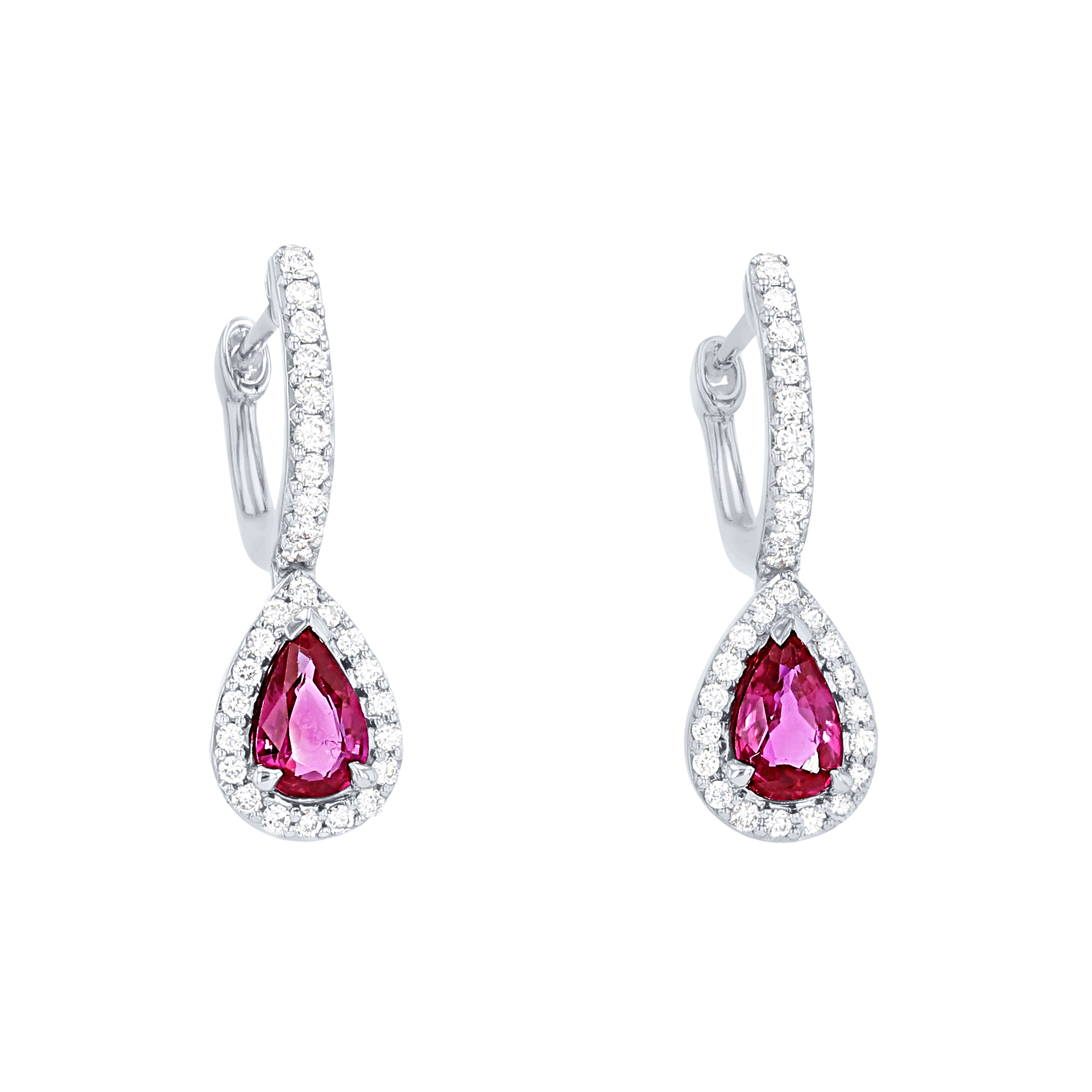 These elegant drop earrings feature two pear shape rubies totaling 1.00 carat surrounded by halos of round brilliant cut diamonds totaling 0.35 carats.