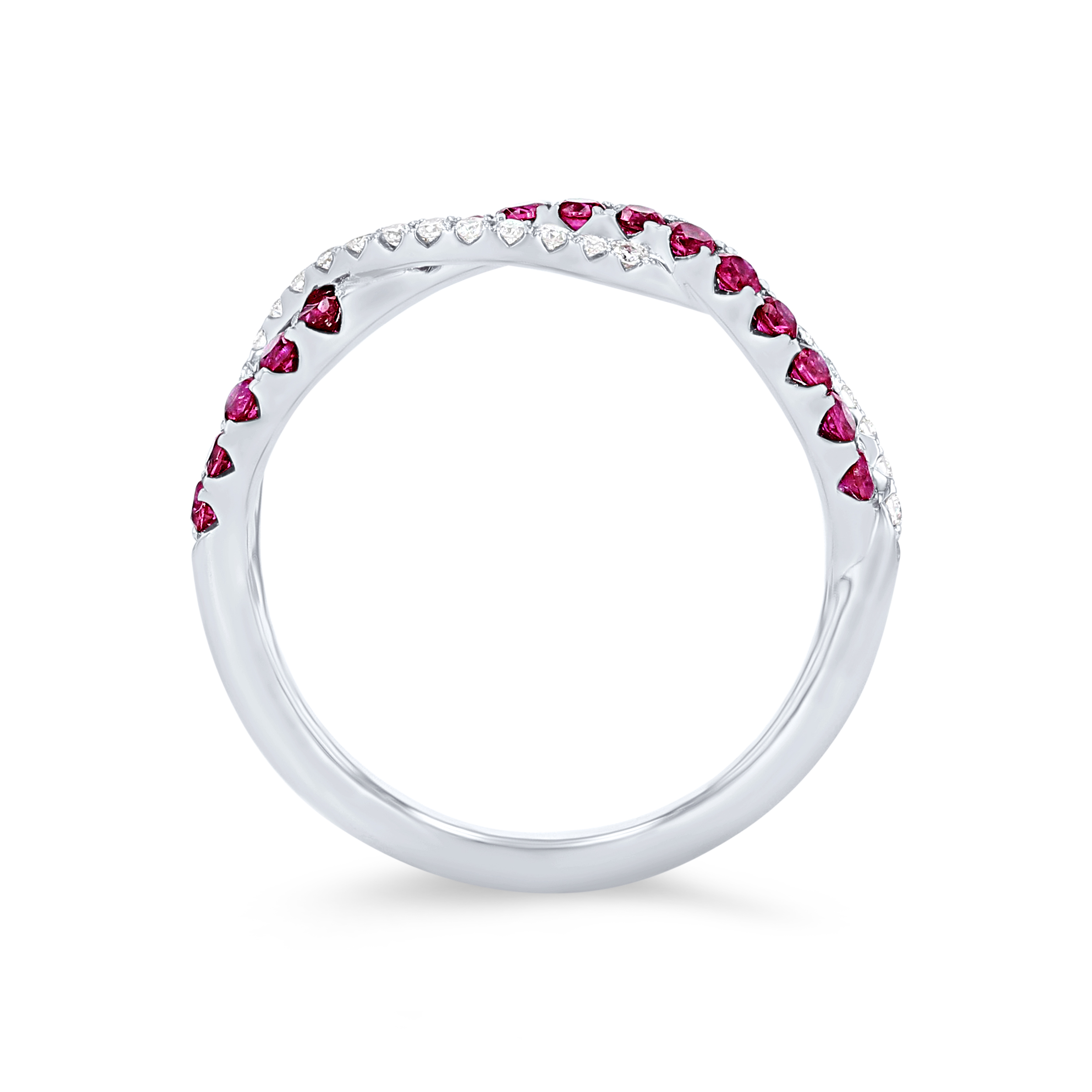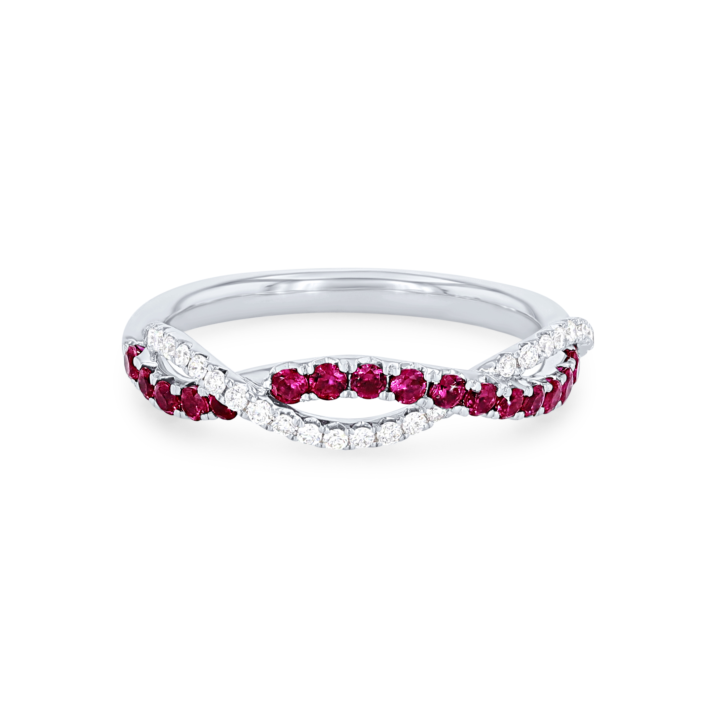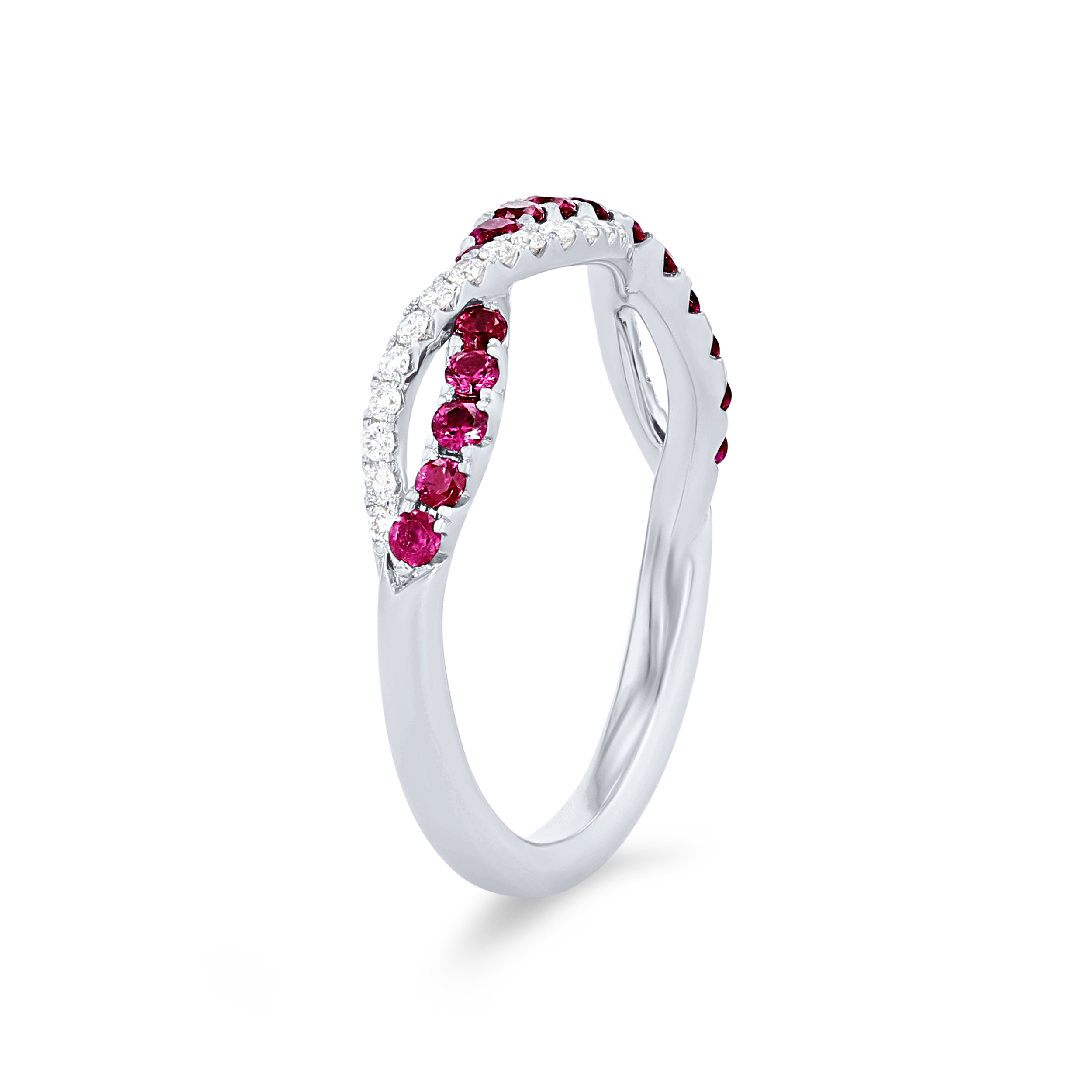 A unique contemporary design, this band features a twist design with 0.47 carats of rubies and 0.16 carats of round brilliant cut diamonds.