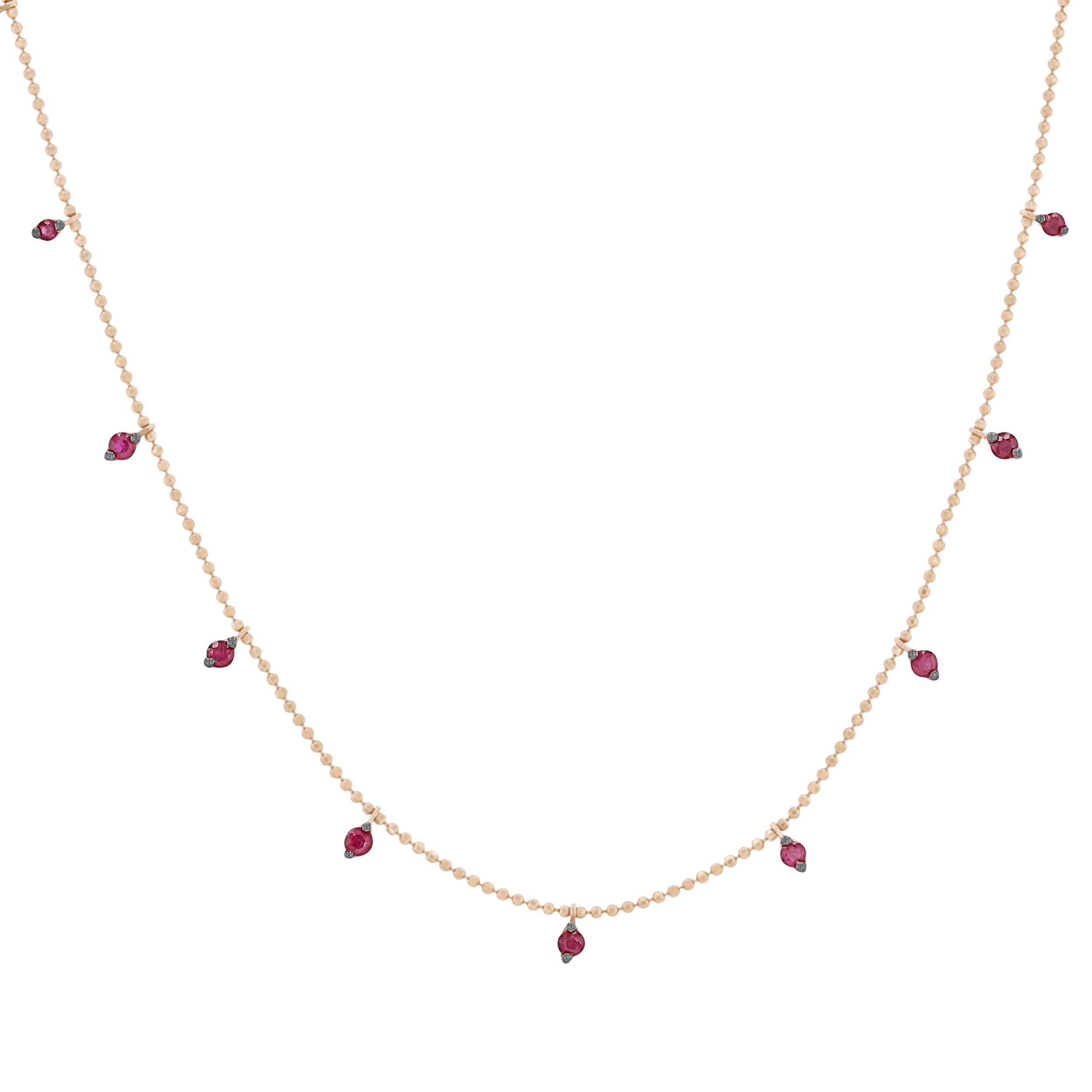 Product Description This stunning, modern station necklace features rubies totaling 0.65 carats. Perfect for wearing solo or layering with others. Other Details Type: Necklace Disable Reason: None Gemstone Type: Ruby Style: Contemporary Total Gemstone Carat Weight: 0.65TW Pendant Type: Gemstone Metal Color: Rose Gold Necklace Type: Fashion