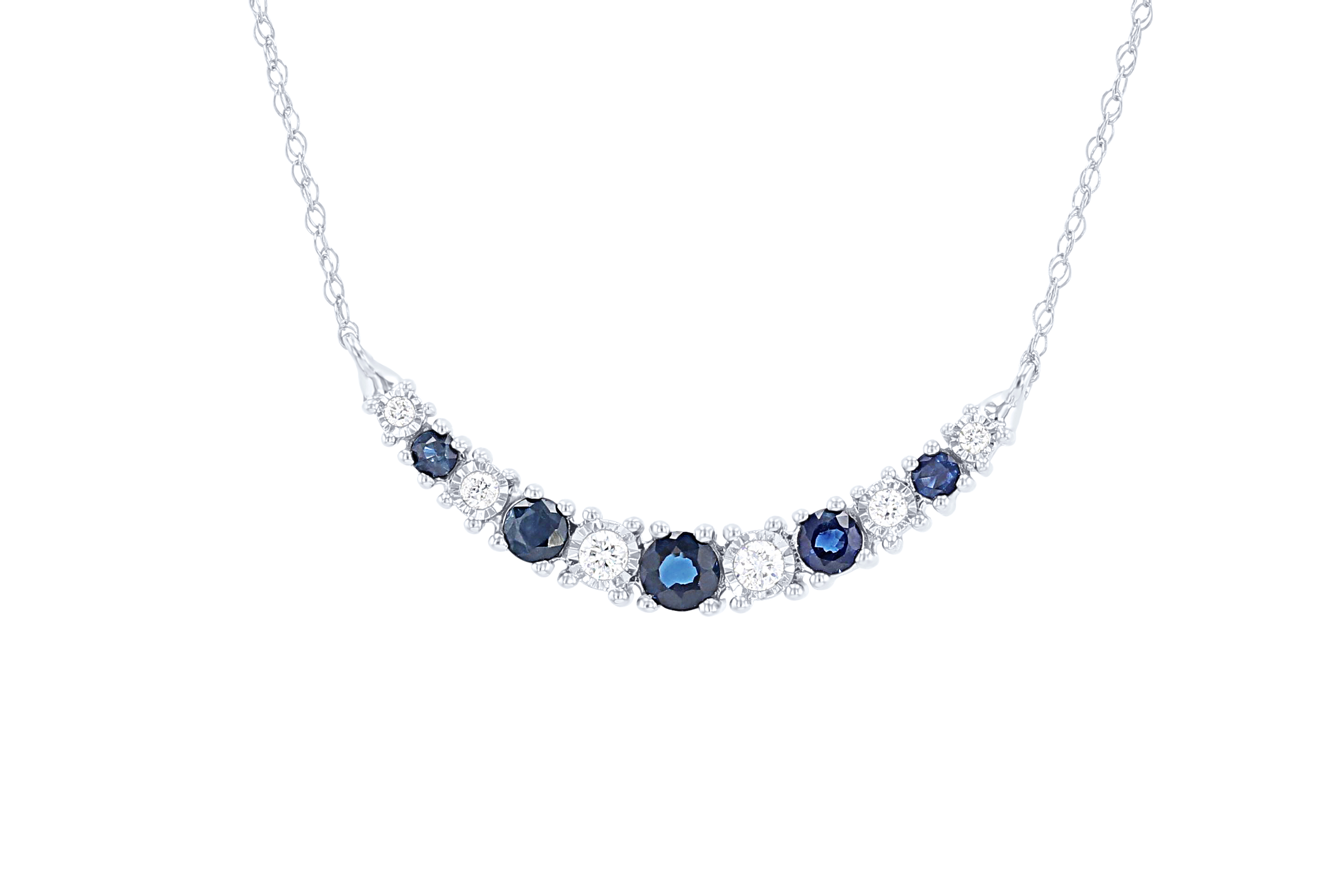 Product Description Beautifully designed in a curved bar, this pendant features alternating sapphires totaling 0.40 carats and round brilliant cut diamonds totaling 0.10 carats. Other Details Total Setting Diamond Carat Weight: 0.1TW Disable Reason: None Style: Contemporary Length: 18 IN Metal Color: White Gold Total Gemstone Carat Weight: 0.4TW Necklace Type: Fashion Gemstone Type: Sapphire Pendant Type: Gemstone Type: Necklace