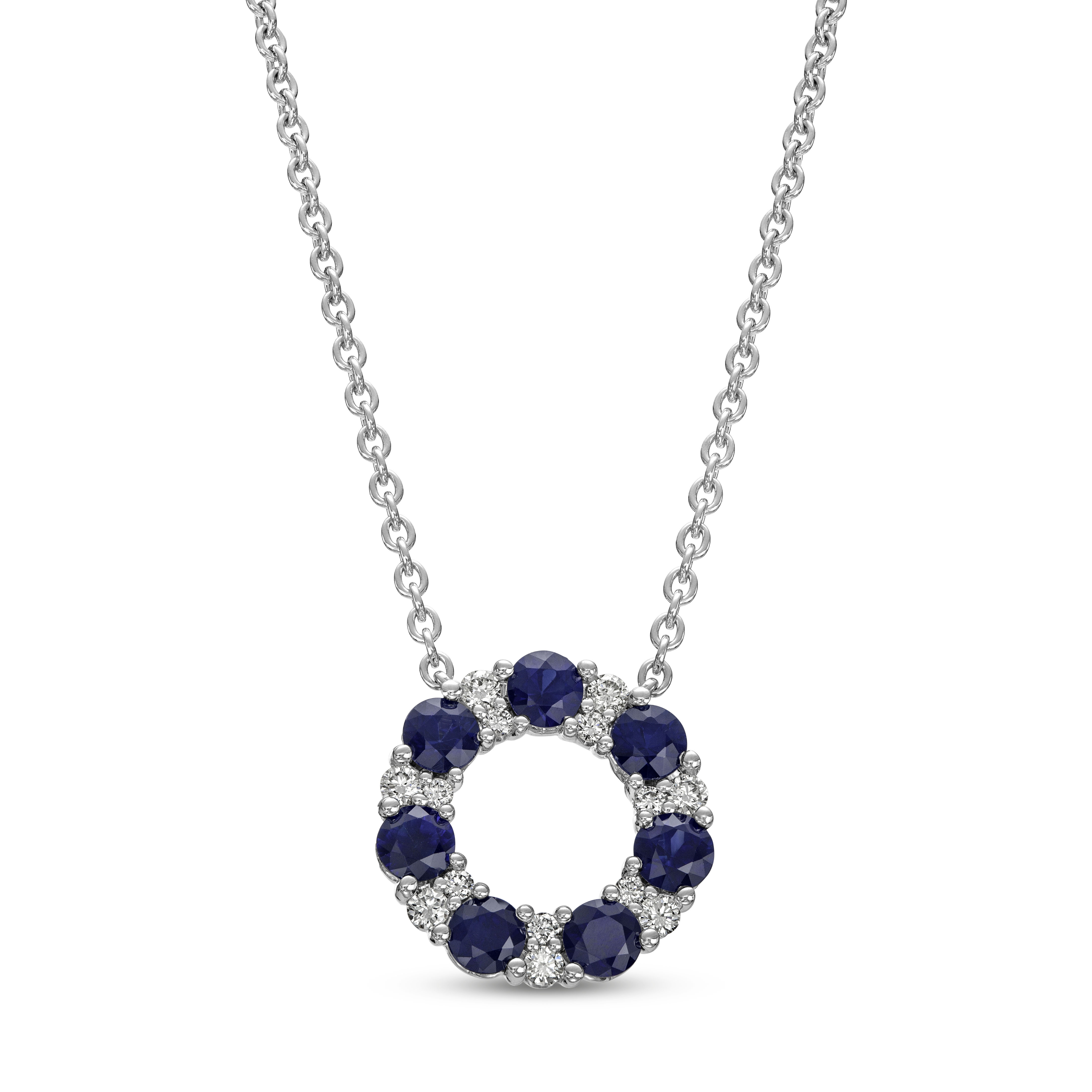 Product Description This stunning circle pendant features alternating sapphires totaling 1.05 carats and round brilliant cut diamonds totaling 0.16 carats. Other Details Style: Contemporary Gemstone Type: Sapphire Disable Reason: None Pendant Type: Gemstone Type: Necklace Total Gemstone Carat Weight: 1.05TW Total Setting Diamond Carat Weight: 0.16TW Metal Color: White Gold Necklace Type: Fashion