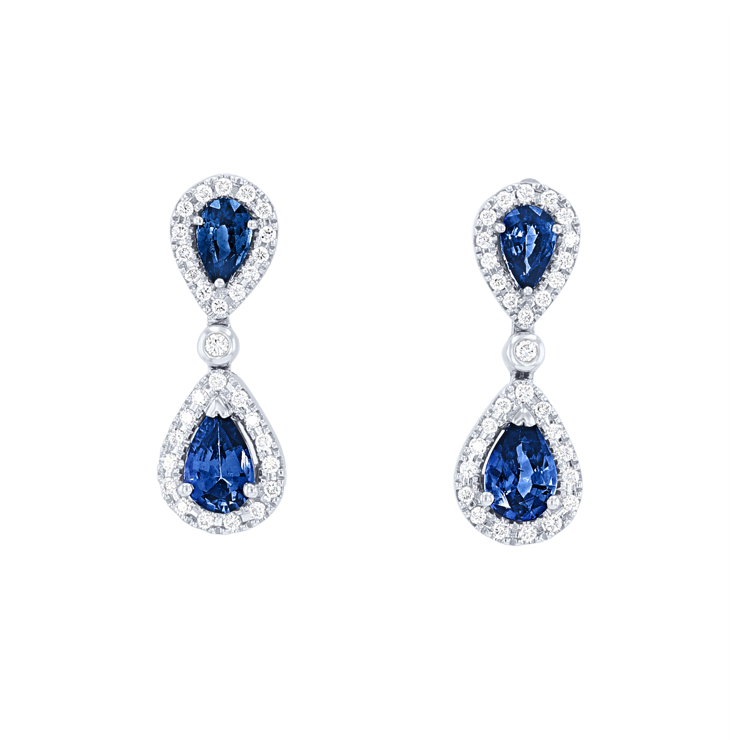 Product Description These striking drop earrings feature pear shape blue sapphires totaling 1.56 carats surrounded by halos of round brilliant cut diamonds totaling 0.25 carats. Other Details Total Setting Diamond Carat Weight: 0.25TW Metal Color: White Gold Women Wedding Band Type: Gemstone Earring Type: Gemstones Type: Earrings Total Gemstone Carat Weight: 1.56TW Gemstone Type: Sapphire Disable Reason: None Style: Contemporary