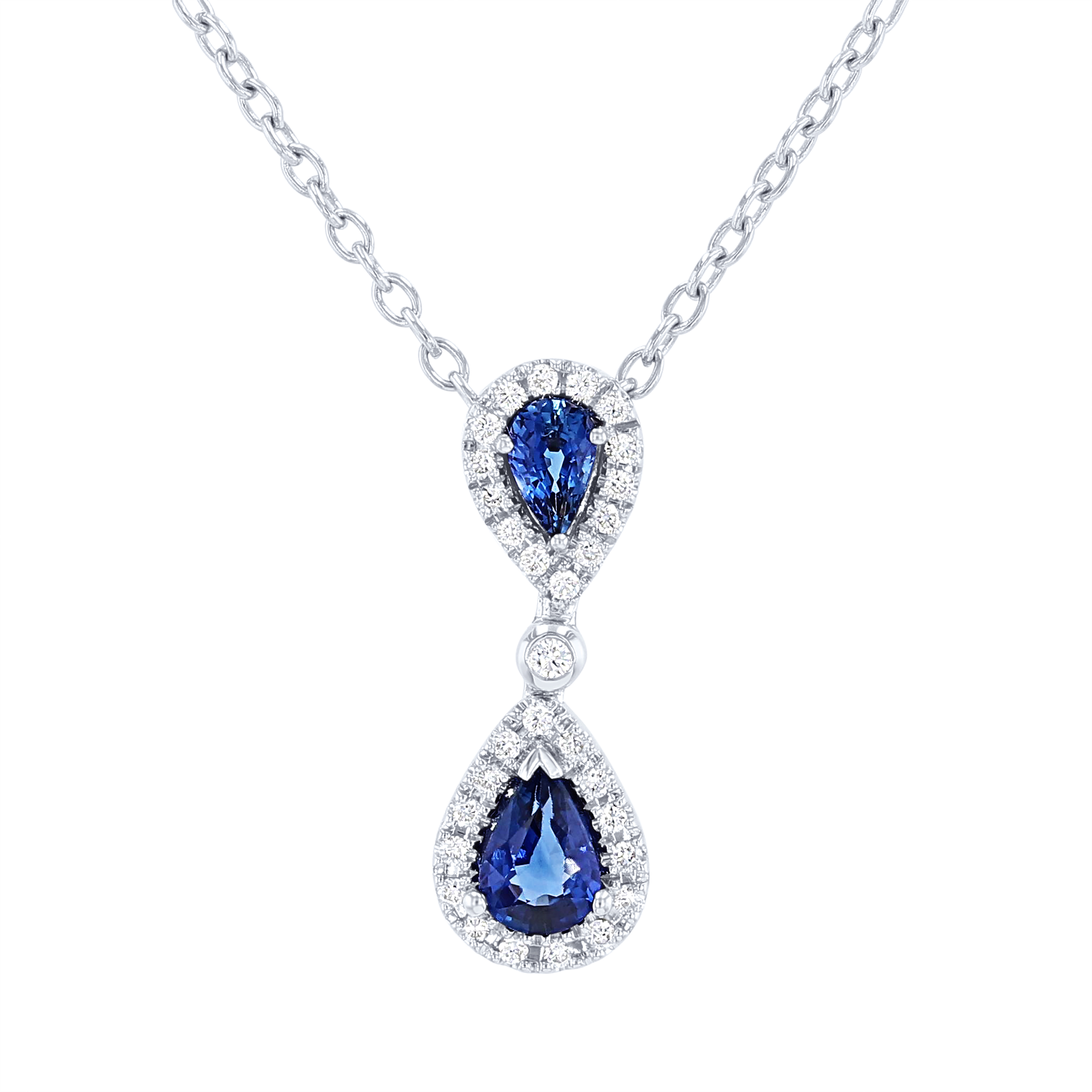Product Description Two stunning pear shape blue sapphires totaling 0.78 carats are surrounded by halos of round brilliant cut diamonds totaling 0.16 carats. Other Details Length: 18 IN Total Gemstone Carat Weight: 0.78TW Total Setting Diamond Carat Weight: 0.16TW Style: Contemporary Necklace Type: Fashion Type: Necklace Disable Reason: None Gemstone Type: Sapphire Metal Color: White Gold Pendant Type: Gemstone