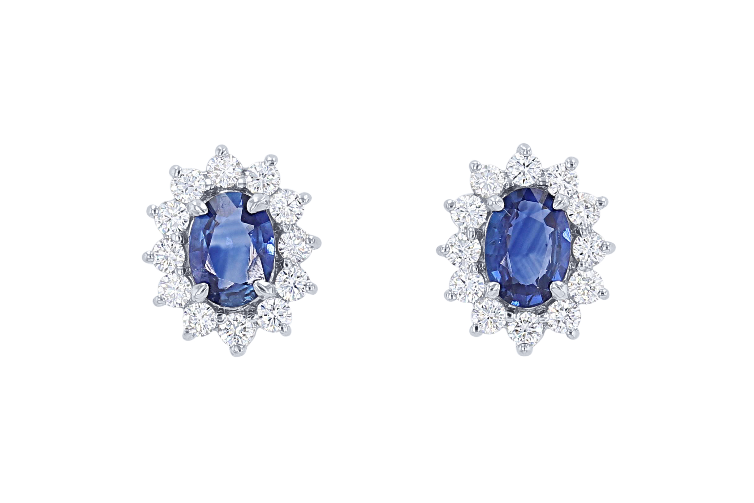 Product Description Elegant and timeless, these earrings feature two oval cut blue sapphires totaling 1.64 carats surrounded by halos of round brilliant cut diamonds totaling 0.67 carats. Other Details Total Gemstone Carat Weight: 1.64TW Women Wedding Band Type: Gemstone Disable Reason: None Style: Classic Total Setting Diamond Carat Weight: 0.67TW Earring Type: Gemstones Metal Color: White Gold Gemstone Type: Sapphire Type: Earrings