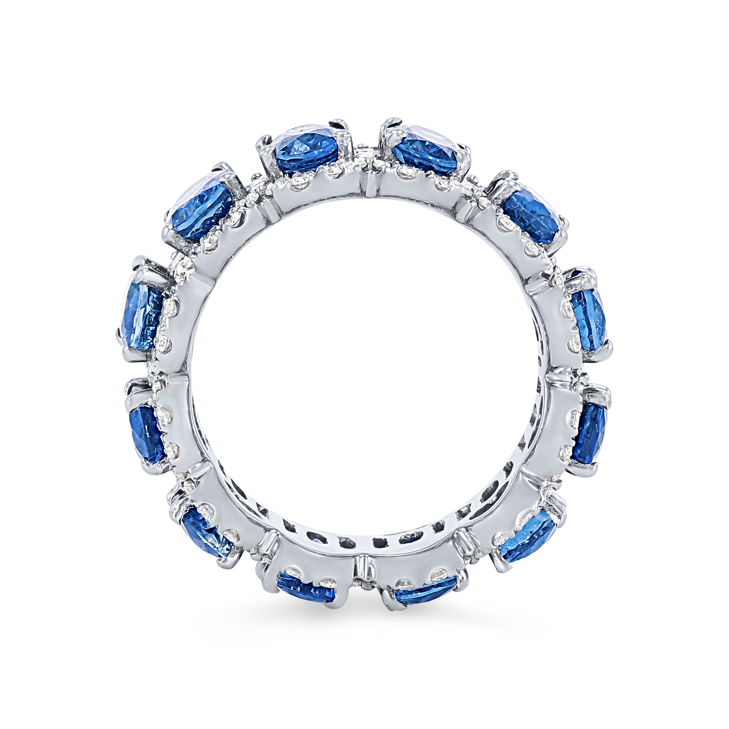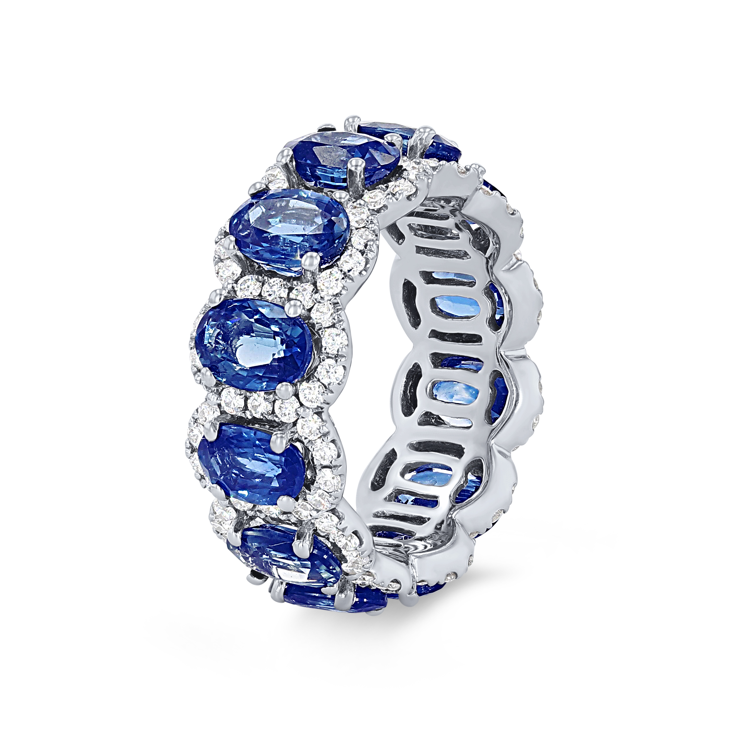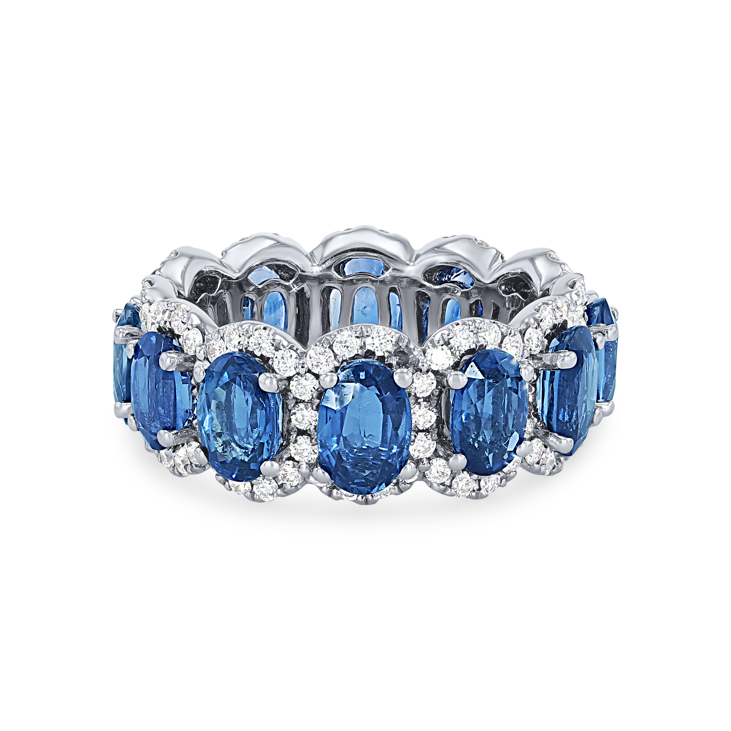 Product Description A gorgeous piece that is sure to make a statement, this eternity band features 7.70 carats of blue sapphires surrounded by a halo of 1.08 carats of round brilliant cut diamonds. Other Details Gemstone Type: Sapphire Women Wedding Band Type: Gemstone Metal Color: White Gold Total Setting Diamond Carat Weight: 1.08TW Disable Reason: None Total Gemstone Carat Weight: 7.7TW Style: Contemporary Metal Color: Platinum Type: Ring