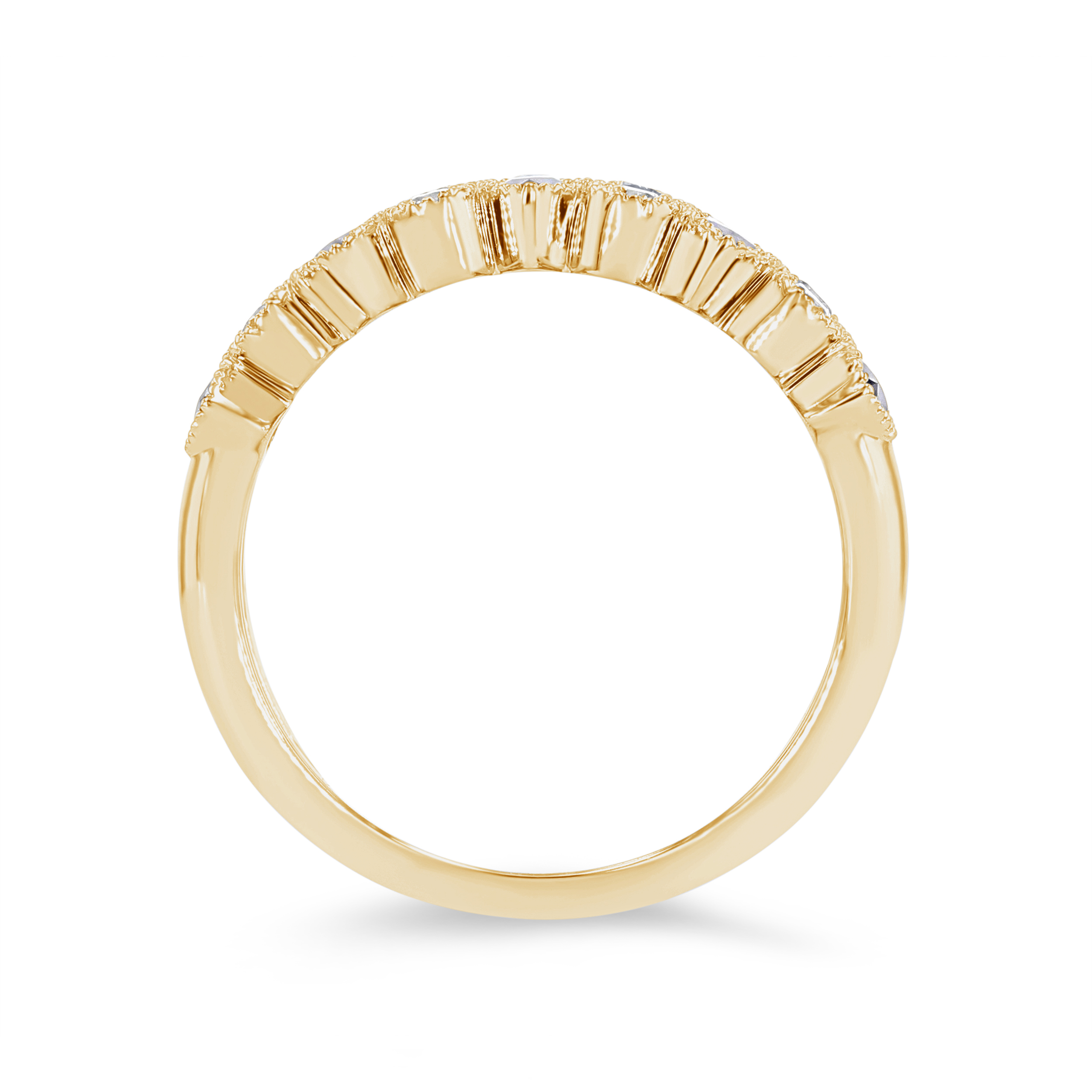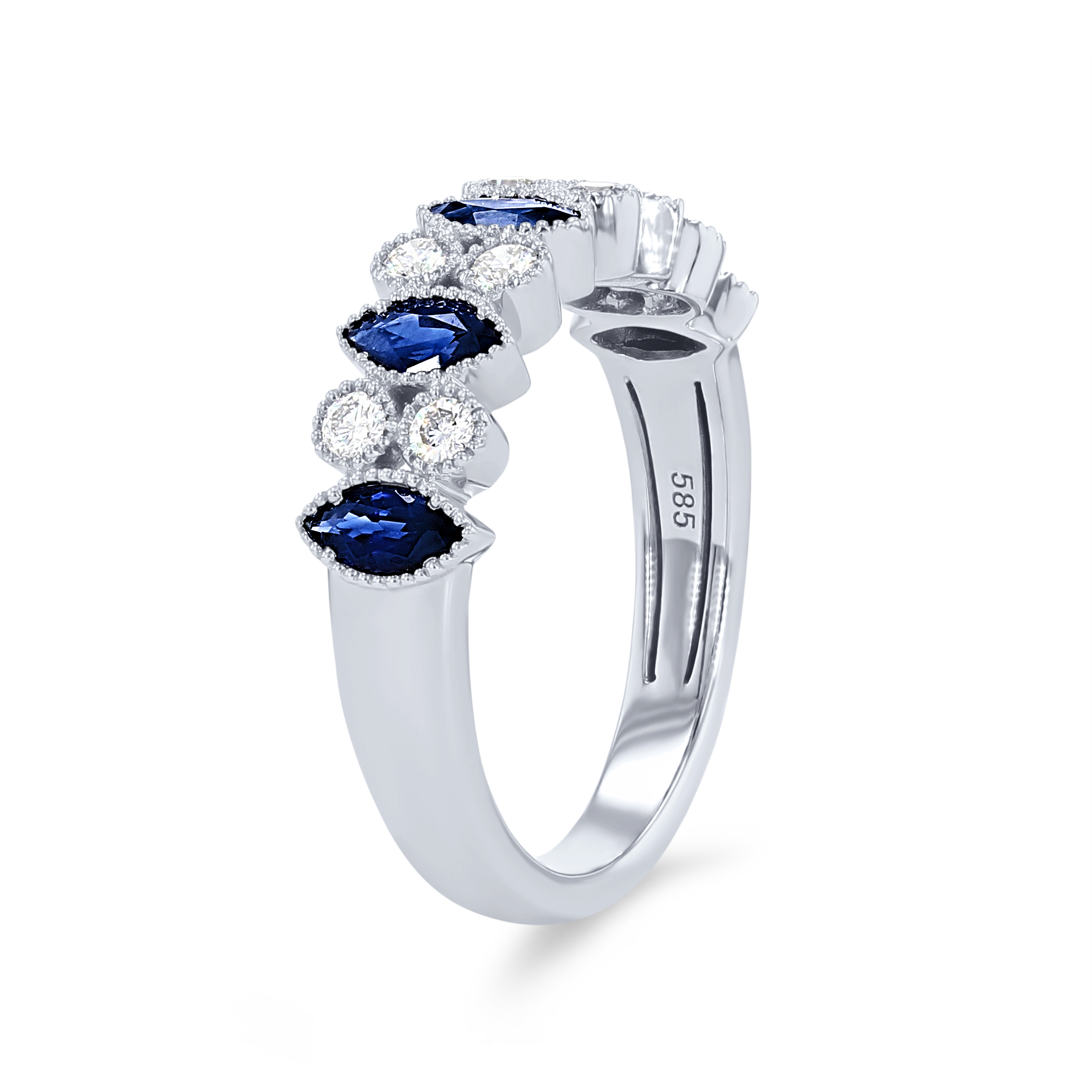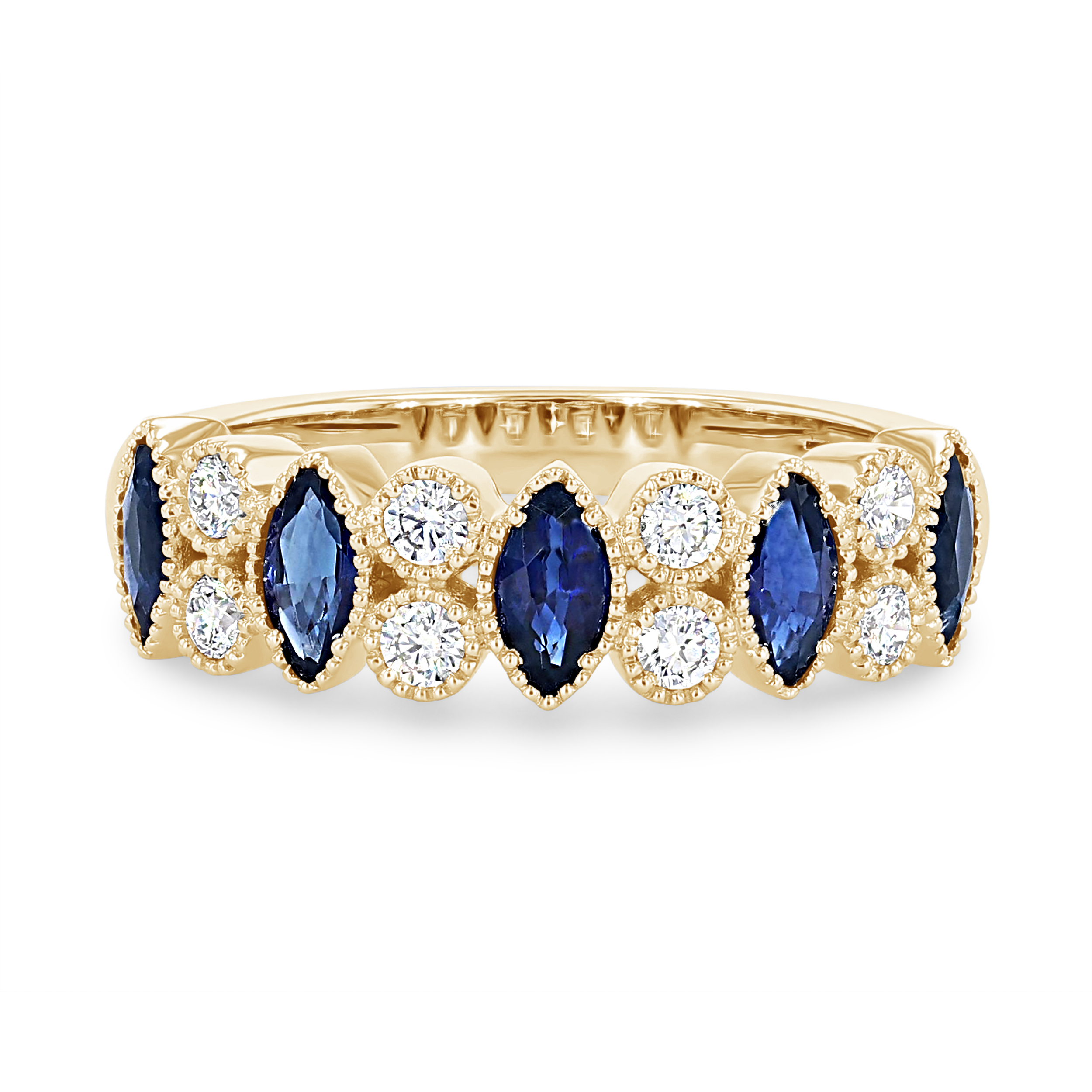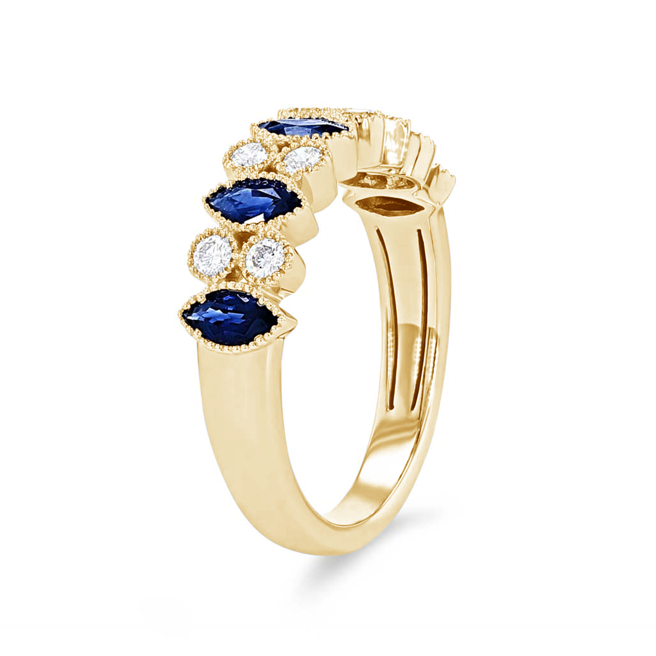 This band features alternating blue sapphires totaling 0.74 carats and round brilliant cut diamonds totaling 0.23 carats. Milgrain detail frames the bezel setting for a vintage touch.