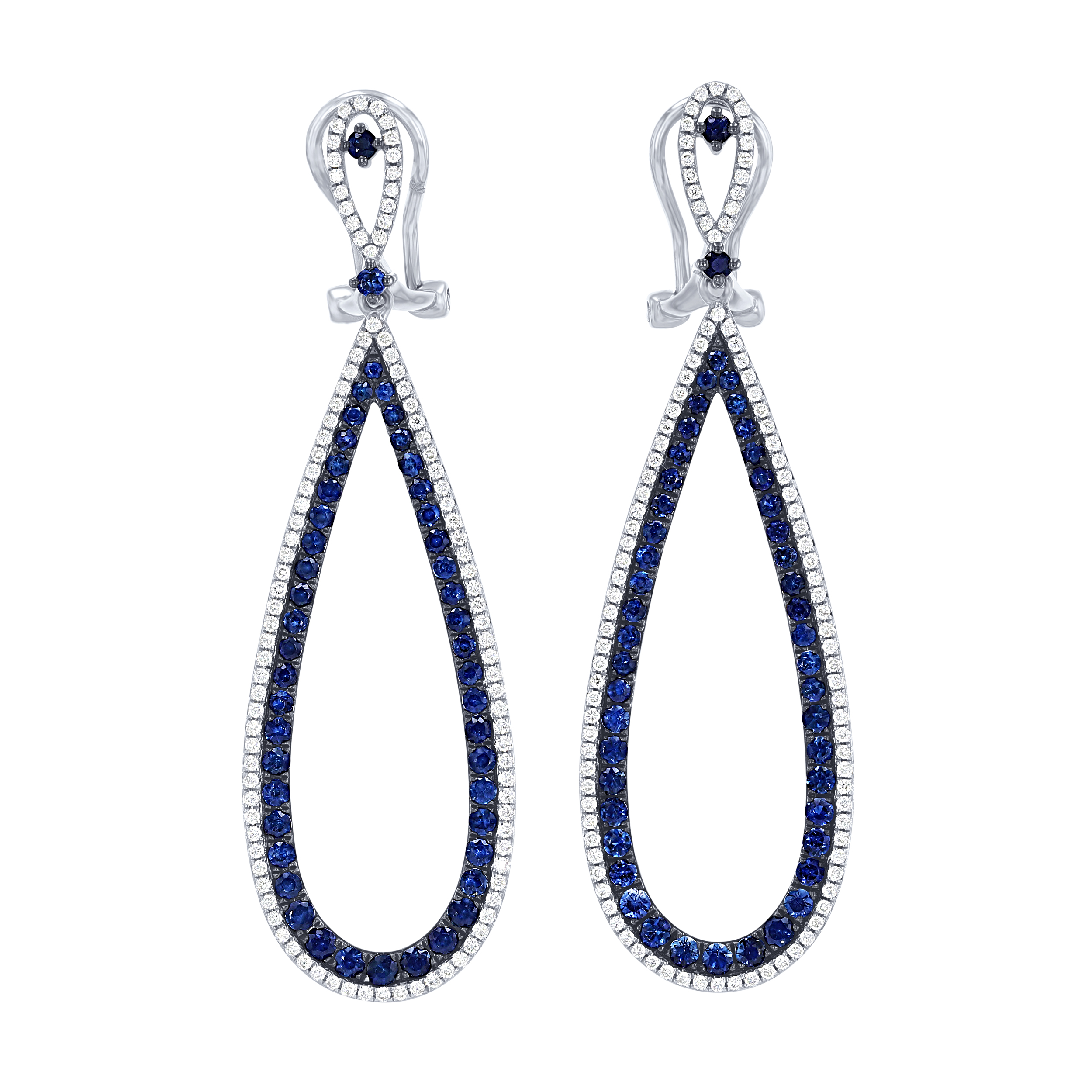 Product Description Make a statement with these unique open teardrop earrings, featuring 1.80 carats of blue sapphires and 0.62 carats of round brilliant cut diamonds. Other Details Style: Contemporary Type: Earrings Disable Reason: None Total Setting Diamond Carat Weight: 0.62TW Earring Type: Dangle Gemstone Type: Blue Sapphire